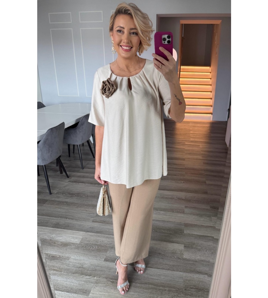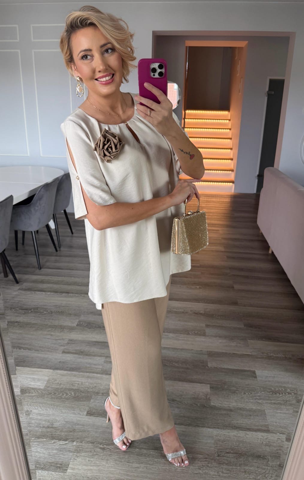 Stylowy komplet w odcieniu beżowym to doskonały wybór na każdą okazję – od codziennych wyjść, przez spotkania ze znajomymi, aż po bardziej eleganckie stylizacje.