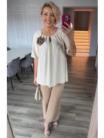Tunika o luźnym, lekko oversize’owym kroju zapewnia swobodę ruchów i komfort noszenia. Delikatny materiał miękko układa się na sylwetce, subtelnie ją podkreślając. Dekolt w serek oraz rozcięcia po bokach dodają całości lekkości i nowoczesnego charakteru.