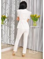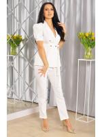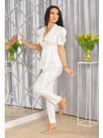Komplet składa się ze spodni i marynarki, która posiada krótki rękawek i ozdobne bufki. Model idealnie nadaje się na wszelkiego rodzaju spotkania biznesowe czy rodzinne uroczystości. Wiązana marynarka, świetnie podkreśla talię. Garnitur idealnie współgra ze szpilkami oraz wizytową torebką!