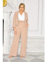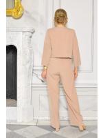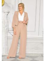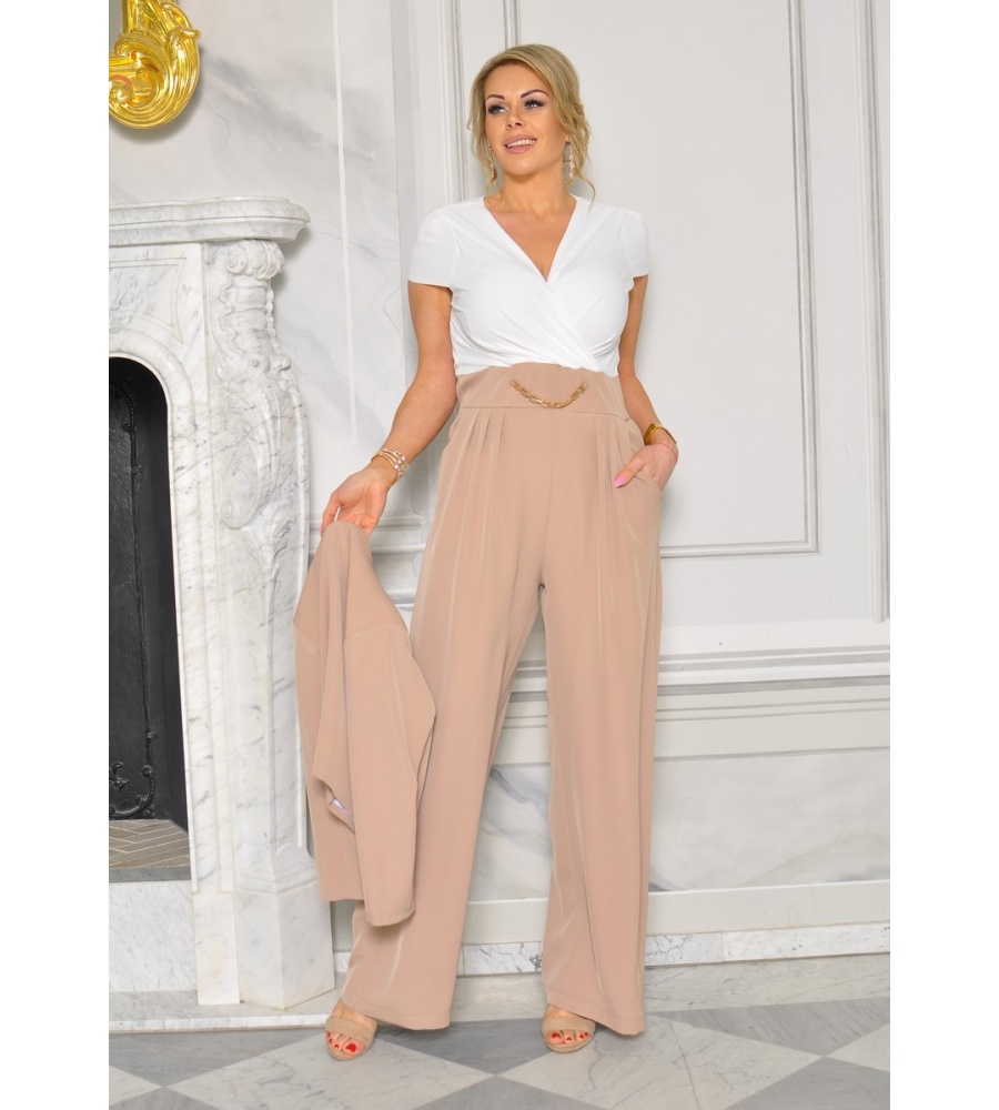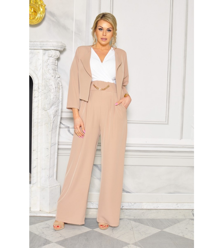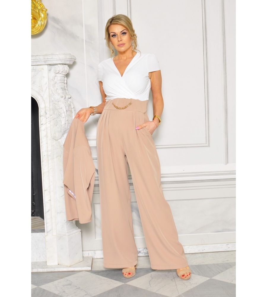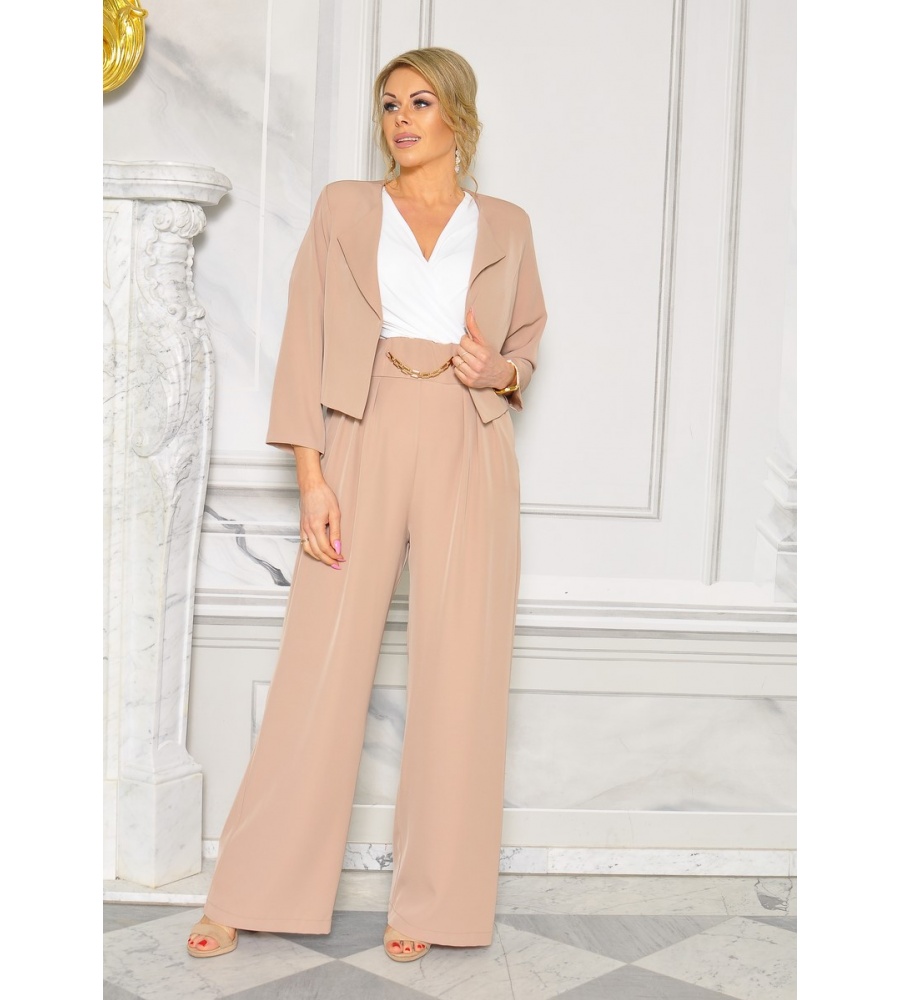 Subtelna elegancja i nowoczesna klasyka – tak w skrócie można opisać tę stylizację, idealną na uroczystość Pierwszej Komunii Świętej. Beżowy kombinezon zachwyca prostotą kroju i doskonałym dopasowaniem – podkreśla sylwetkę, a jednocześnie zapewnia komfort noszenia przez cały dzień.Całość uzupełniają złote dodatki: subtelna biżuteria i mała torebka na łańcuszku. Na nogach klasyczne czółenka w kolorze nude, które optycznie wydłużają nogi i idealnie dopełniają look.