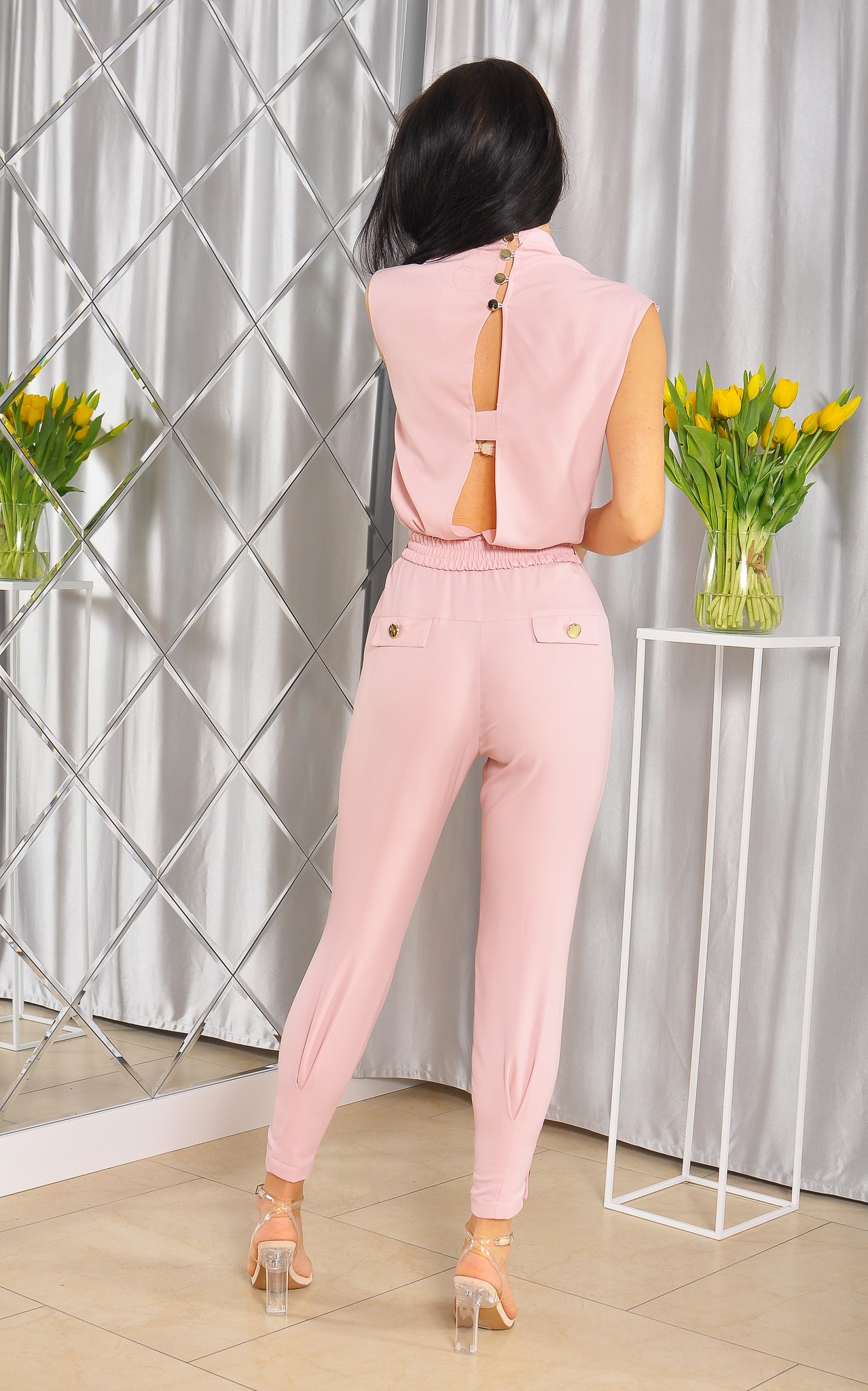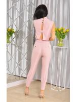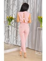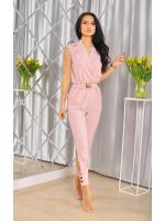 Kombinezon z dekoltem V w kolorze brudnego różu ze złotymi guzikami. Model posiada również elegancki pasek, który dodatkowo zdobi całość oraz prześliczne złote guziki.