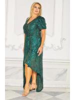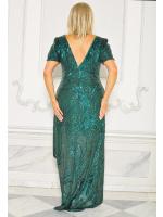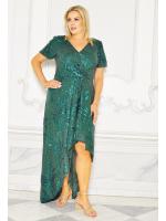 Zielona asymetryczna sukienka maxi pokryta w całości cekinami, które pięknie się mienią w słońcu. Model posiada ciekawy motyw liści na całej długości sukienki. Dekolt w kształcie literki V pięknie uwydatni biust, a asymetryczny przód sukienki podkreśli kobiece atuty. Wykonana z wysokiej jakości materiału. Idealnie sprawdzi się na imprezy okolicznościowe.