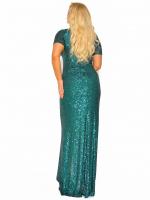 Efektowna maxi sukienka z rękawkiem wyszywana cekinami w kolorze butelkowej zieleni. Spódnica przedkładana na elastycznej podszewce. Ozdobna aplikacja po boku wyszczupla talię marszcząc materiał. Dekolt kopertowy na wzór kołnierza. Aplikacja ze srebrnymi diamentami.