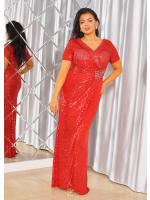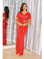Efektowna maxi sukienka z rękawkiem wyszywana cekinami w kolorze czerwonym. Spódnica przedkładana na elastycznej podszewce. Ozdobna aplikacja po boku wyszczupla talię marszcząc materiał. Dekolt kopertowy na wzór kołnierza. Aplikacja ze srebrnymi diamentami.