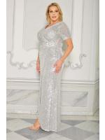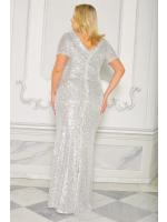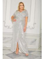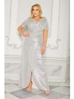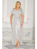 Efektowna maxi sukienka z rękawkiem wyszywana cekinami w kolorze srebrnym. Spódnica przedkładana na elastycznej podszewce. Ozdobna aplikacja po boku wyszczupla talię marszcząc materiał. Dekolt kopertowy na wzór kołnierza. Aplikacja ze srebrnymi diamentami.