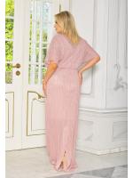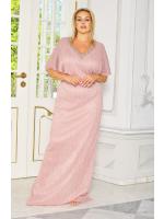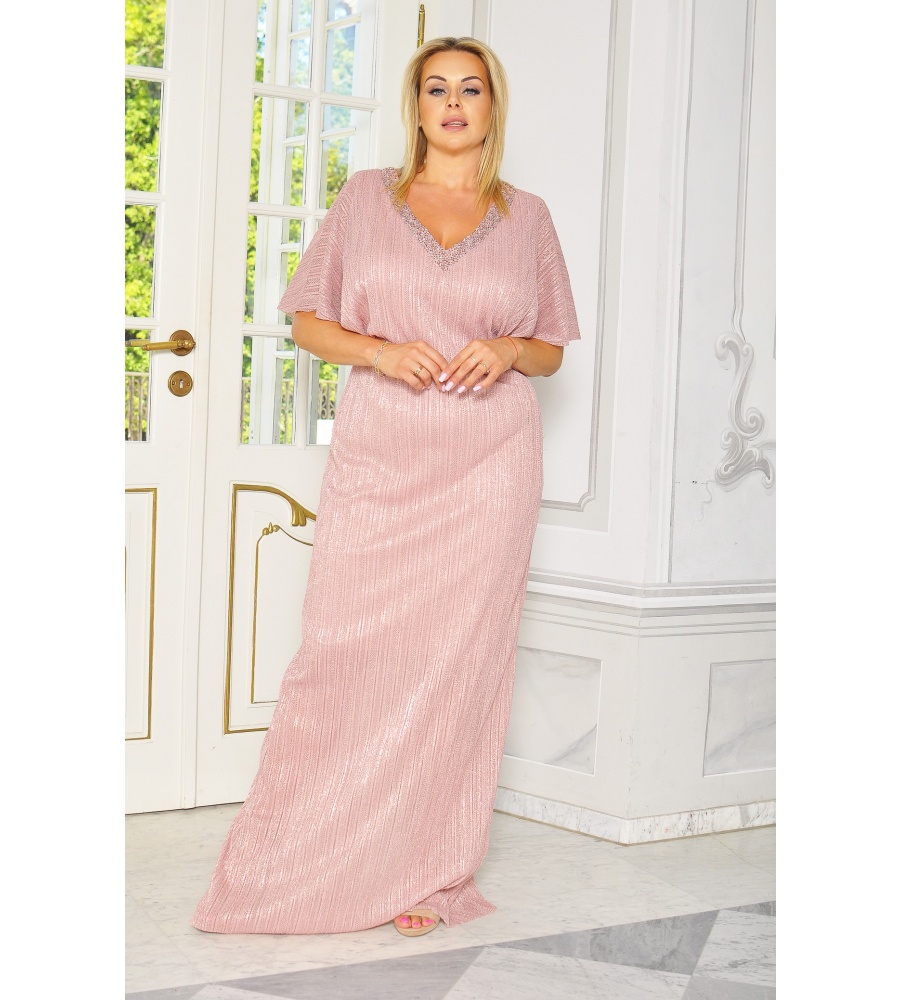Piękna bogato zdobiona sukienka w kolorze pudrowego różu, zdobiona przy dekolcie z rękawem o długości 3/4. Materiał sukienki wykonany z wysokiej jakości materiału.