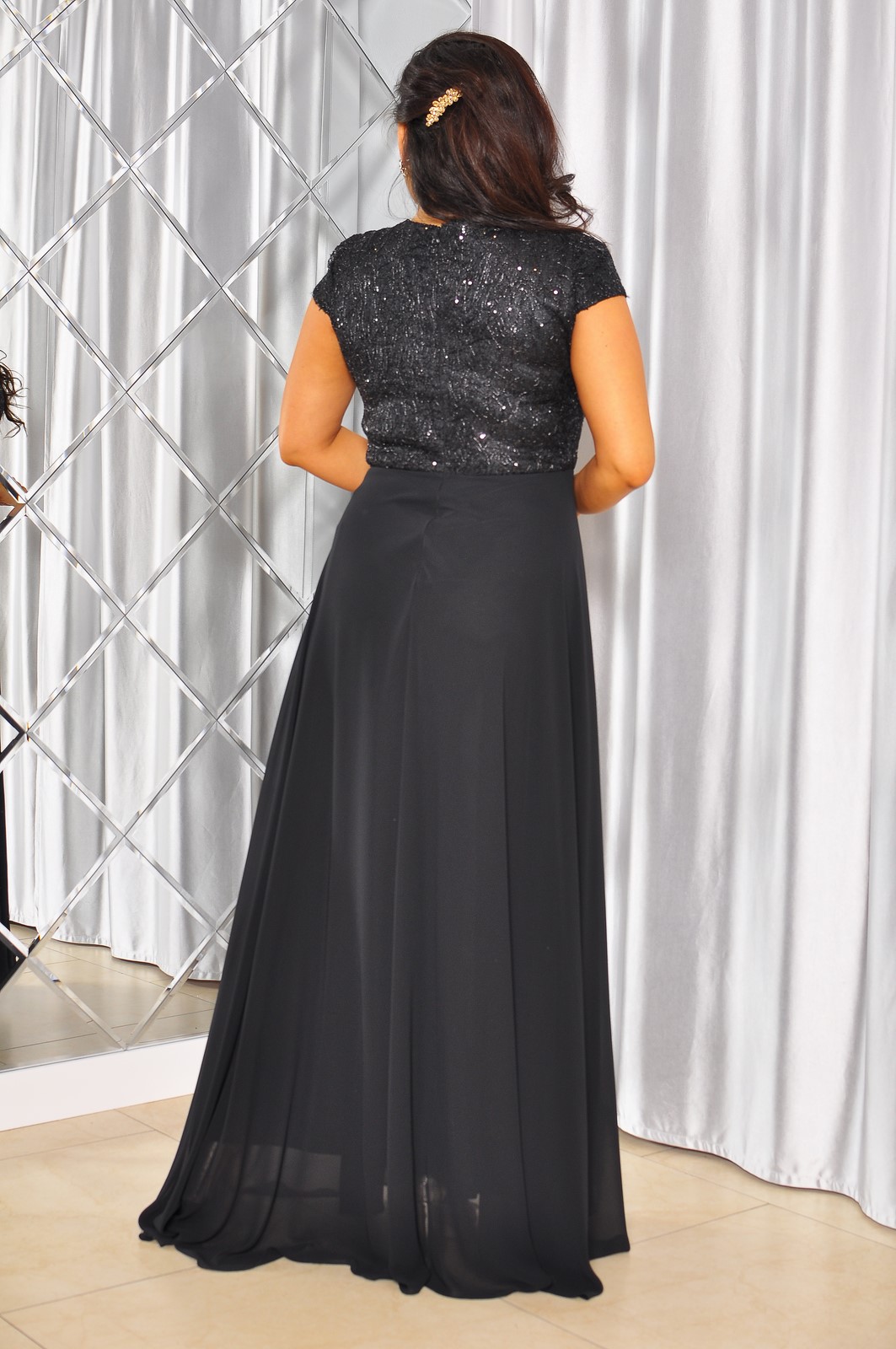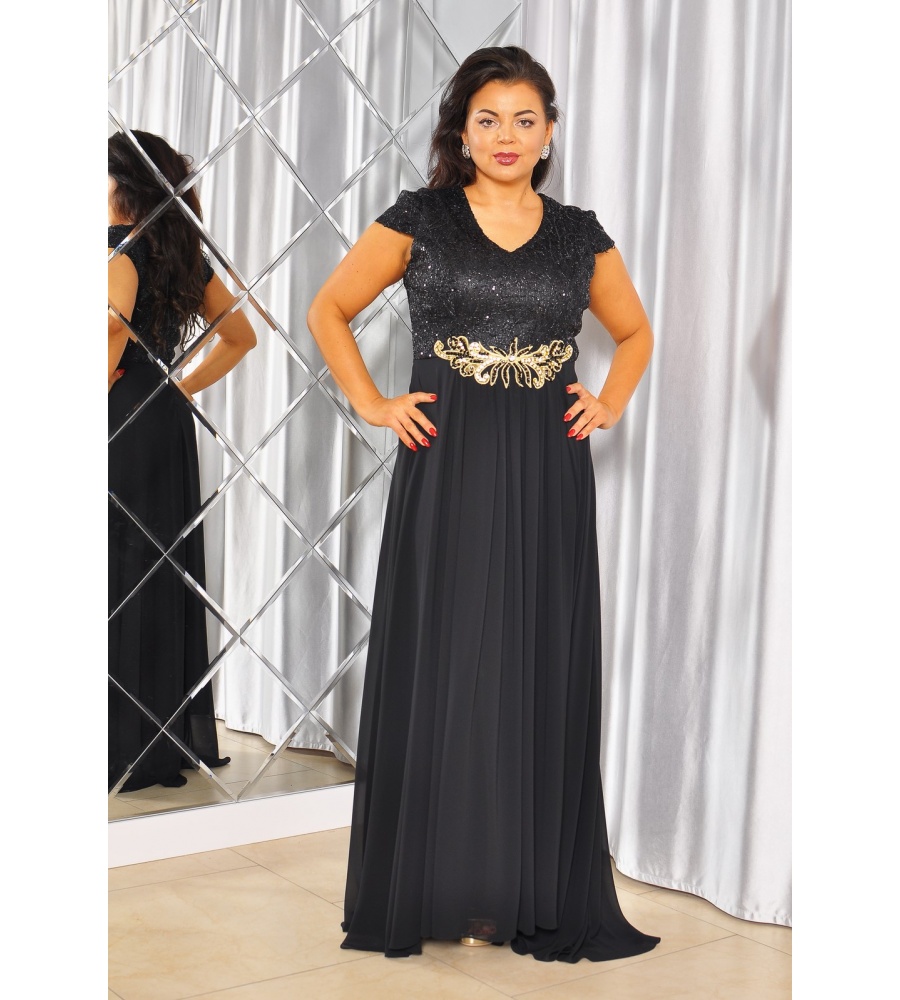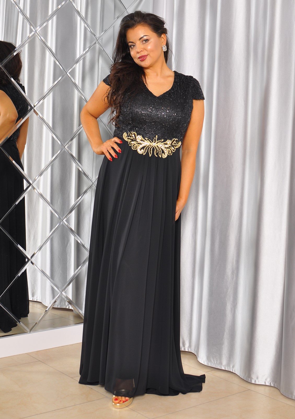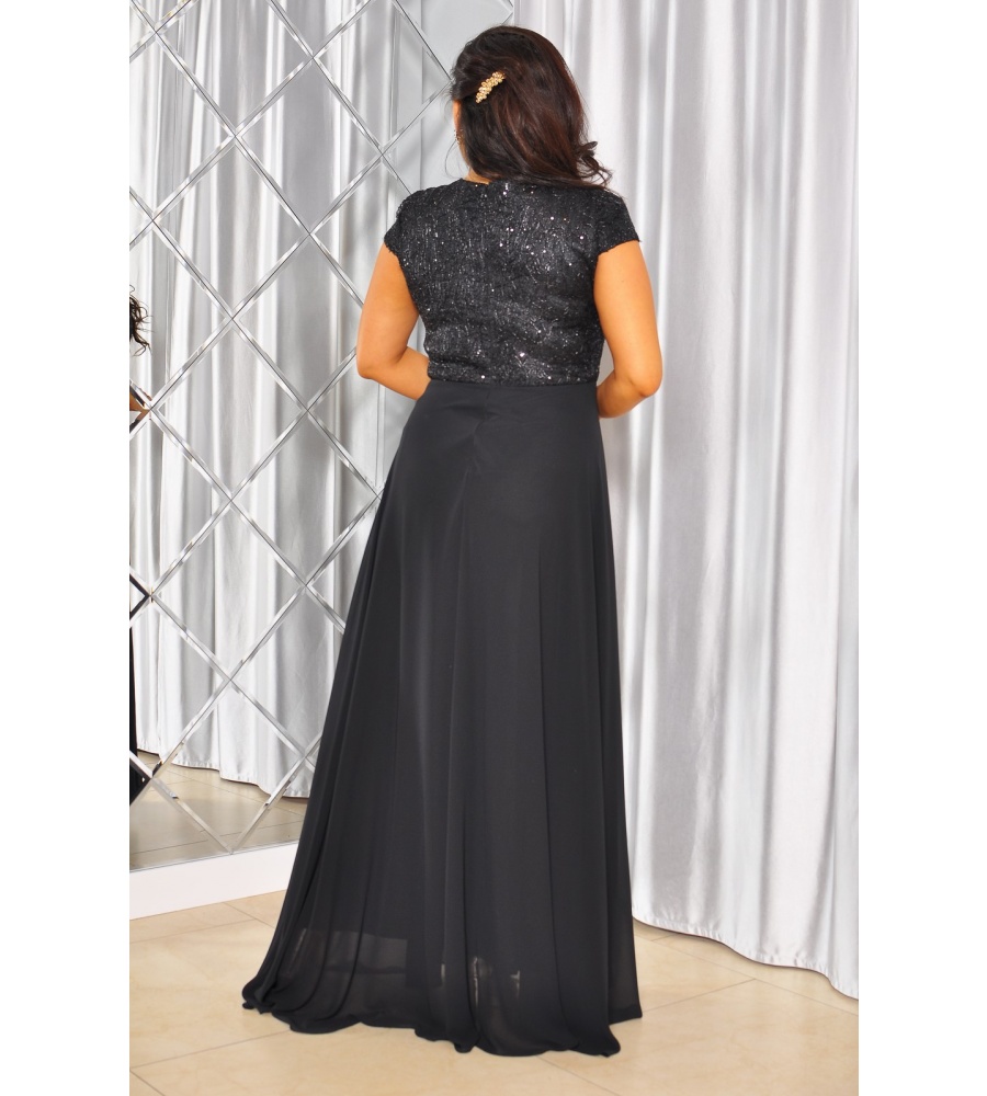 Elegancka czarna sukienka maxi z krótkim rękawkiem i zdobioną górą. Dół na elastycznej podszewce - zwiewny. Model tuszuje niedoskonałości talii. Dekolt V wyciągający optycznie szyję. Całość prezentuje się doskonale na każdą okazję.