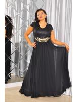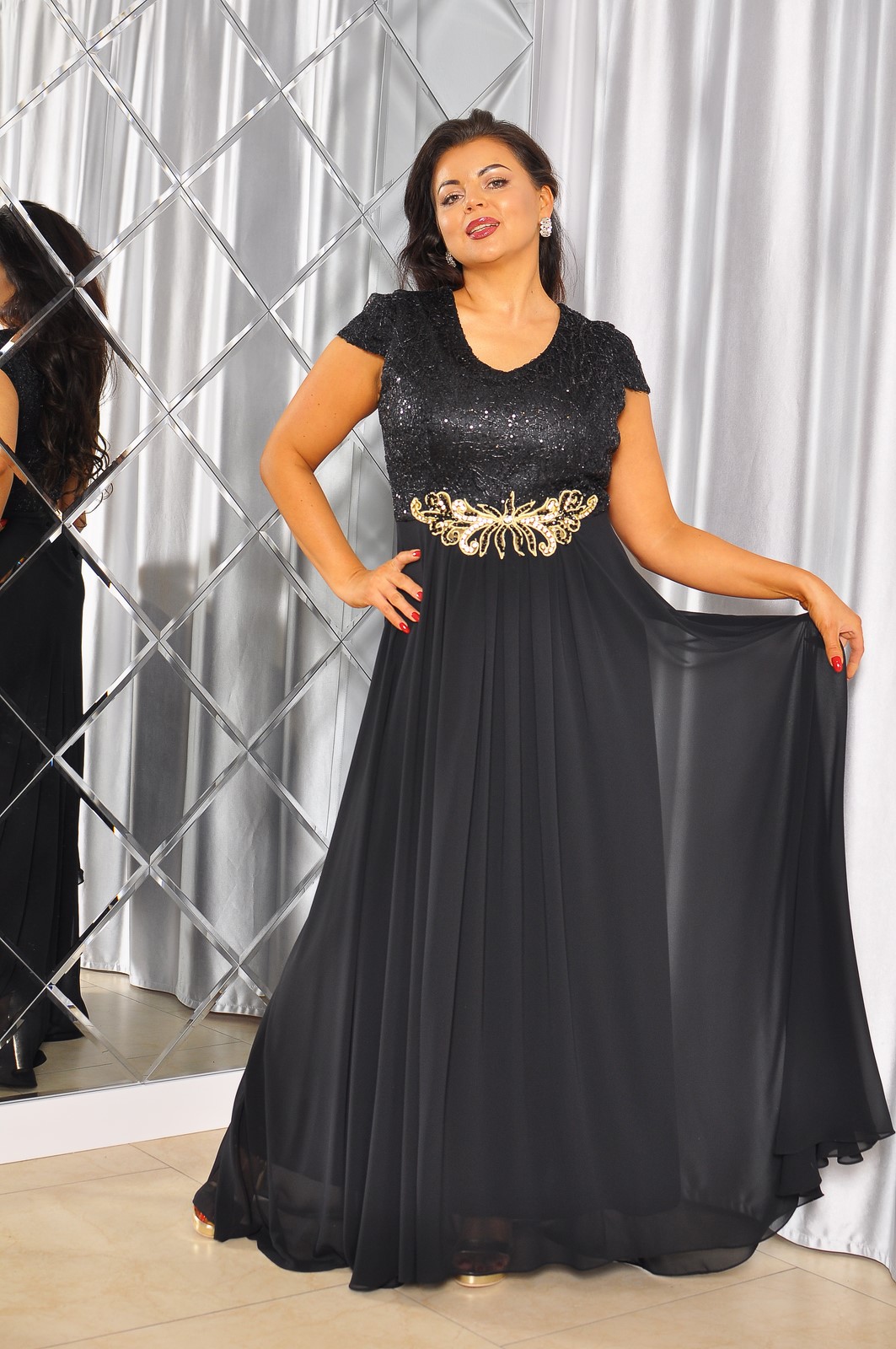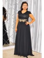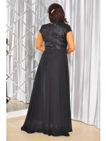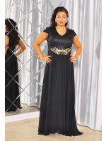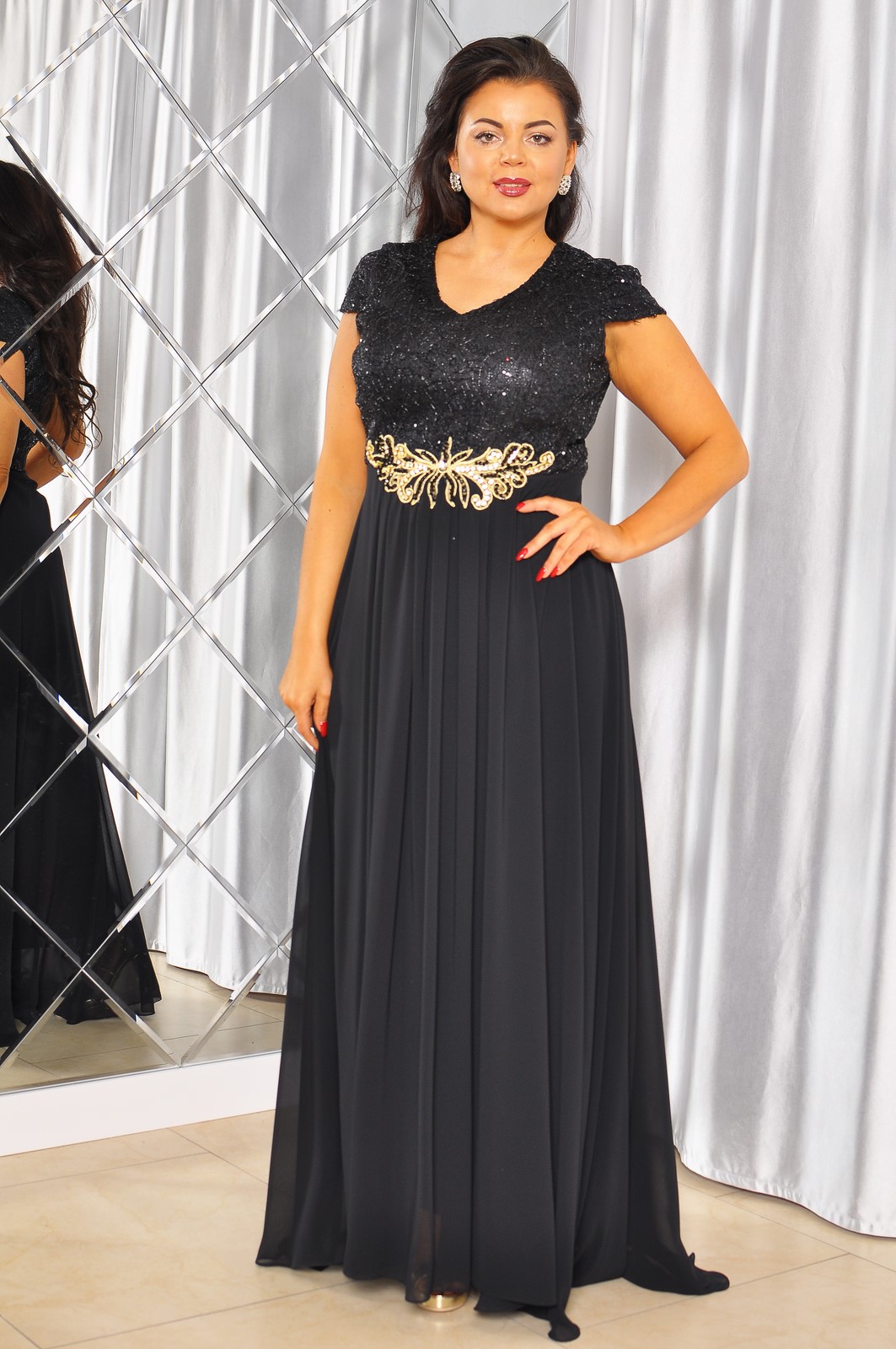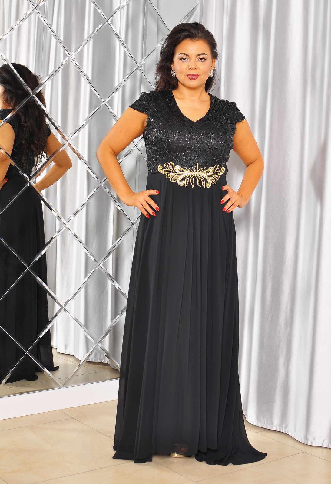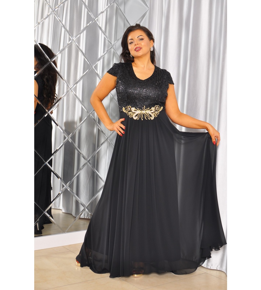 Elegancka czarna sukienka maxi z krótkim rękawkiem i zdobioną górą. Dół na elastycznej podszewce - zwiewny. Model tuszuje niedoskonałości talii. Dekolt V wyciągający optycznie szyję. Całość prezentuje się doskonale na każdą okazję.