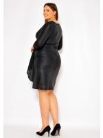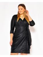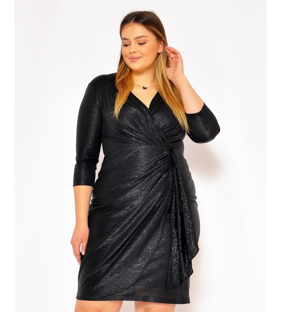 Połyskująca sukienka midi z kopertowym dekoltem uwydatniającym biust. Marszczenie w okolicy talii. Model idealnie tuszuje niedoskonałości figury. Podszewka elastyczna.