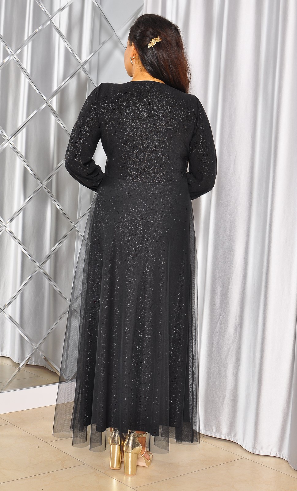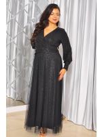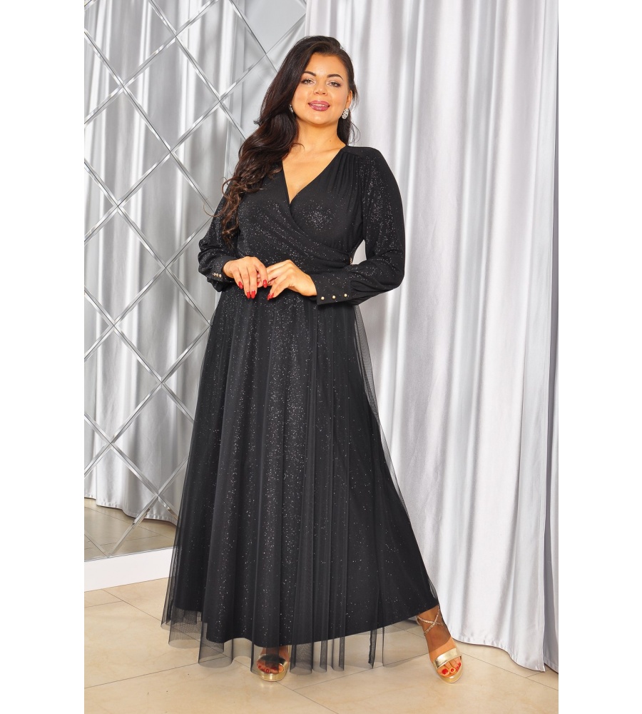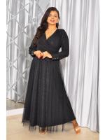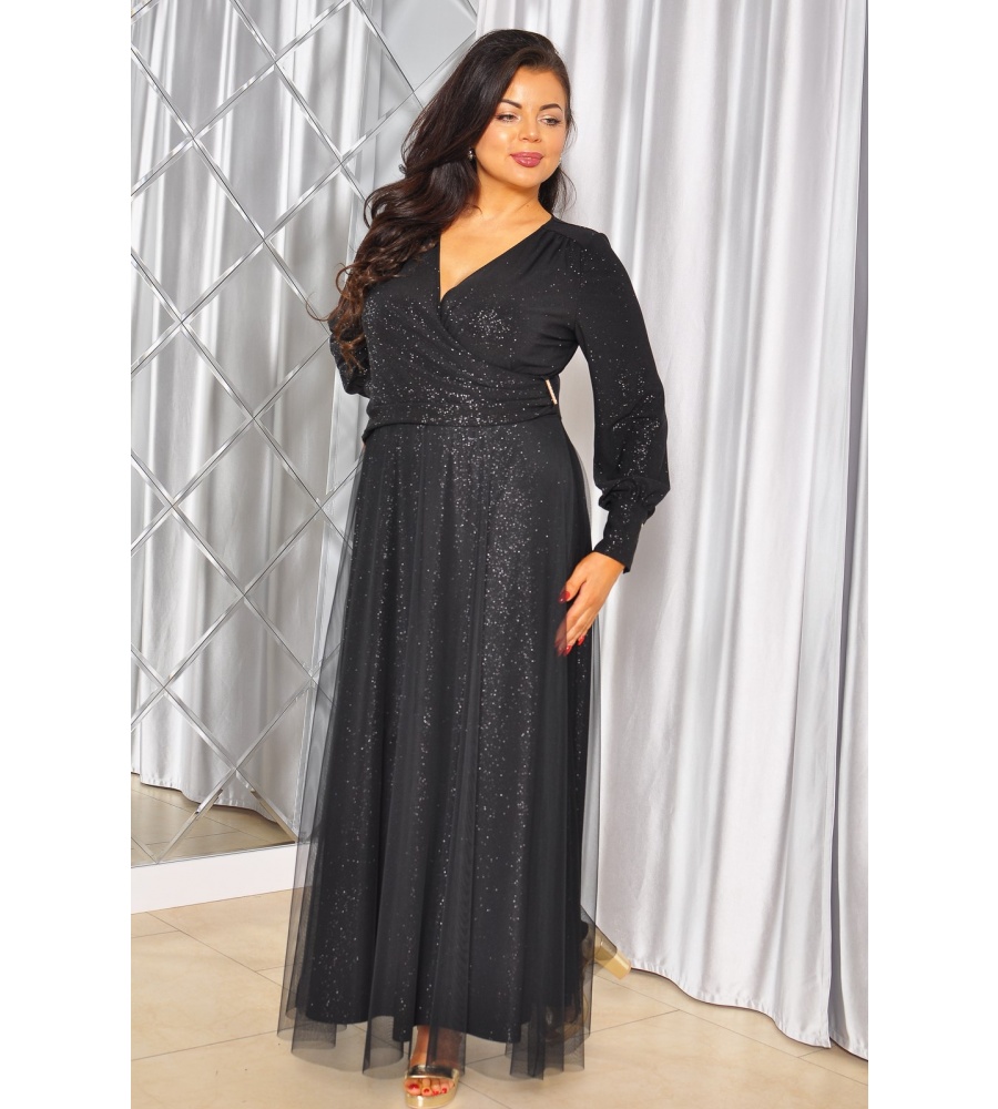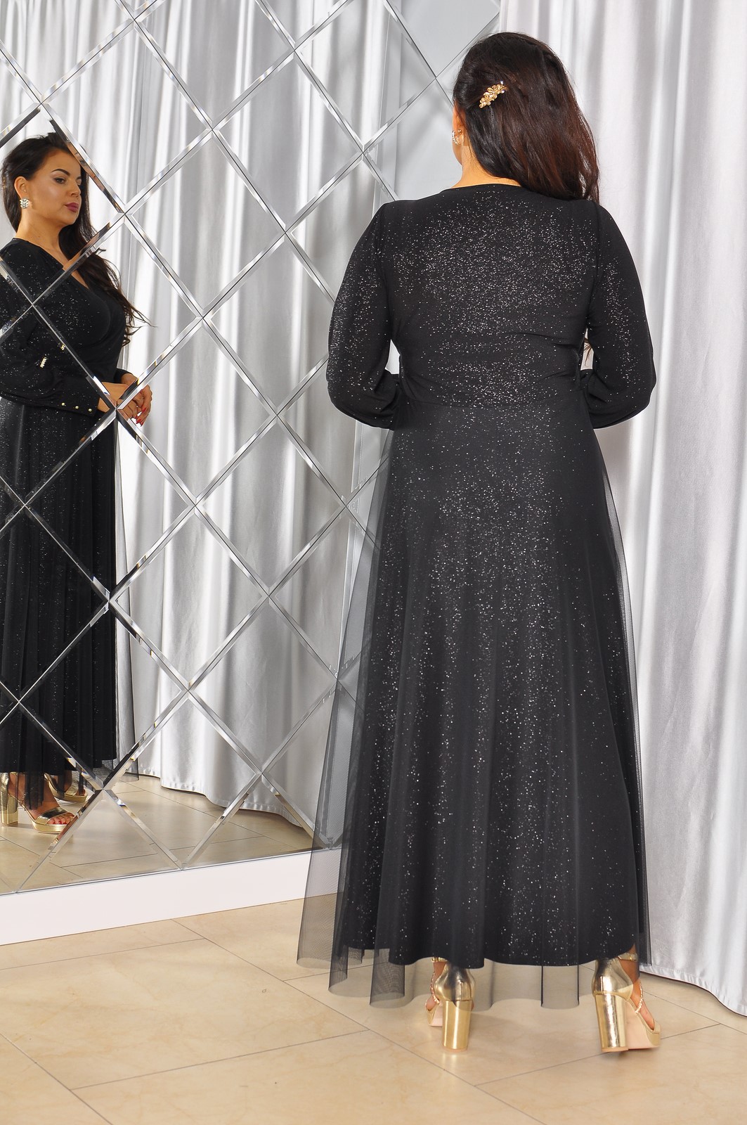Zachwycająca, długa sukienka wieczorowa stworzona dla kobiet, które kochają połączenie blasku i lekkości. Góra sukienki wykonana jest z delikatnie połyskującej, brokatowej tkaniny, która pięknie odbija światło przy każdym ruchu. Długie rękawy dodają elegancji i subtelnie podkreślają sylwetkę, zapewniając jednocześnie komfort i szyk.