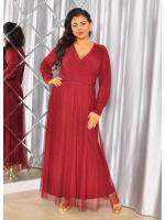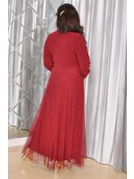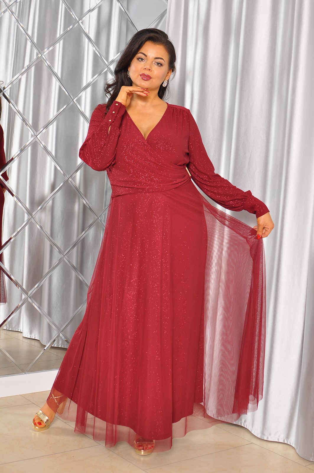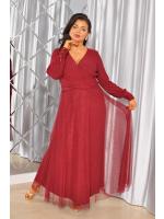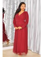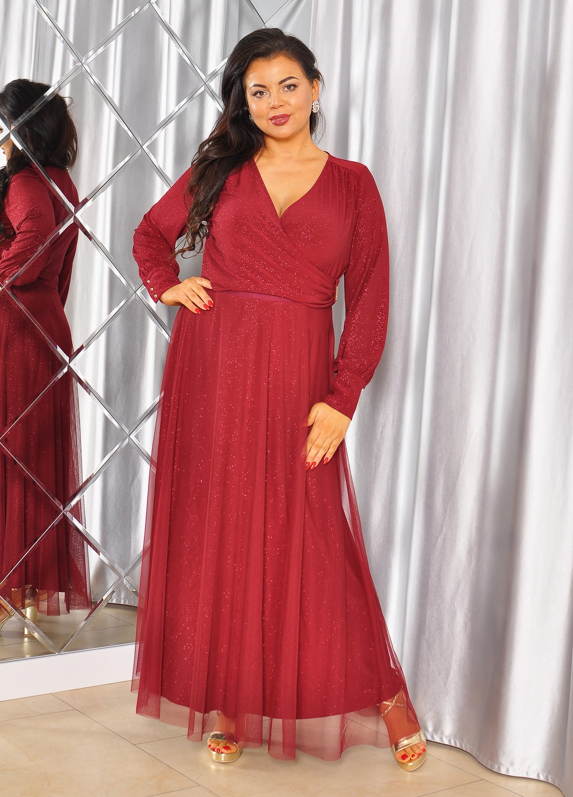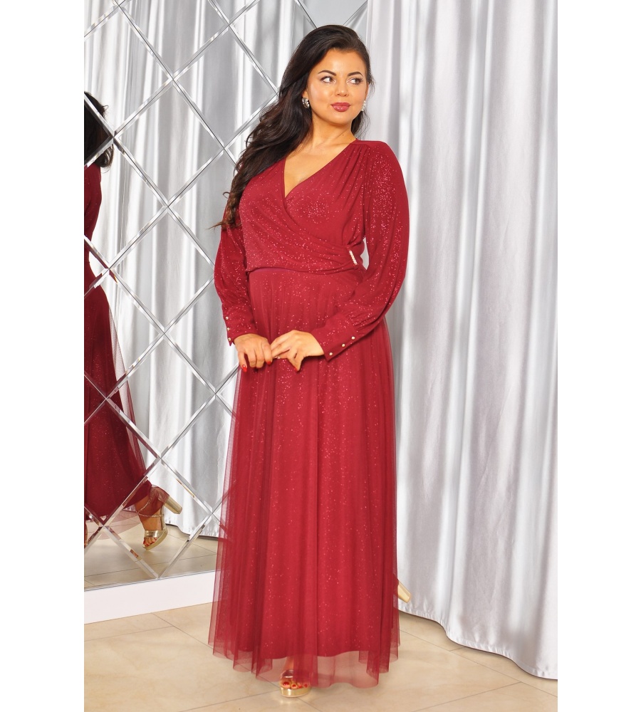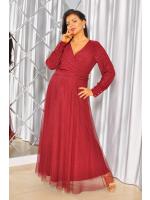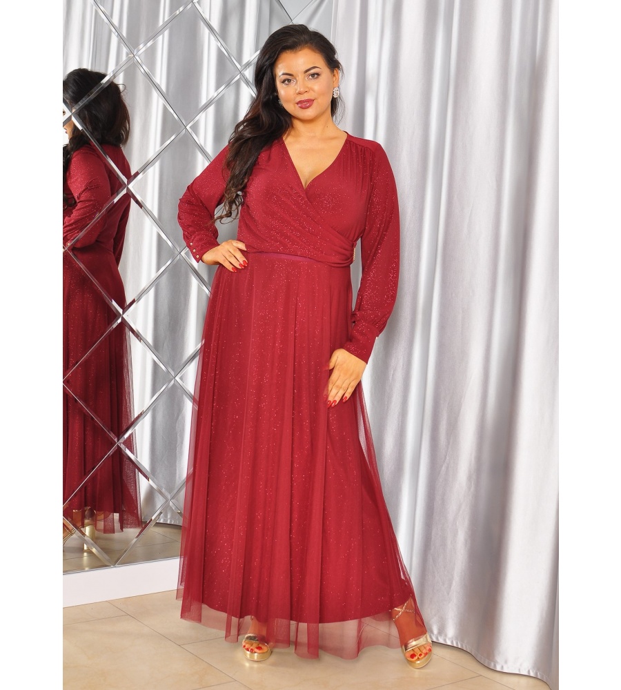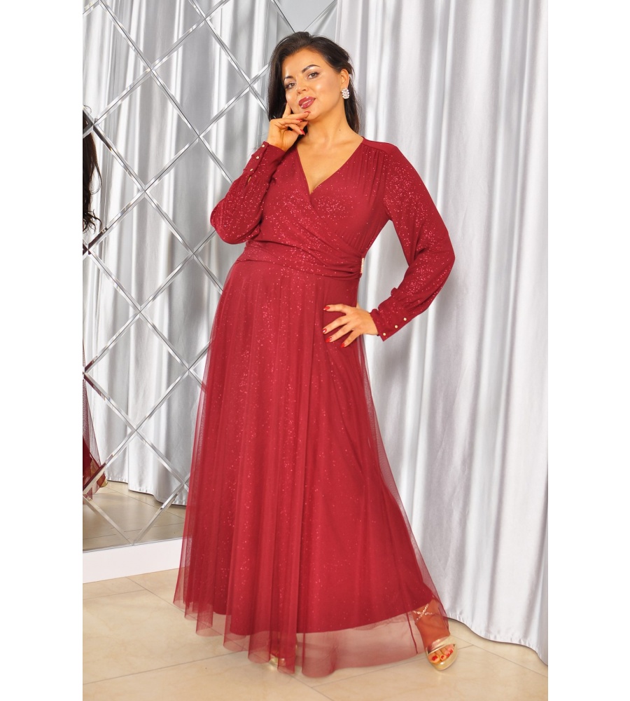 Sukienka maxi pokryta brokatem z długim rękawem i tiulowym dołem w kolorze borowym