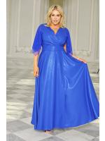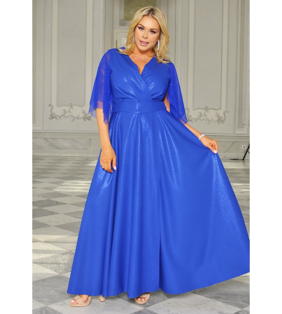 Ta sukienka to niezwykle kobieca długa suknia z szyfonowym rękawkiem, wykonana z delikatnej, swobodnie układającej się tkaniny. Modny fason podkreślający kobiecą sylwetkę. Całość materiału pokryta jest lekkim brokatem dzięki czemu bardzo pięknie mieni się w słońcu.