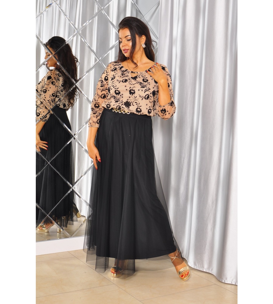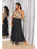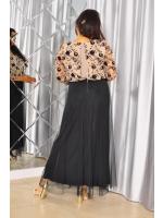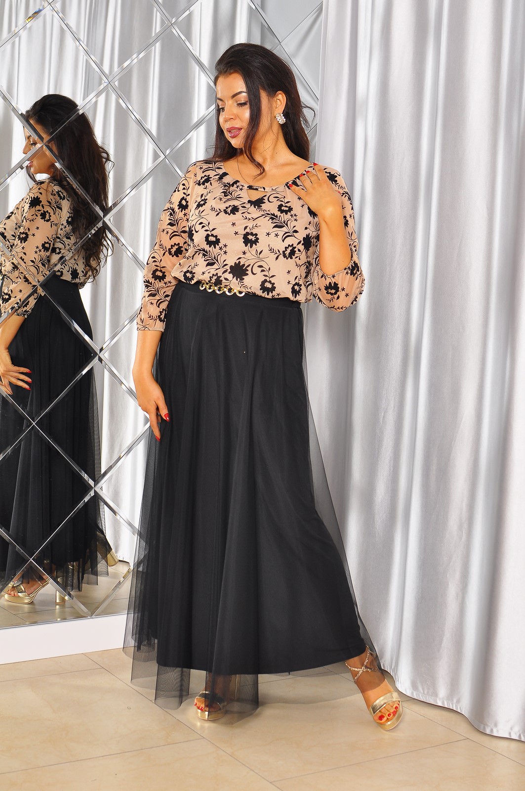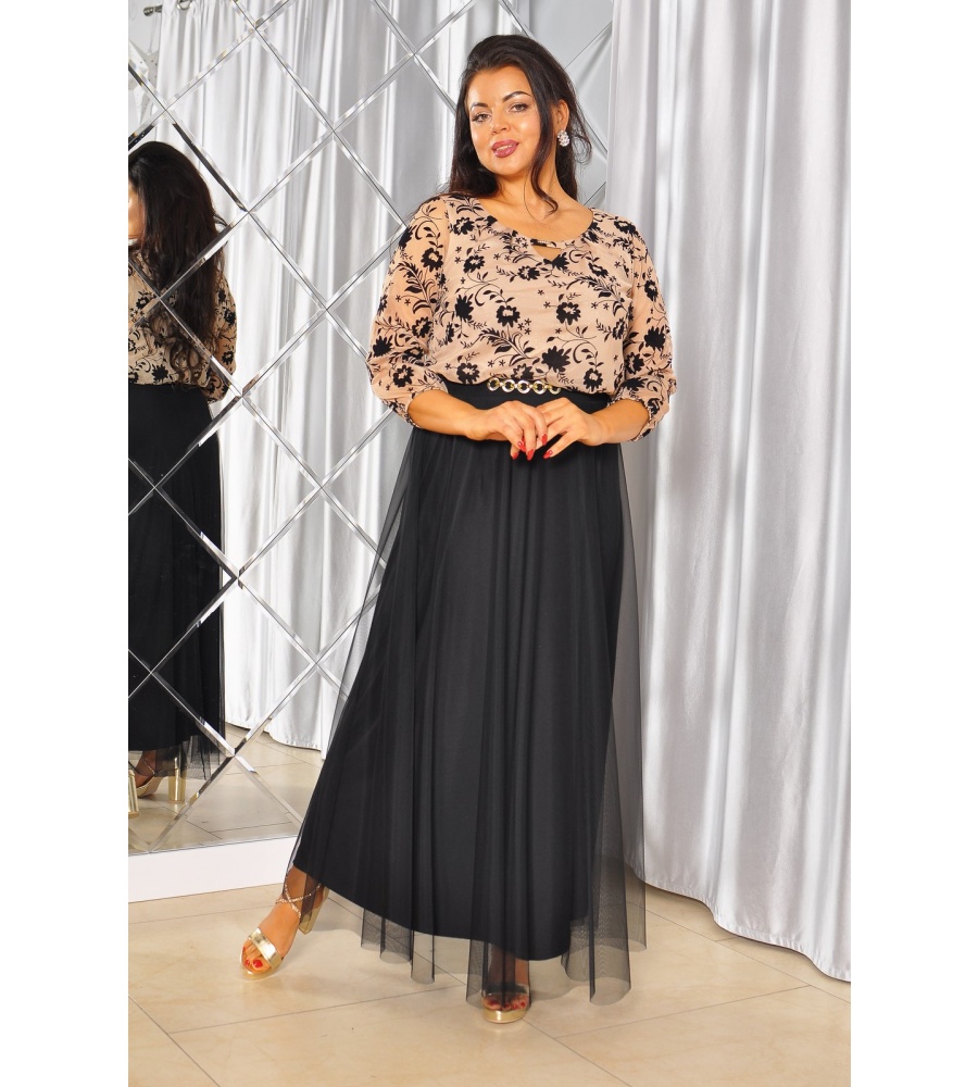 Wyjątkowa sukienka maxi, która zachwyca połączeniem subtelności i głębokiego koloru. Model posiada beżową górę oraz czarną tiulową spódnicę.Tiul nadaje sukience lekkości, a jednocześnie pięknie podkreśla jej elegancki charakter.