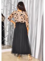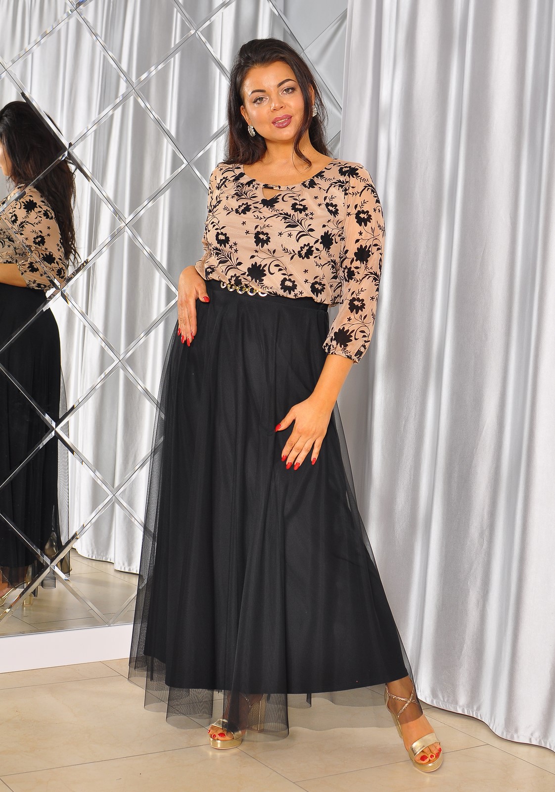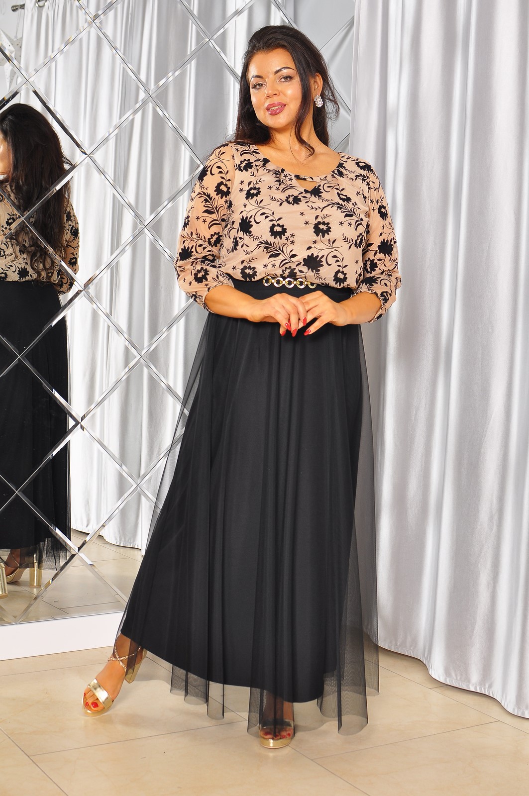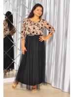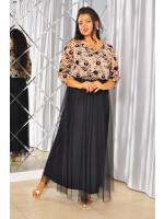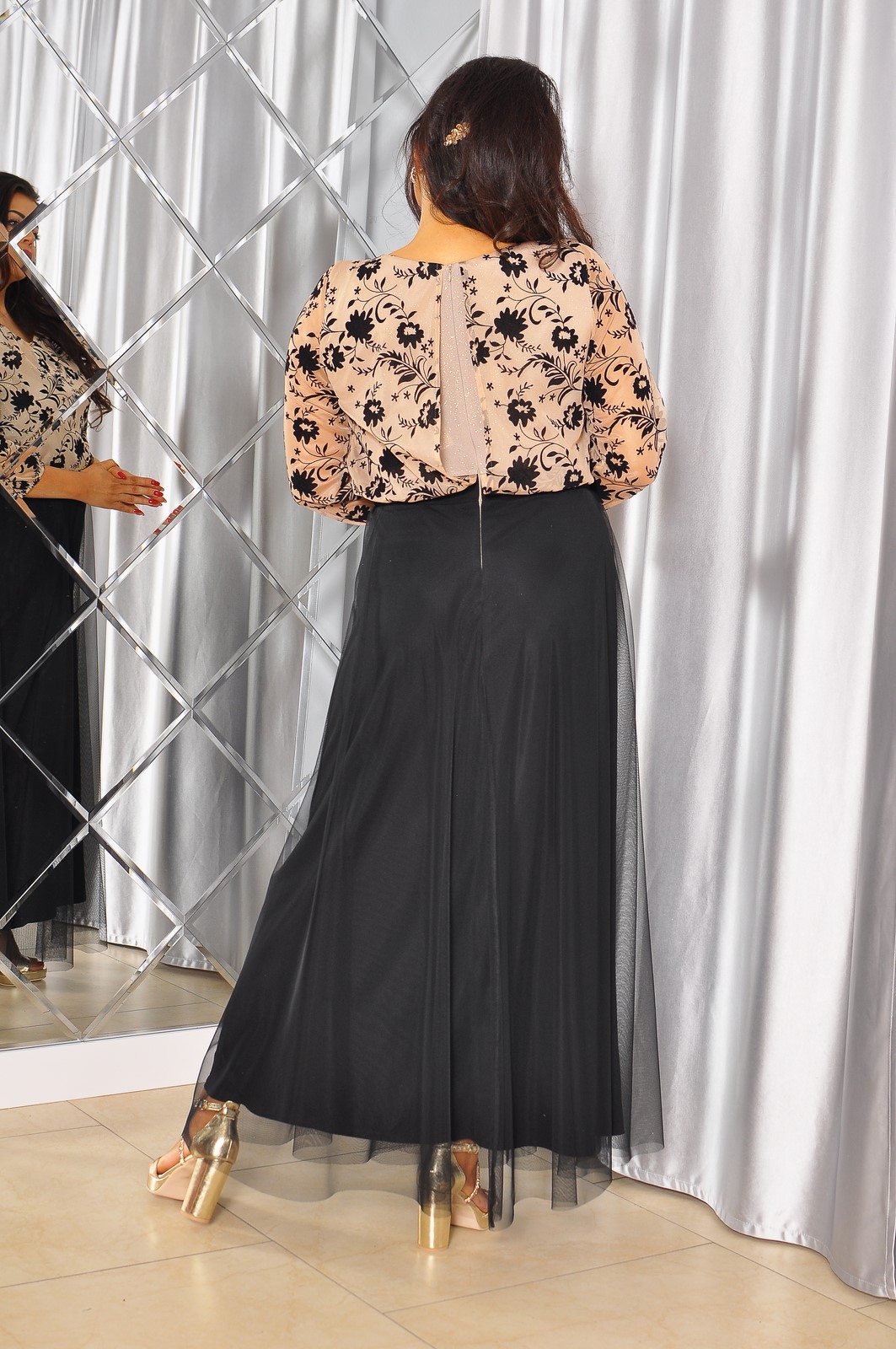 Wyjątkowa sukienka maxi, która zachwyca połączeniem subtelności i głębokiego koloru. Model posiada beżową górę oraz czarną tiulową spódnicę.Tiul nadaje sukience lekkości, a jednocześnie pięknie podkreśla jej elegancki charakter.