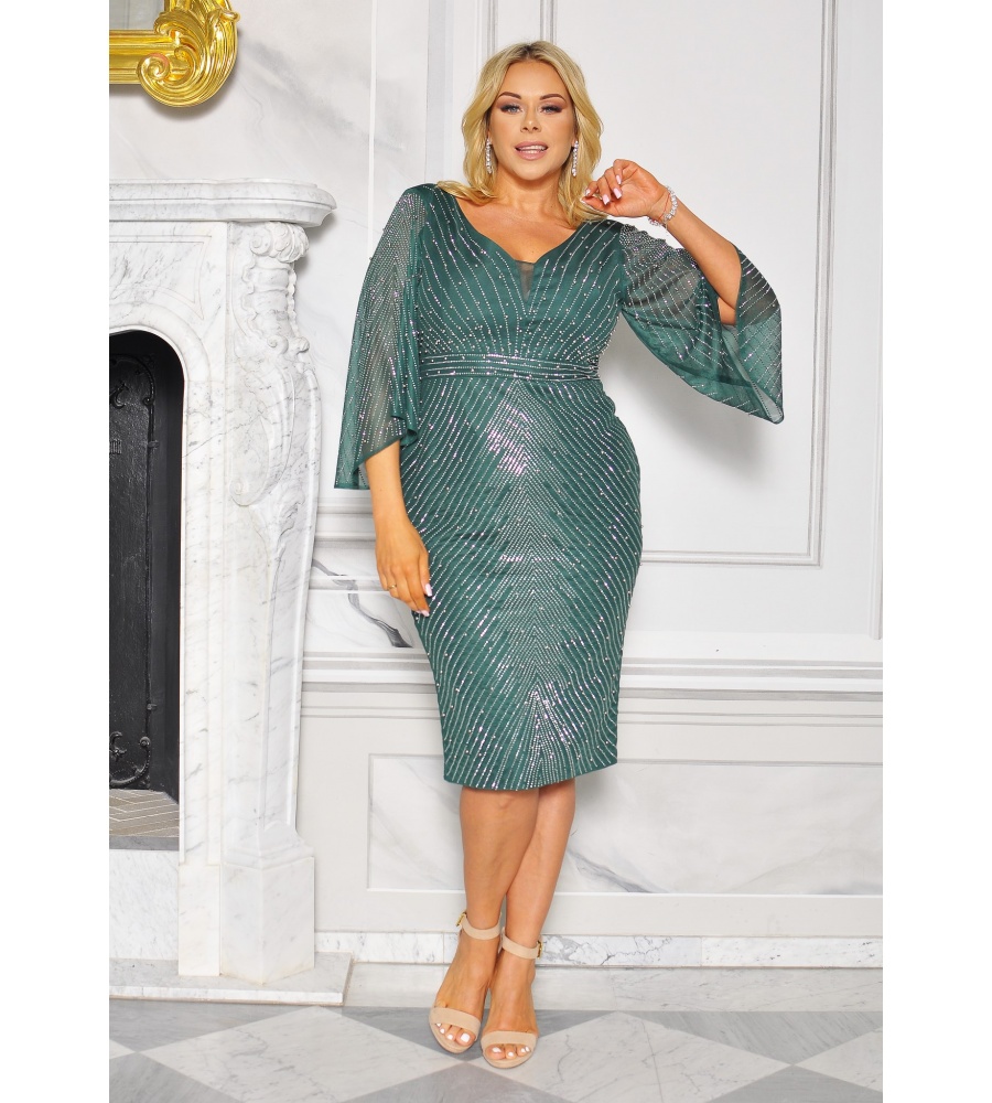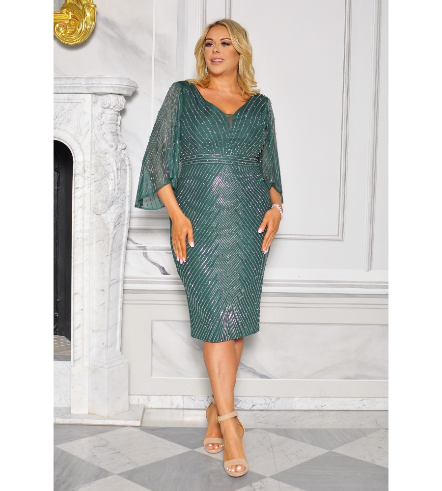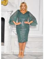 Nietuzinkowa sukienka bogato zdobiona na całej długości w kolorze zielonym. Model posiada wszyte miseczki oraz rękaw 3/4. Zasuwana na kryty zamek. Idealnie sprawdzi się jako kreacja na wesele lub sylwestra.