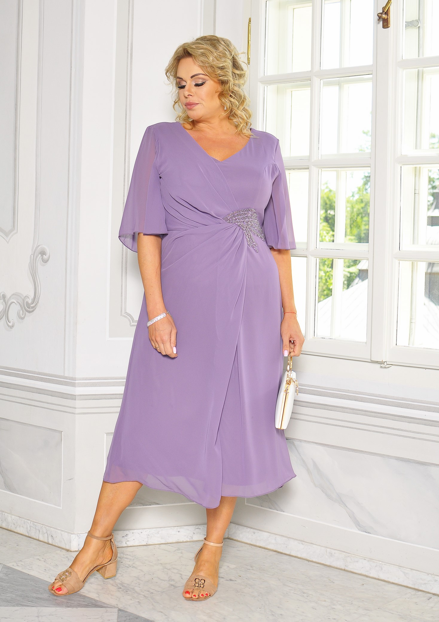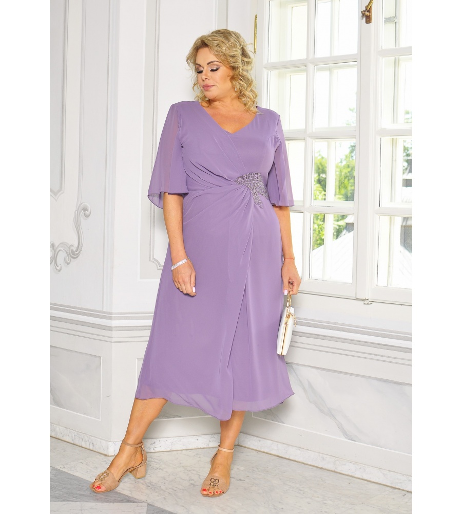 Zwiewna sukienka midi w kolorze fioletowym ze zdobieniem w talii, które idealnie tuszuje wszelkie niedoskonałości figury. Zwiewny materiał nadaje lekkości oraz sprawi, że będziesz czuć się wyjątkowo nawet w upalne dni.
