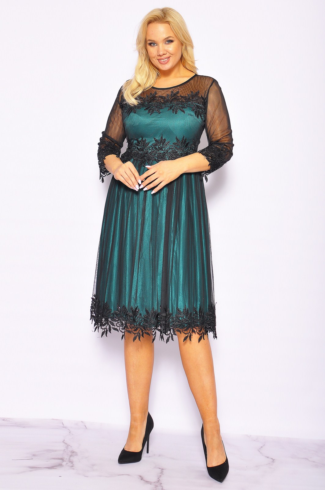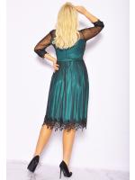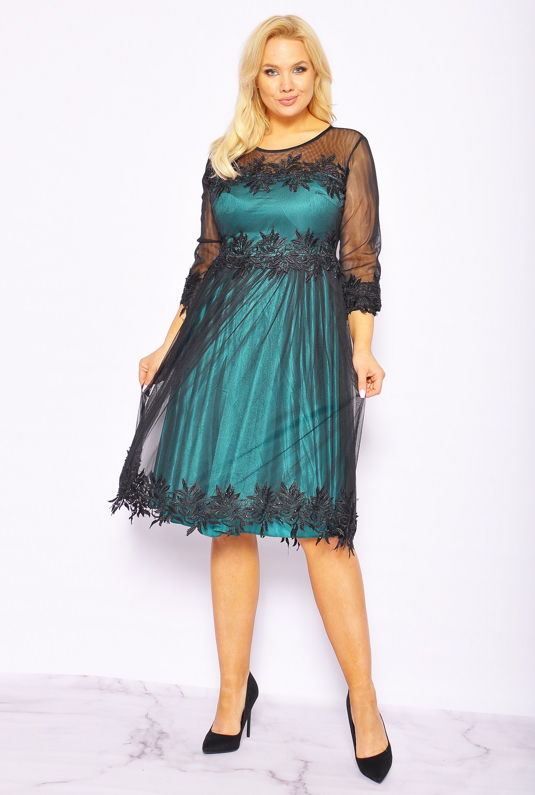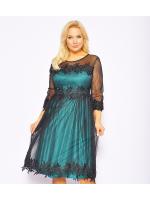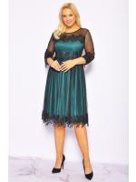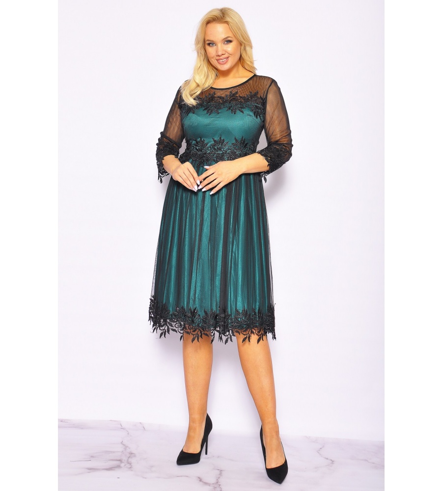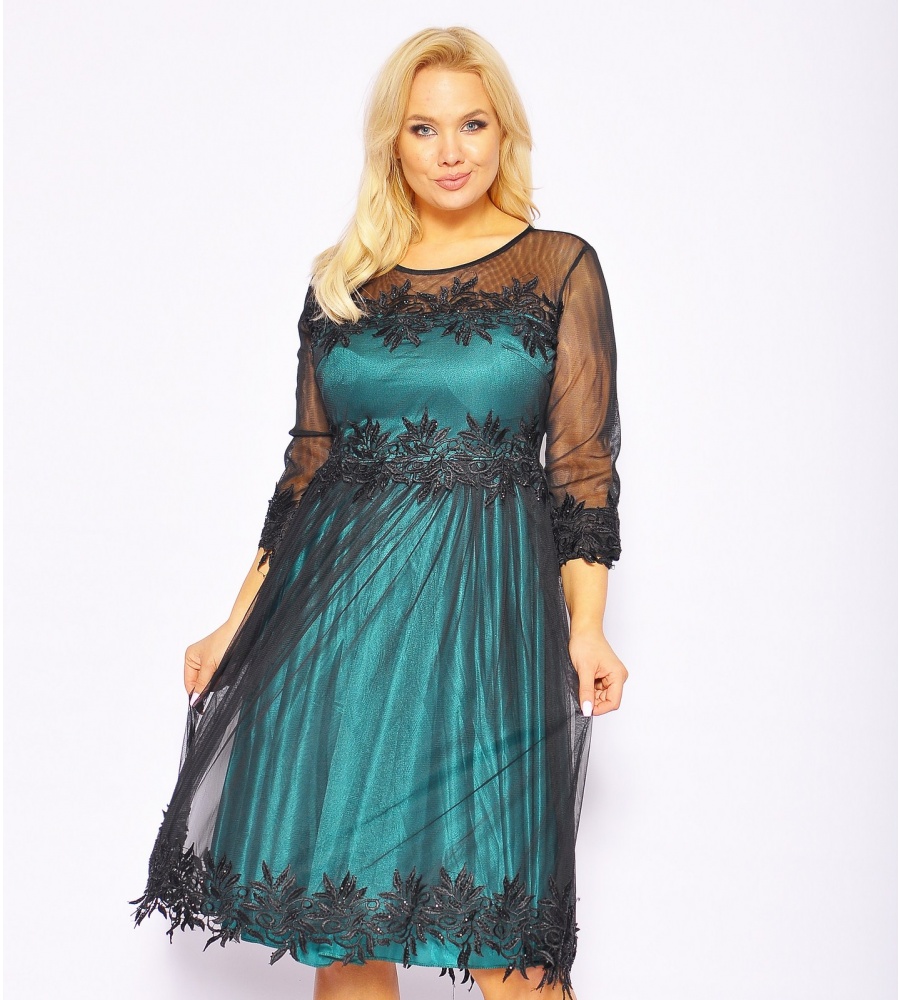 Zielona sukienka midi z czarnym tiulem . Model posiada rekaw 3/4, który jest wykonany z drobnej siateczki. Całość zakończona jest ozdobna dekoracja z dżetami. Zapinana na kryty zamek. Z butami oraz biżuterią model prezentuje się bardzo dobrze, nadaje się na różne okazję.