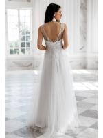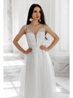 Przepiękna tiulowa suknia ślubna. Sukienka na siateczkowym dekolcie zdobiona gipiurowymi aplikacjami obszytymi cekinami i kryształkami. Bogate obszycie sprawia, że suknia ma niepowtarzalny wygląd. Dół wykonany z dwóch warstw miękkiego tiulu oraz podwójnej podszewki z satyny . Podszewka pięknie przebija satynowym połyskiem spod tiulowej warstwy sukienki. Z tyłu głębszy dekolt i zapięcie na zamek. Suknia prezentuje się niesamowicie i z pewnością będzie przykuwać uwagę. Doskonała do ślubu kościelnego jak również ślubu cywilnego.