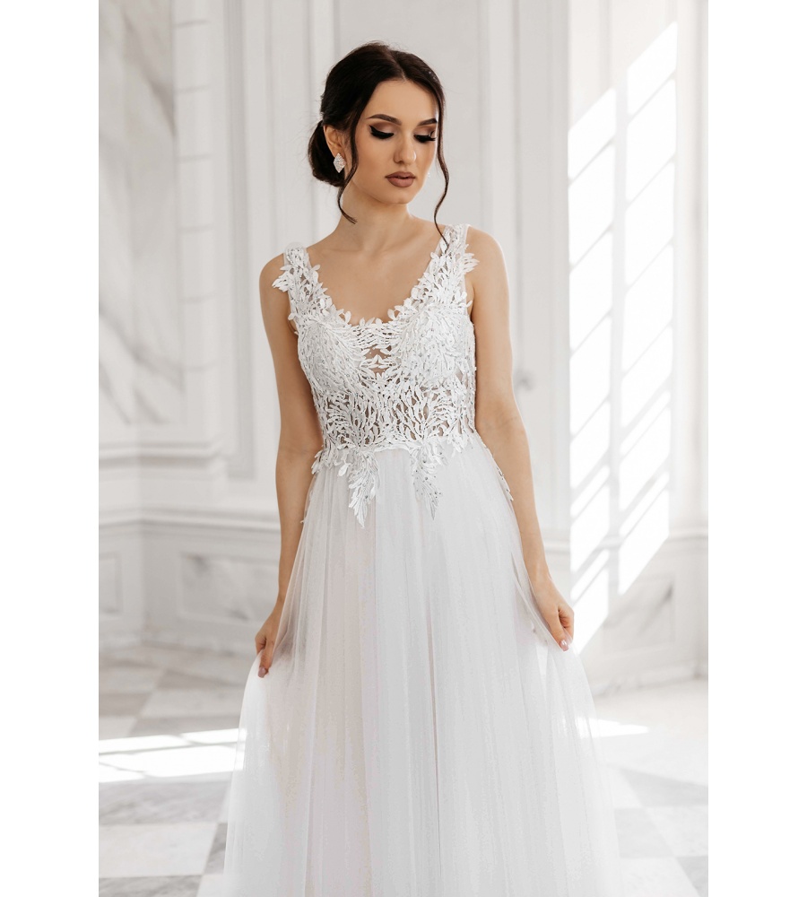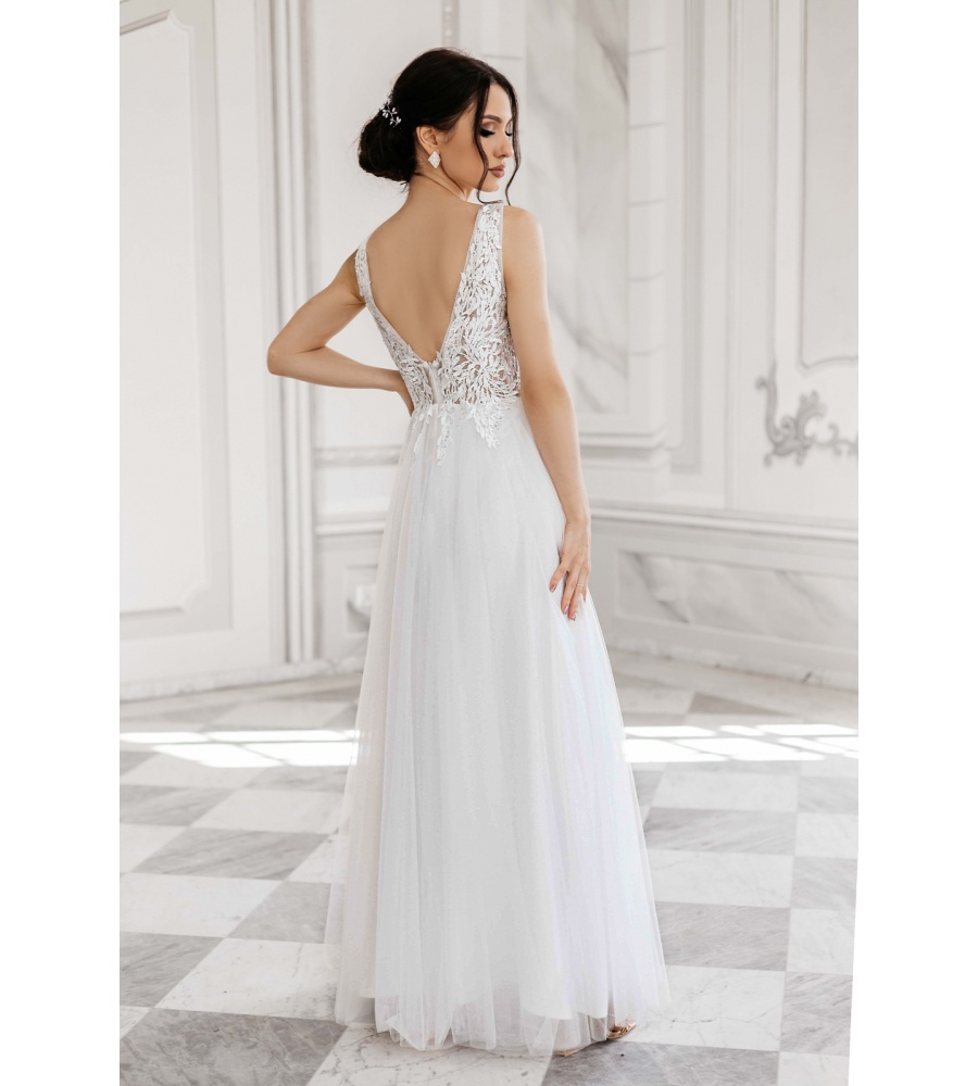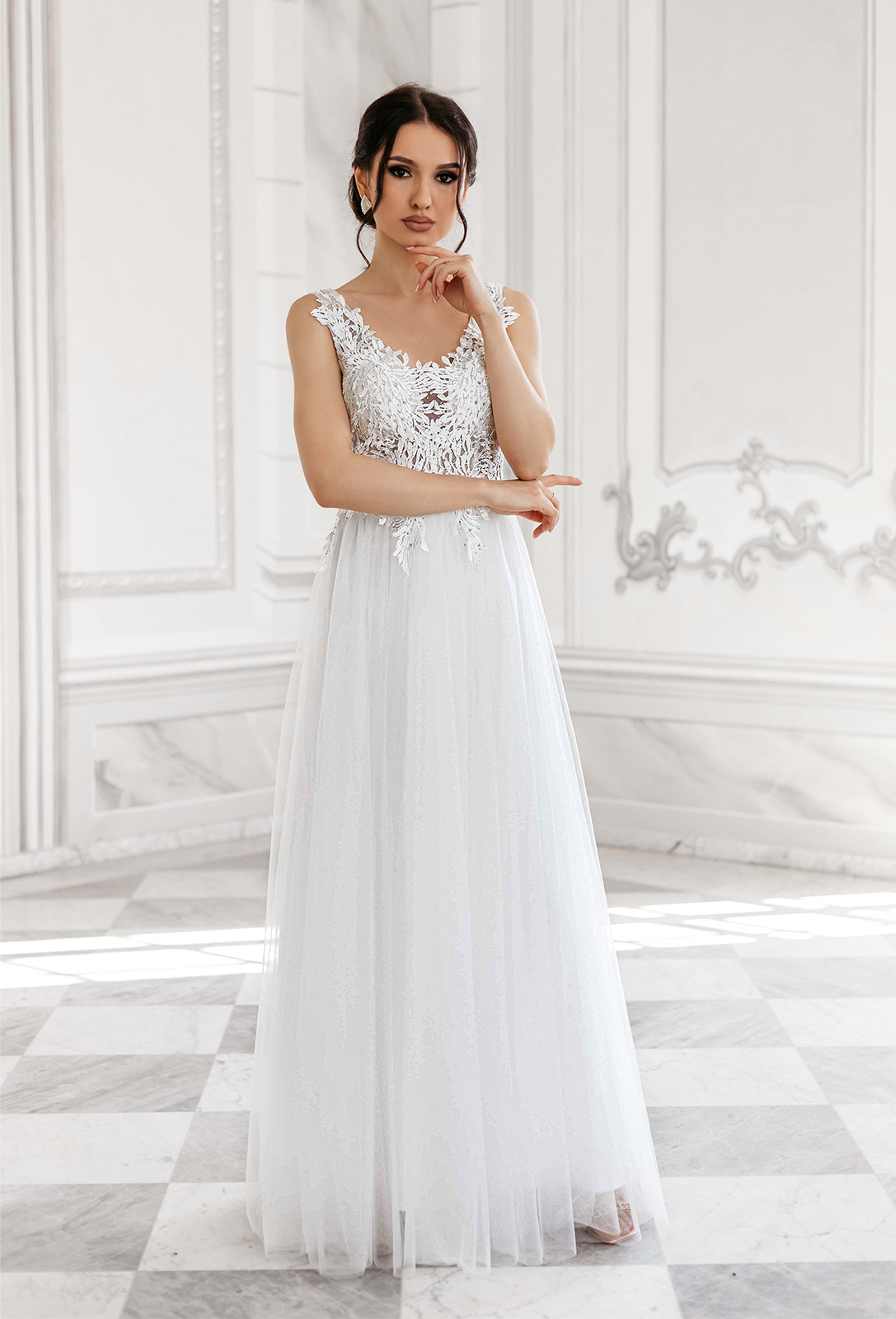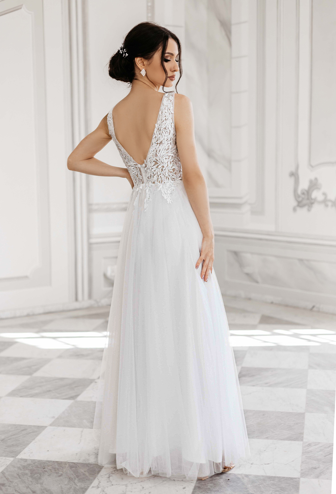 Sukienka w kolorze białym z pięknie haftowaną górą na wzór liści, dodatkowo wysadzana drobnymi błyszczącymi diamencikami. Model ten posiada tiulowy dół na satynowej podszewce. Dekolt w literę V niesamowicie eksponuje biust, również wszyte zostały miseczki. Sukienka zasuwana na kryty zamek. Idealna na bal, wesele, poprawimy.