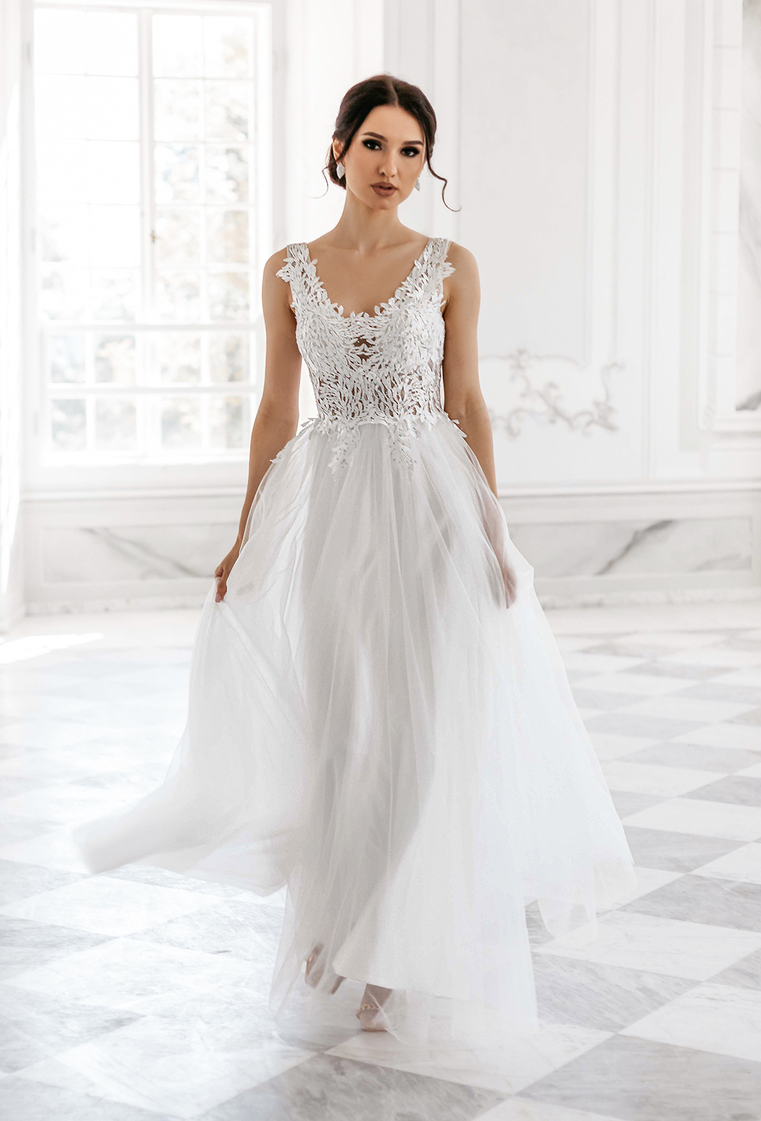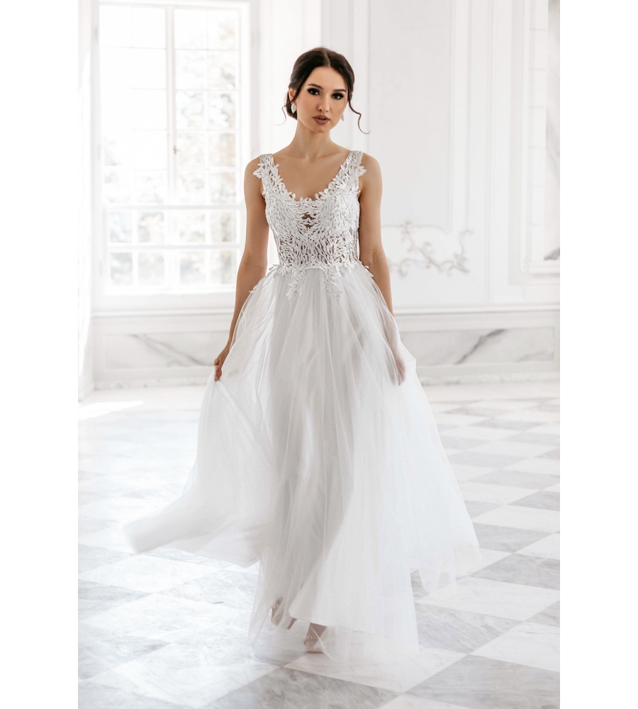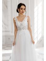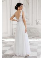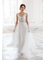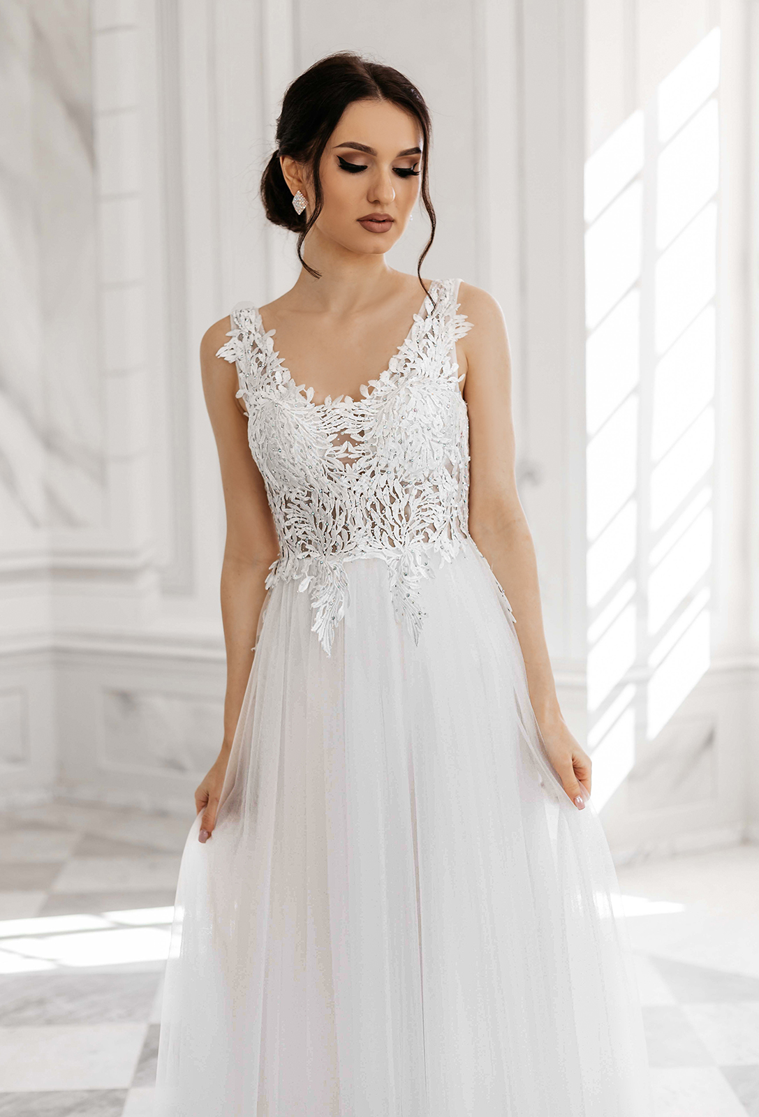 Sukienka w kolorze białym z pięknie haftowaną górą na wzór liści, dodatkowo wysadzana drobnymi błyszczącymi diamencikami. Model ten posiada tiulowy dół na satynowej podszewce. Dekolt w literę V niesamowicie eksponuje biust, również wszyte zostały miseczki. Sukienka zasuwana na kryty zamek. Idealna na bal, wesele, poprawimy.