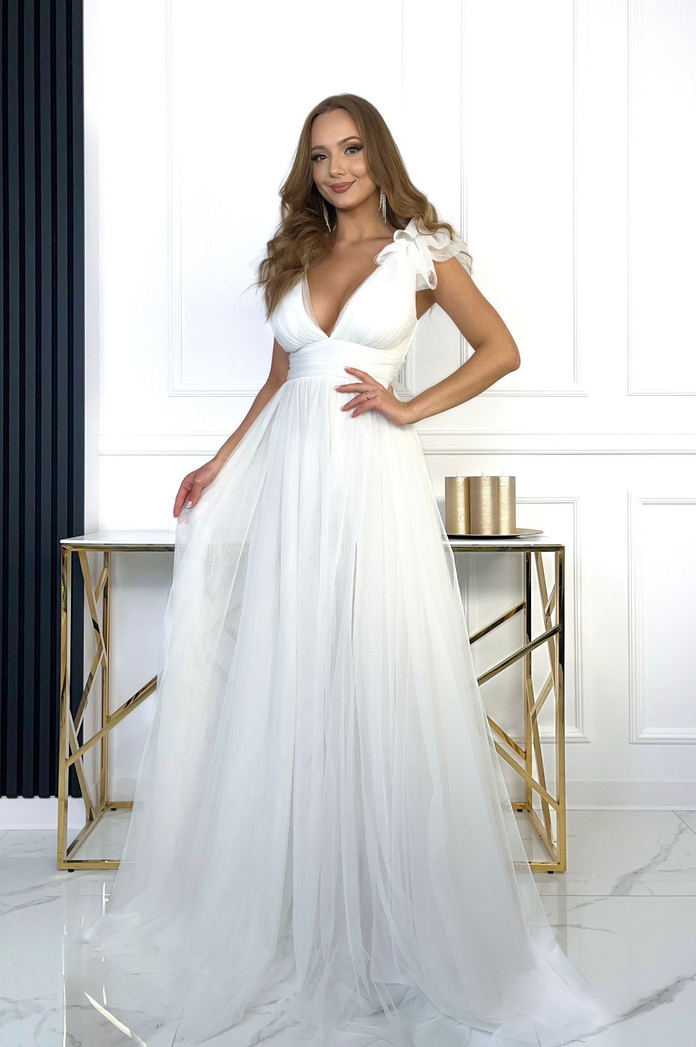 Zjawiskowa suknia ślubna w kolorze śnieżnej bieli, wykonana z lekkiego, warstwowego tiulu, który nadaje stylizacji bajkowego charakteru. Delikatna, a zarazem efektowna – idealna dla Panny Młodej, która marzy o romantycznym, subtelnym wyglądzie w tym wyjątkowym dniu.