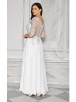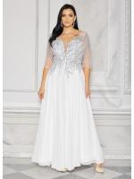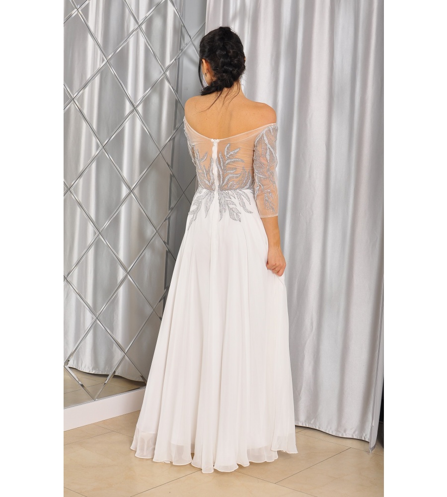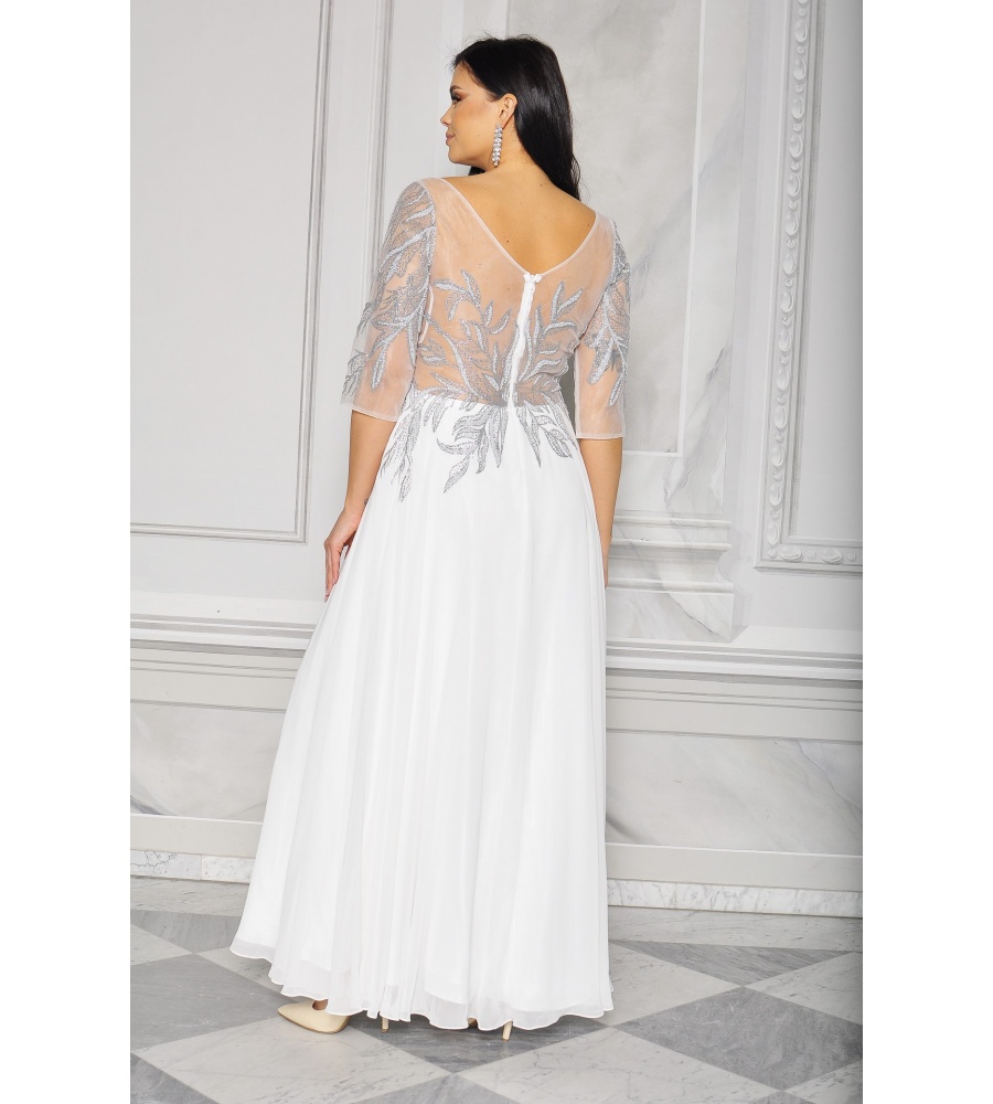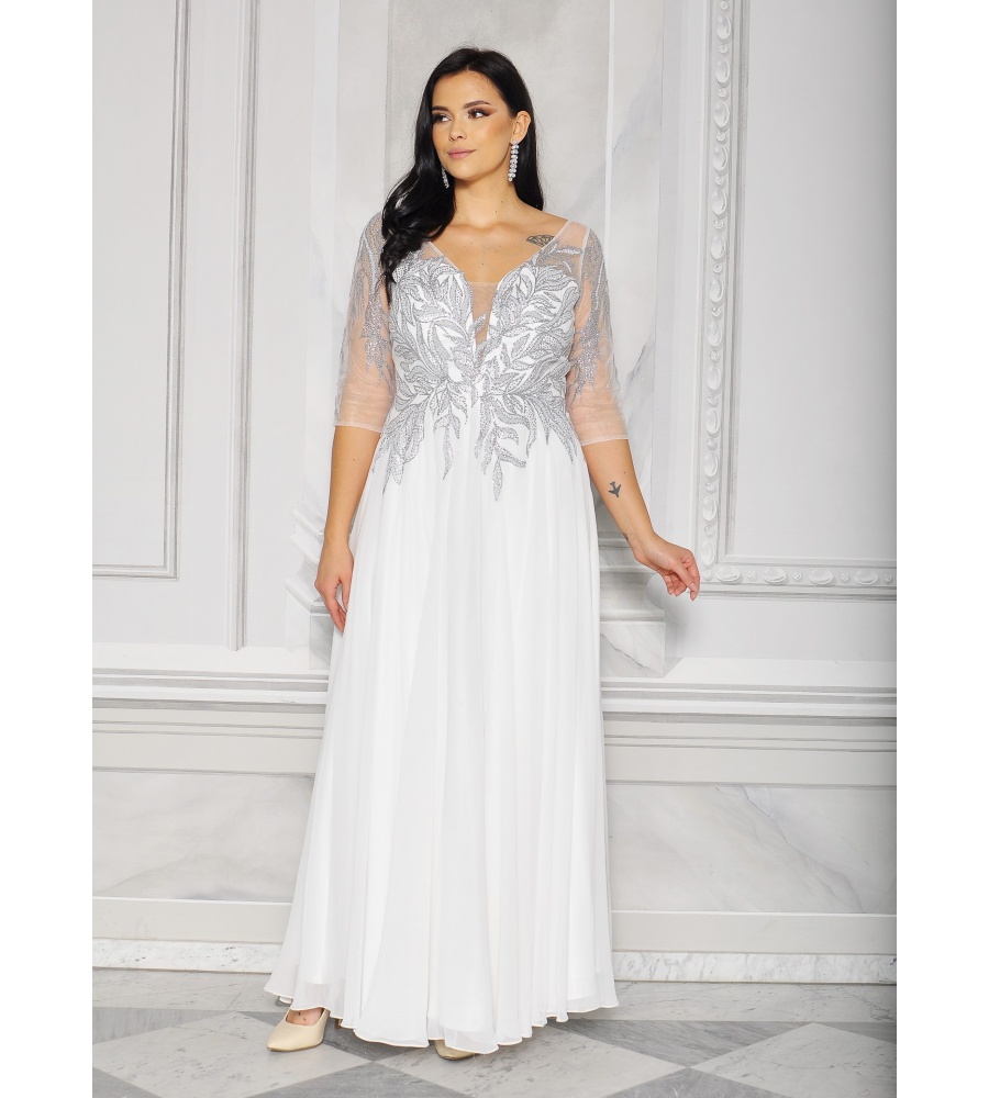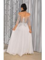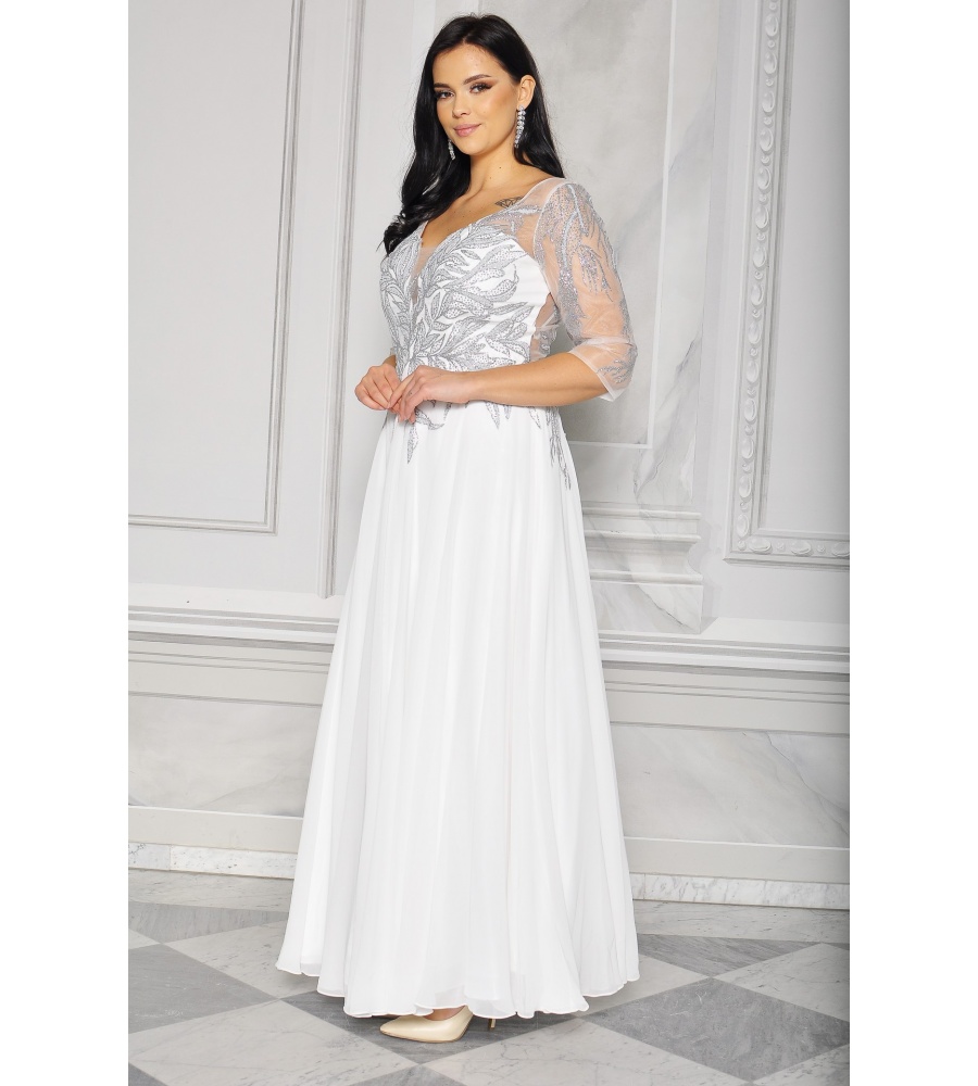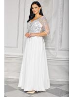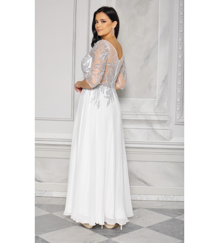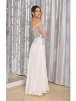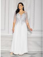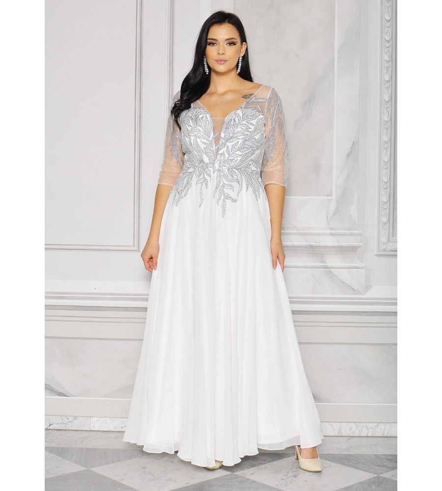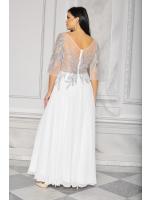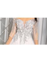 Sukienka maxi, pokryta na górze brokatem, który pięknie się mieni i daje niesamowity efekt. Głębokie wycięcie w kształcie litery V z przodu podkreśla dekolt, a kwiatowe motywy oraz prześwitujący materiał nadają subtelności. Sukienka sprawi, że każda Panna Młoda poczuje się wyjątkowo.