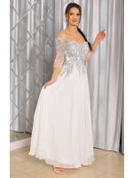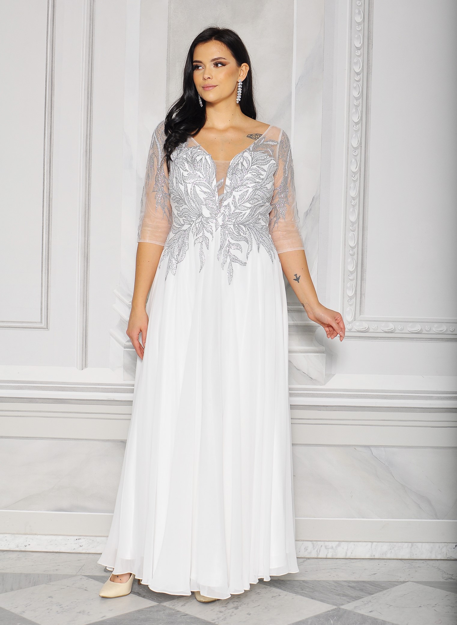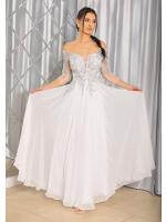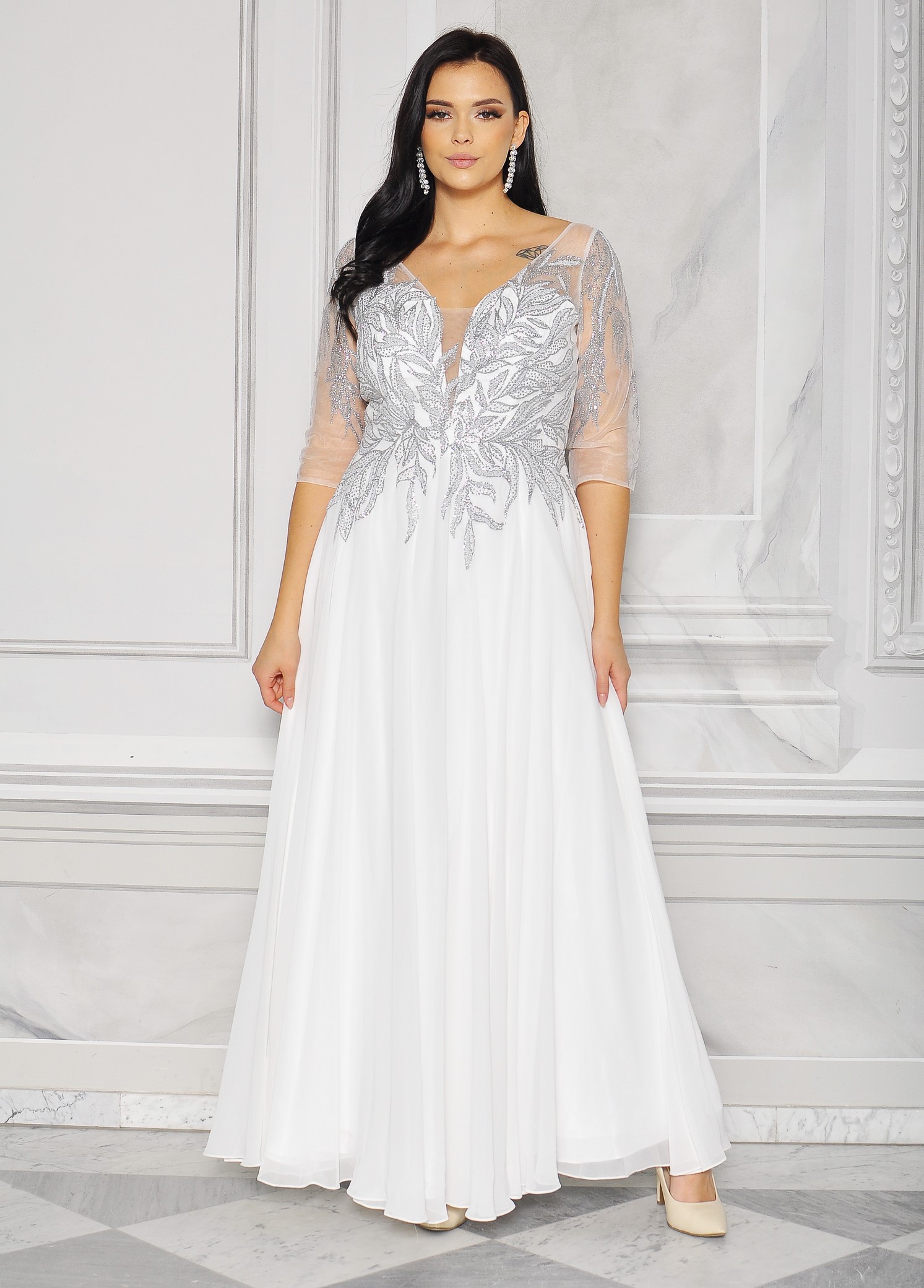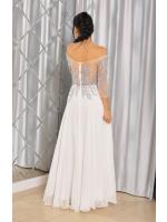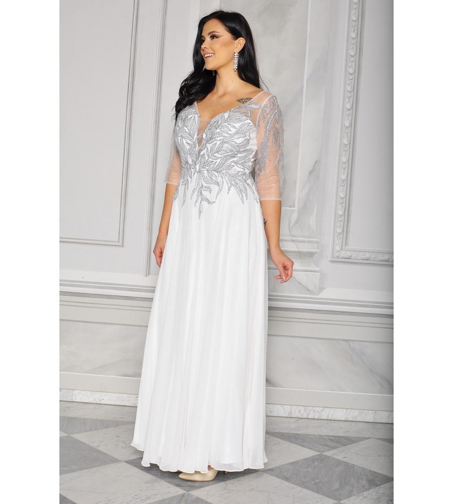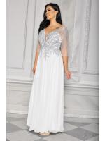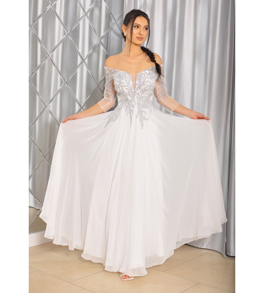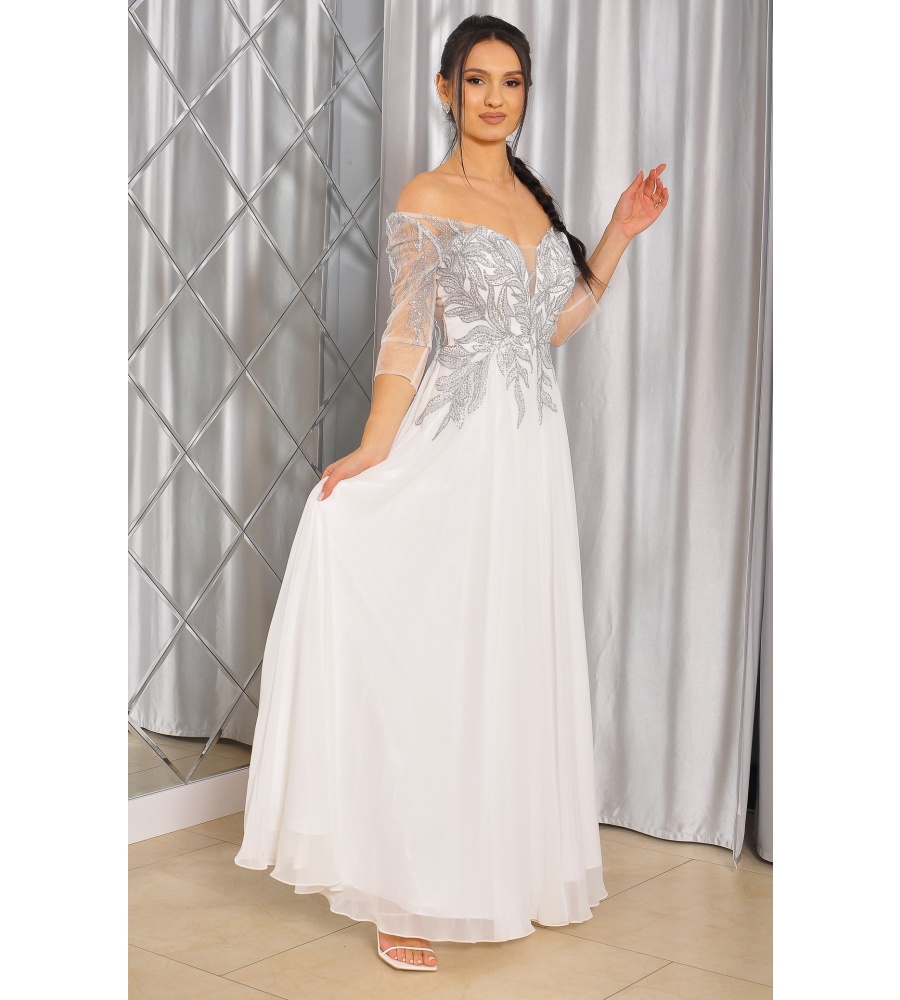 Sukienka maxi, pokryta na górze brokatem, który pięknie się mieni i daje niesamowity efekt. Głębokie wycięcie w kształcie litery V z przodu podkreśla dekolt, a kwiatowe motywy oraz prześwitujący materiał nadają subtelności. Sukienka sprawi, że każda Panna Młoda poczuje się wyjątkowo.