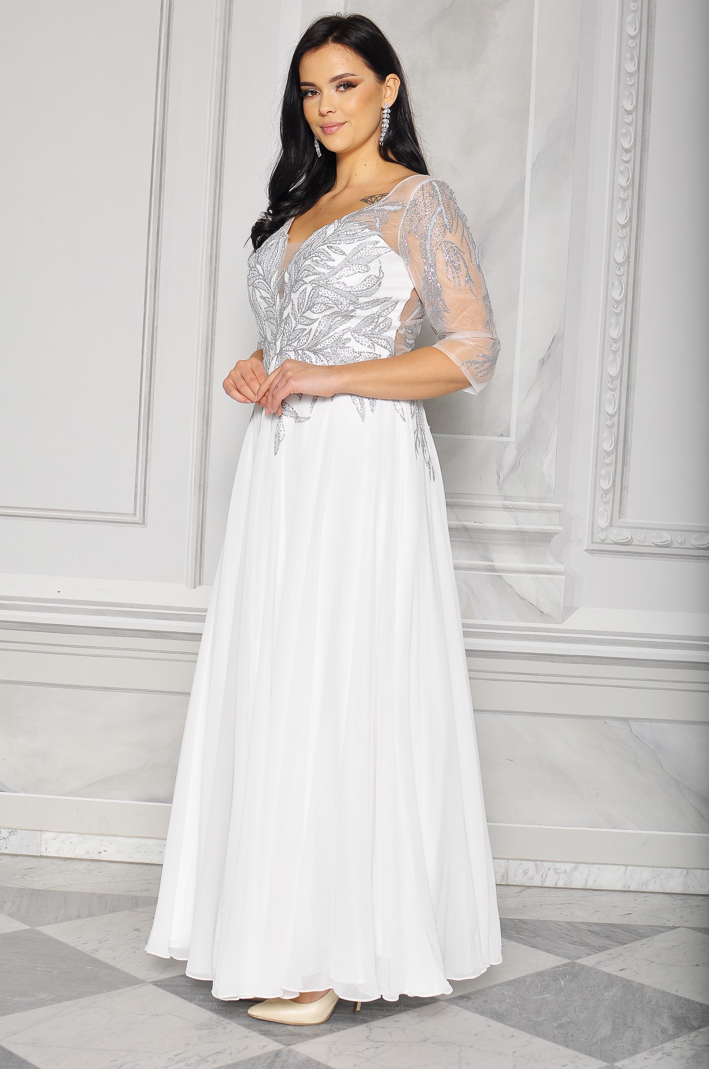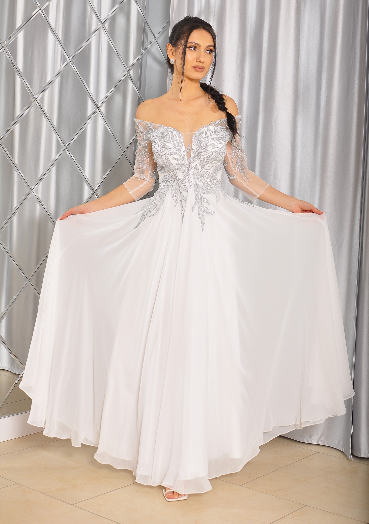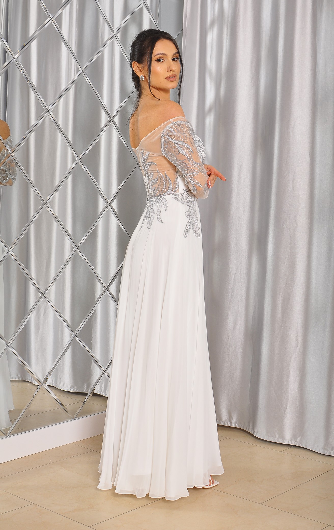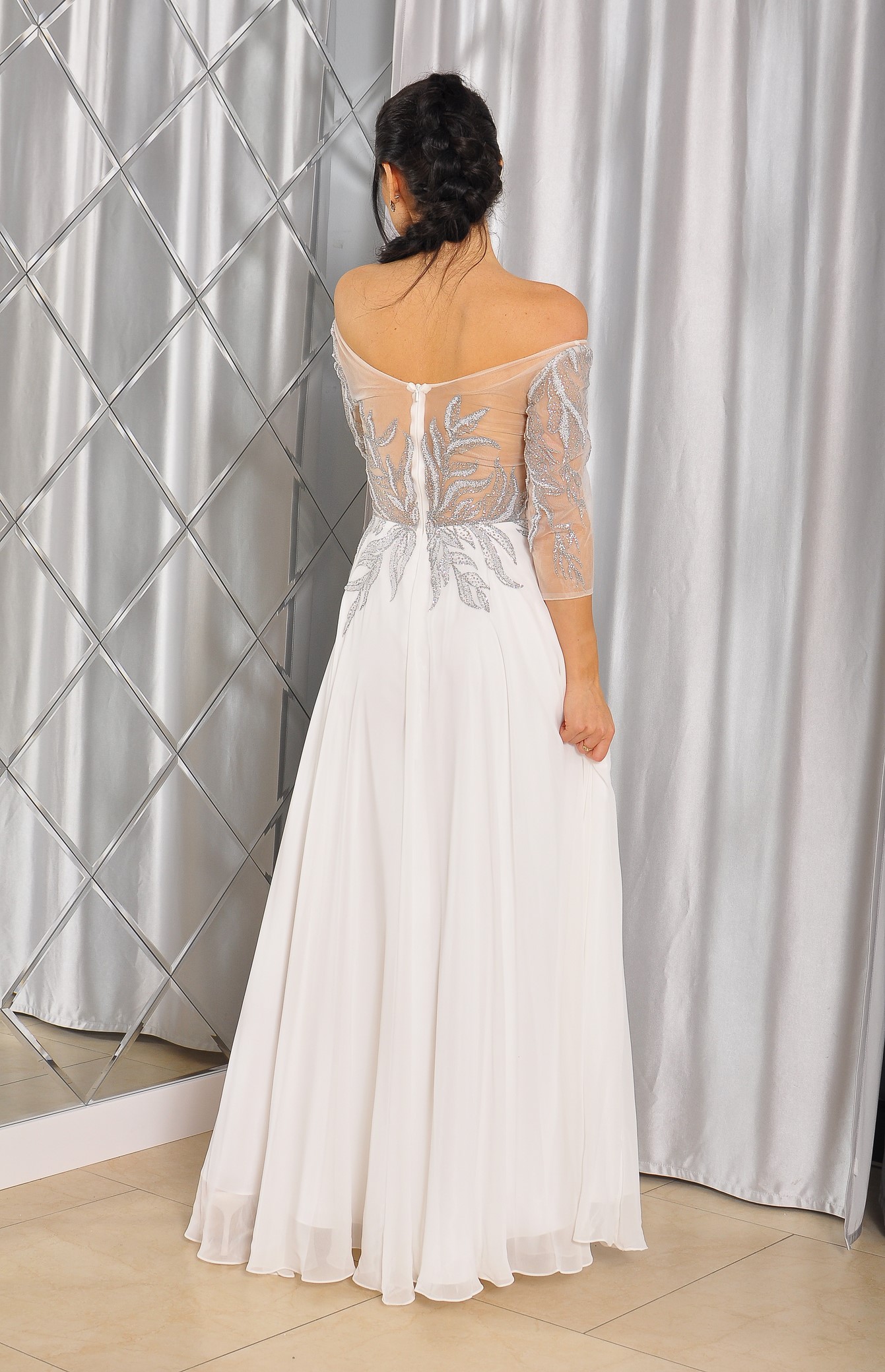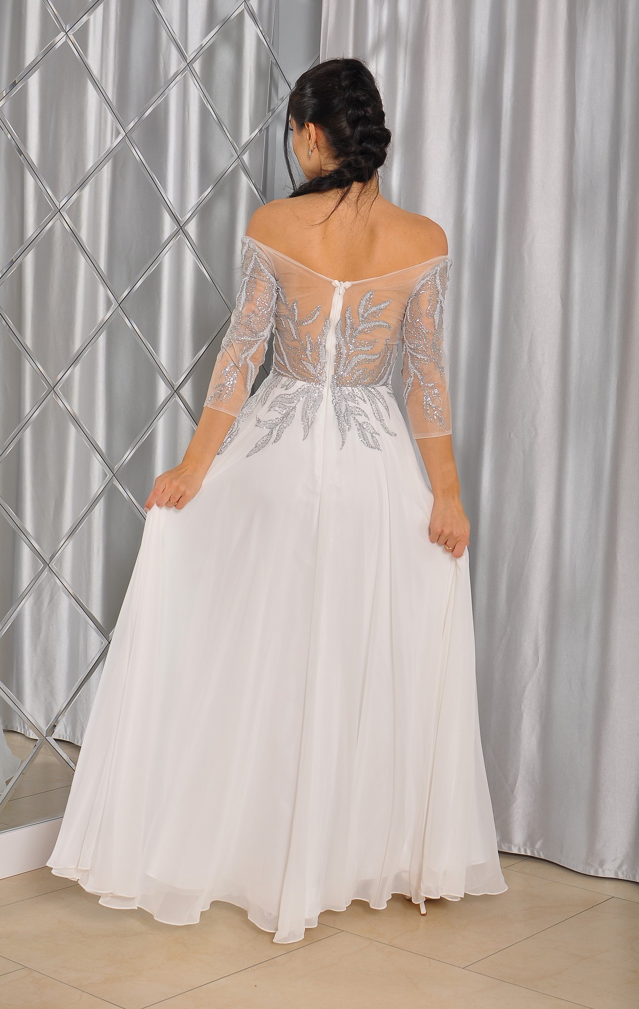 Sukienka maxi, pokryta na górze brokatem, który pięknie się mieni i daje niesamowity efekt. Głębokie wycięcie w kształcie litery V z przodu podkreśla dekolt, a kwiatowe motywy oraz prześwitujący materiał nadają subtelności. Sukienka sprawi, że każda Panna Młoda poczuje się wyjątkowo.