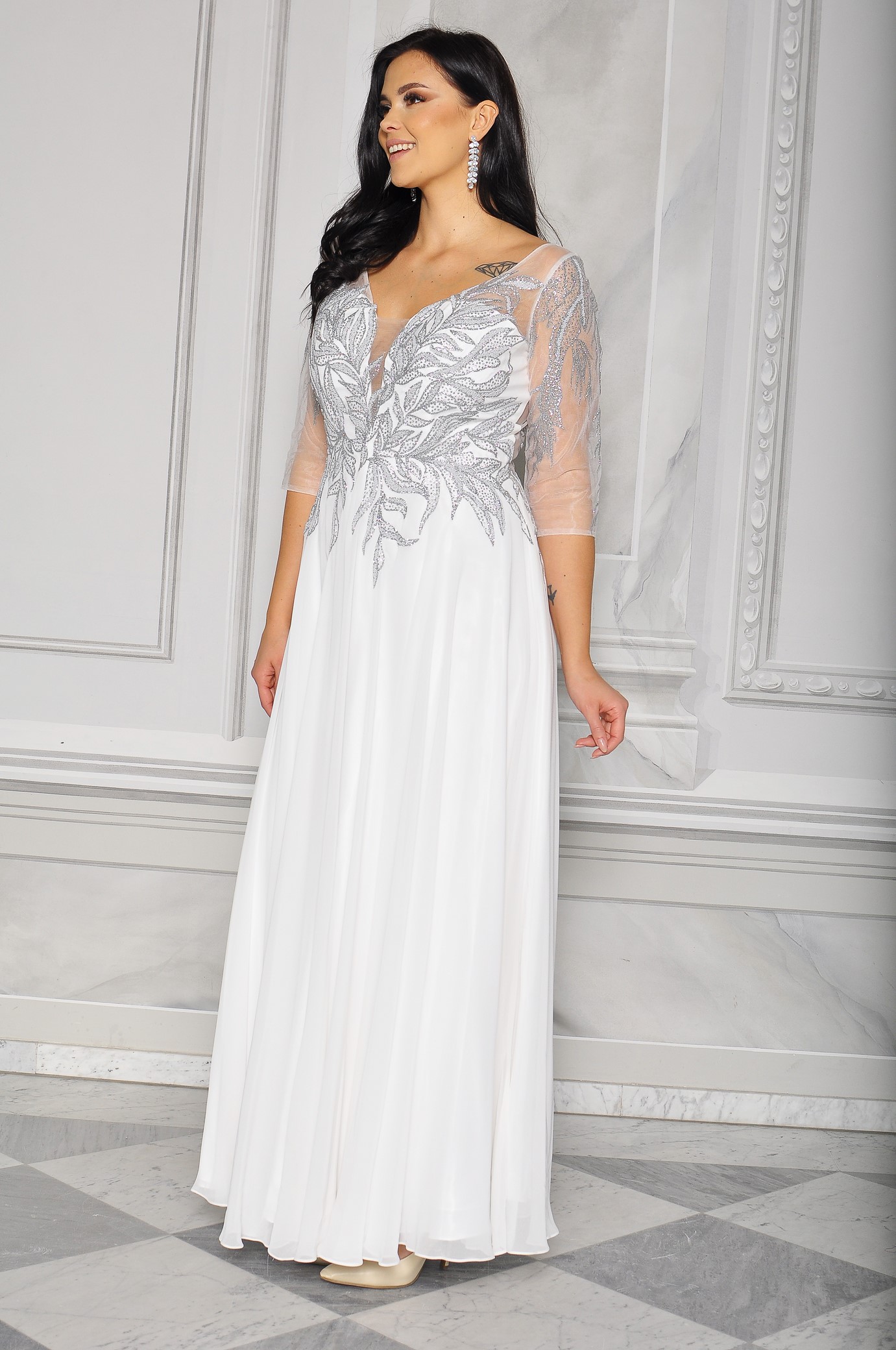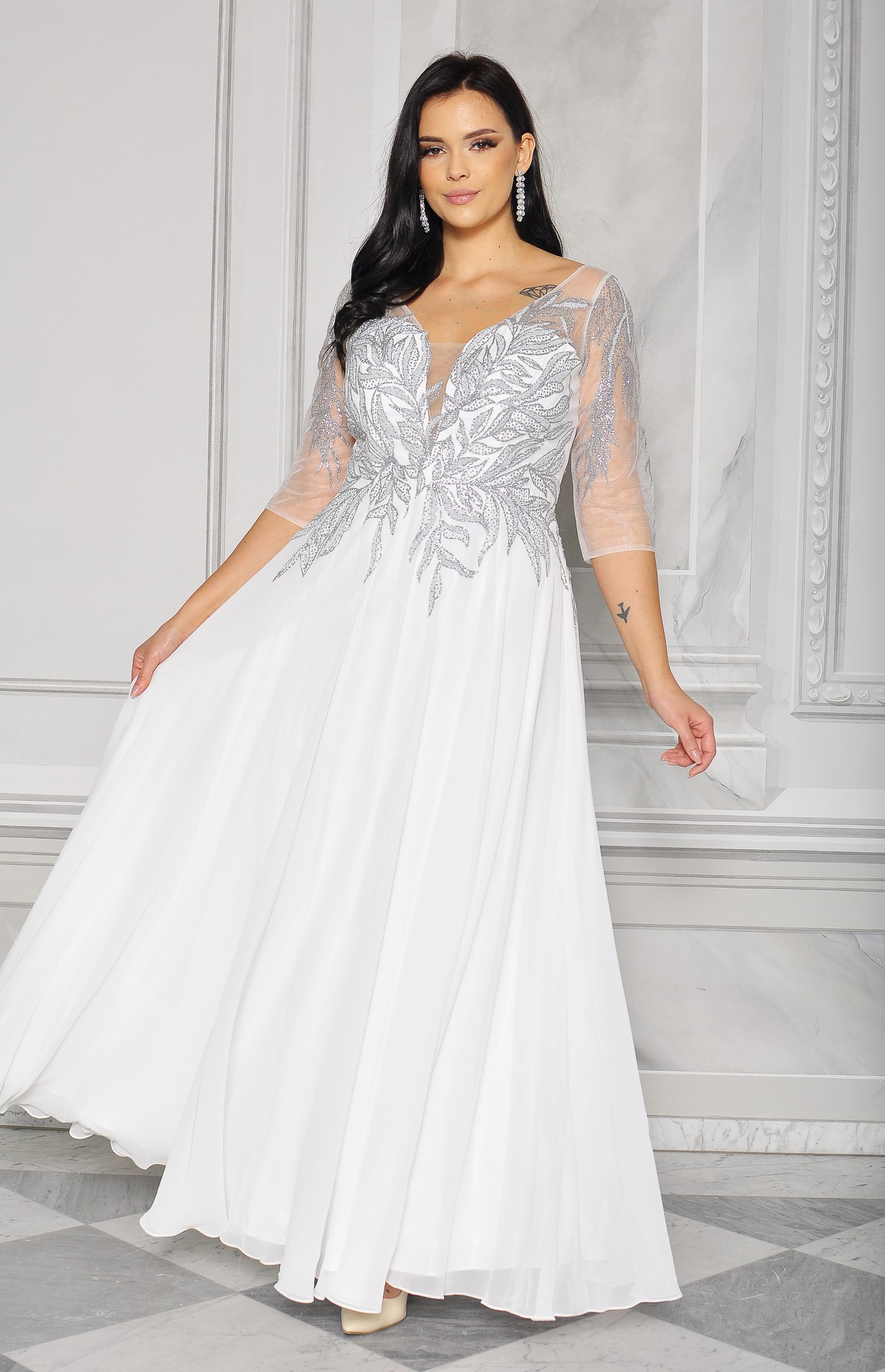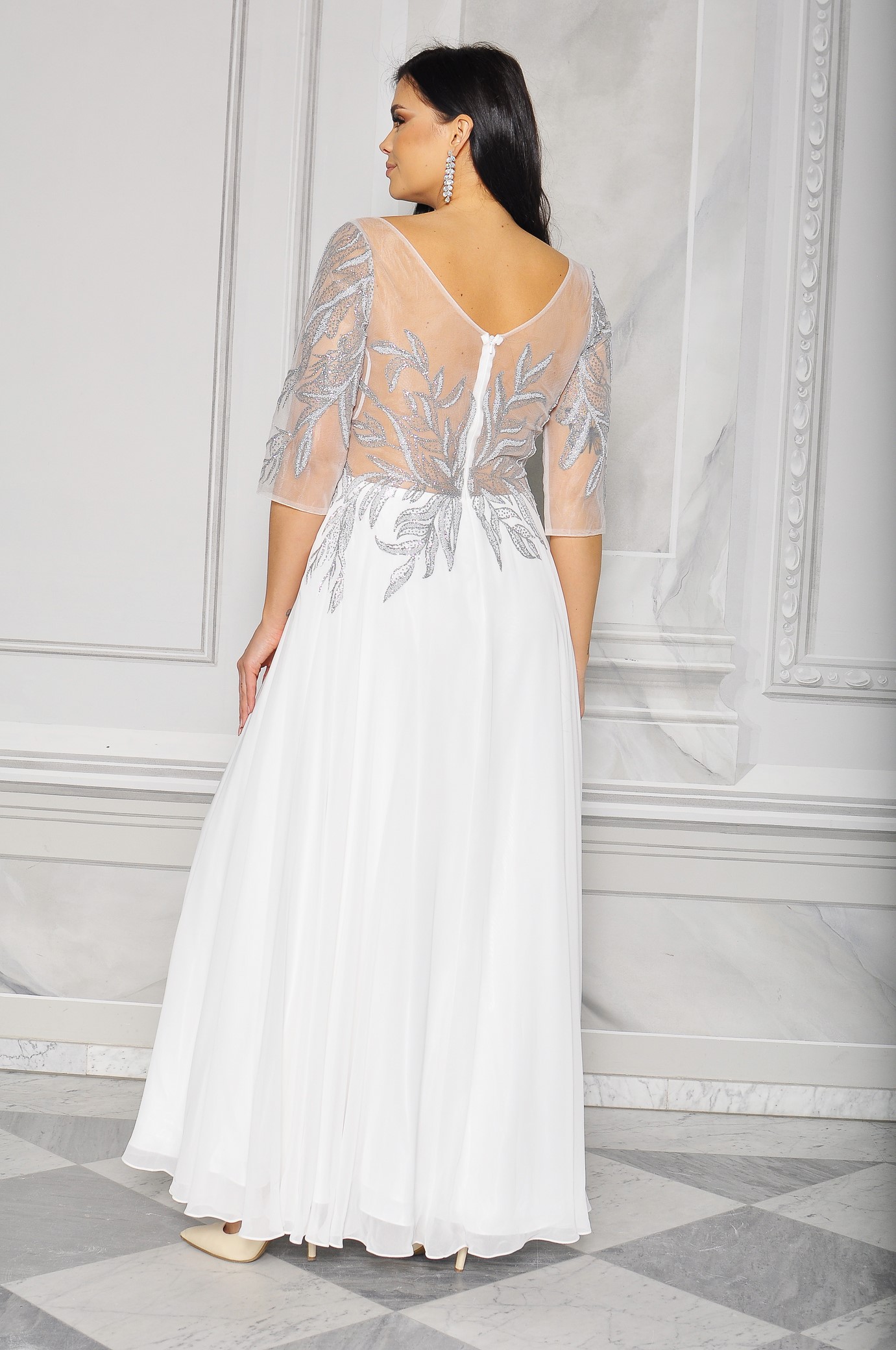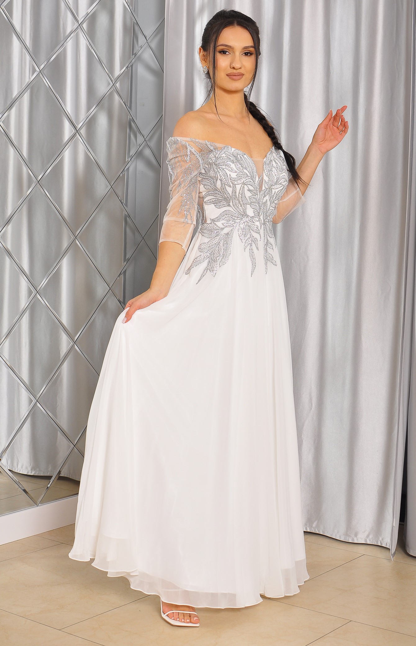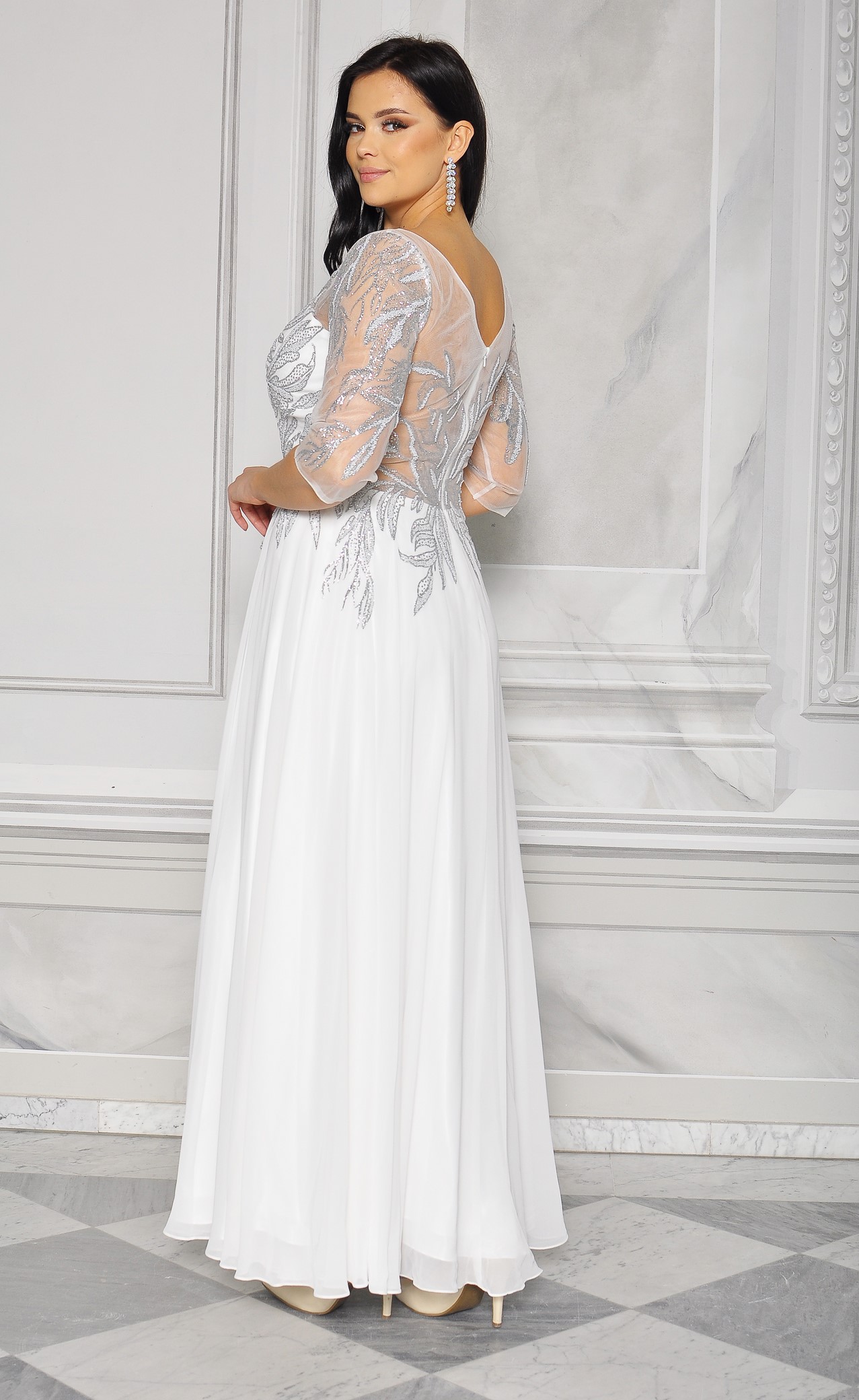 Sukienka maxi, pokryta na górze brokatem, który pięknie się mieni i daje niesamowity efekt. Głębokie wycięcie w kształcie litery V z przodu podkreśla dekolt, a kwiatowe motywy oraz prześwitujący materiał nadają subtelności. Sukienka sprawi, że każda Panna Młoda poczuje się wyjątkowo.