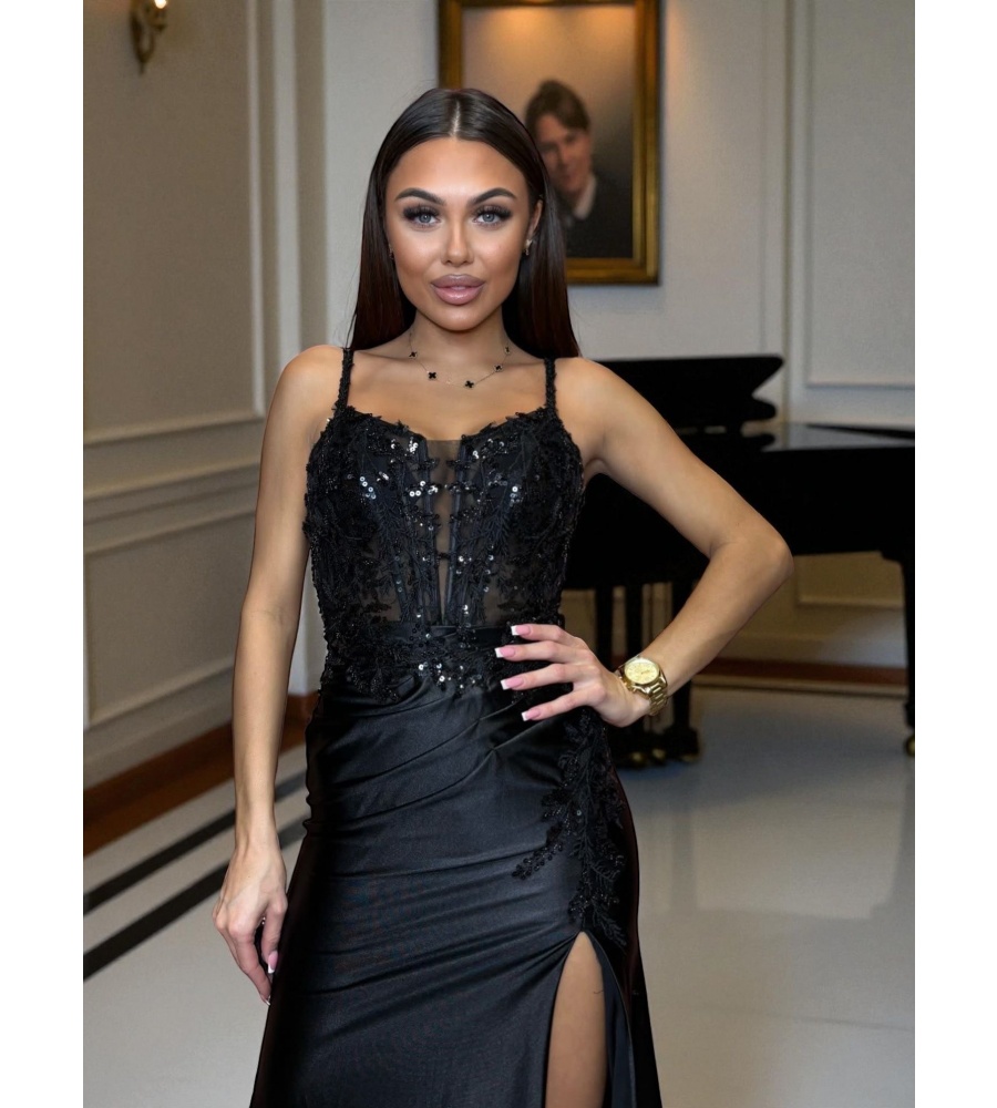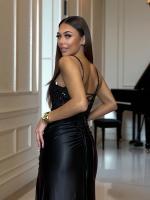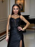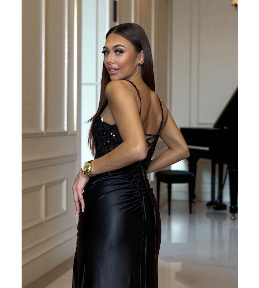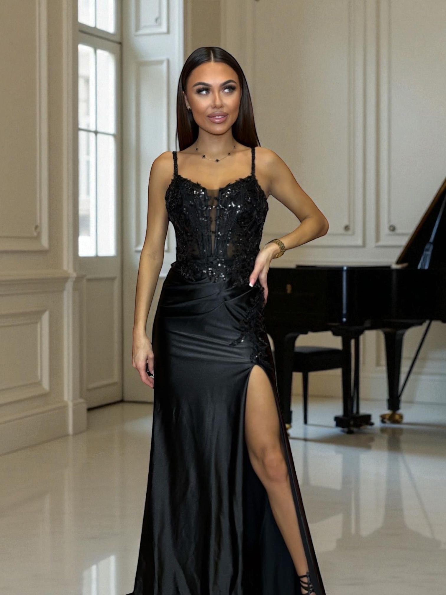 Zjawiskowa satynowa sukienka maxi w fasonie rybki to połączenie klasy i zmysłowości. Wykonana z delikatnie połyskującej satyny, doskonale układa się na sylwetce i podkreśla kobiece kształty. Gorset zdobiony błyszczącymi aplikacjami nadaje kreacji wyjątkowego charakteru, a wysokie rozcięcie na nodze dodaje odważnego, eleganckiego akcentu. Idealny wybór na wieczorne przyjęcia, wesela, studniówkę lub galę.