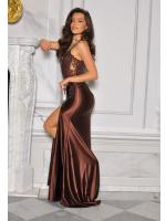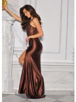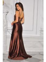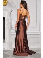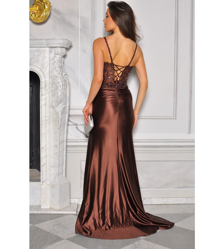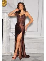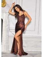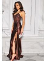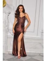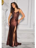 Zjawiskowa satynowa sukienka maxi w fasonie rybki to połączenie klasy i zmysłowości. Wykonana z delikatnie połyskującej satyny, doskonale układa się na sylwetce i podkreśla kobiece kształty. Gorset zdobiony błyszczącymi aplikacjami nadaje kreacji wyjątkowego charakteru, a wysokie rozcięcie na nodze dodaje odważnego, eleganckiego akcentu. Idealny wybór na wieczorne przyjęcia, wesela, studniówkę lub galę.