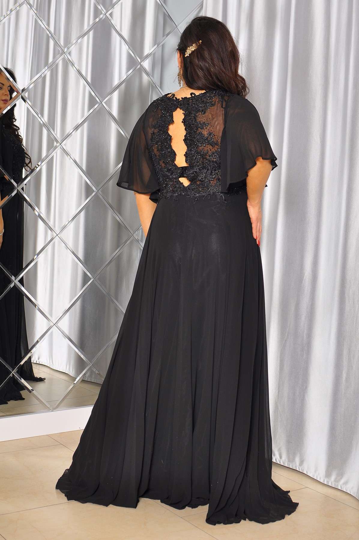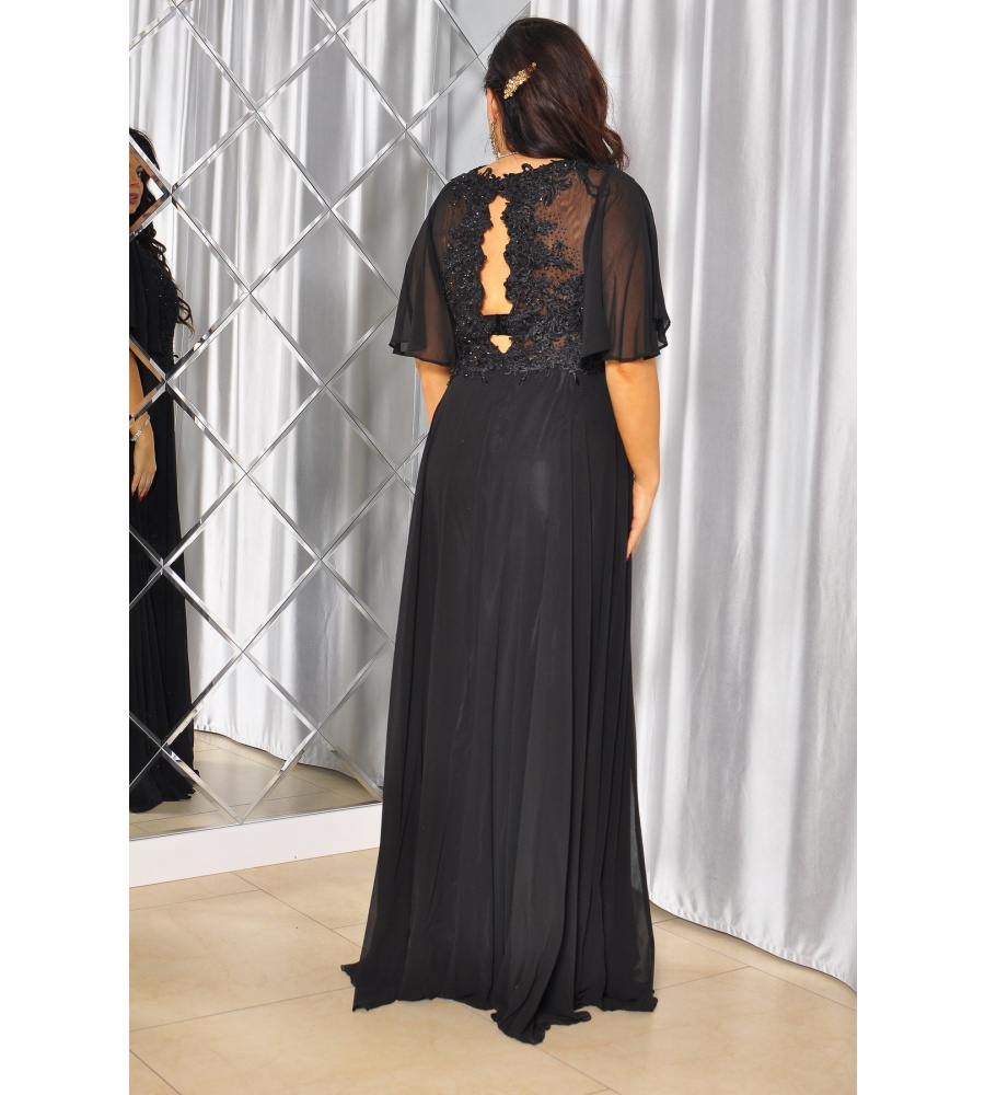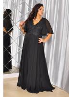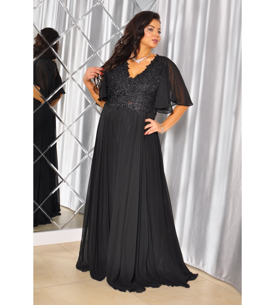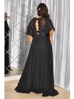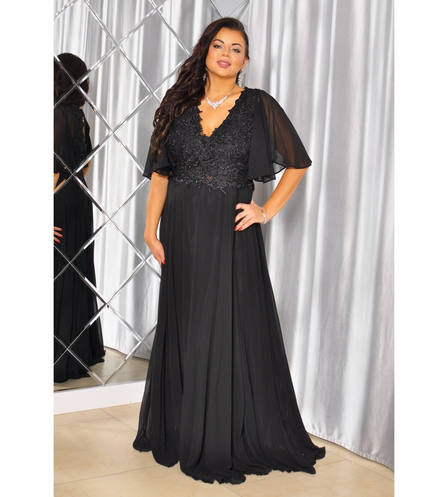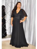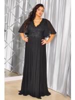 Całość uzupełniają krótkie rękawy z lekkiego szyfonu, które pięknie układają się na ramionach i dodają stylizacji zwiewności.