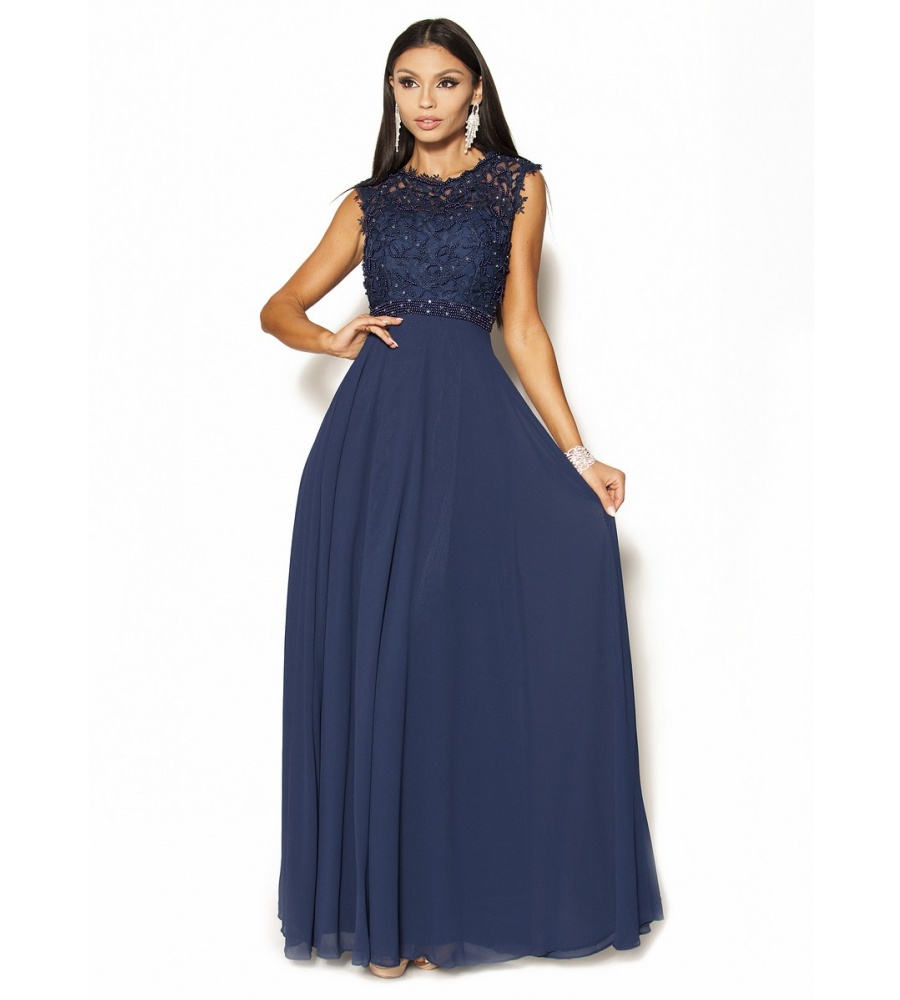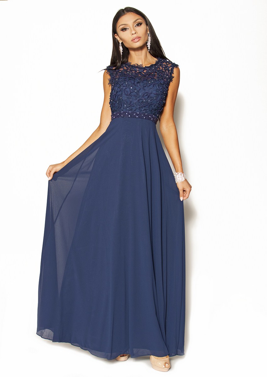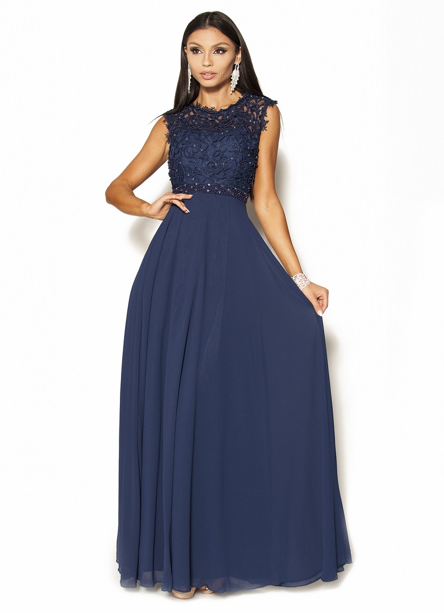 Piękna sukienka Maxi w kolorze granatowym .Góra ozdobiona delikatną koronką, perełkami i porozrzucanymi dżecikami przez co delikatnie się mieni,fason w pasie posiada pas z perełek co daje niepowtarzalny urok, pięknie wycięte koronkowe plecy.Sukienka ma wszyte miseczki.Sukienka rozmiar 36 pasuje również na rozmiar 34, jest malutka dzięki gumce z tyłu spokojnie się dopasuje.Ślicznie i delikatnie się prezentuje