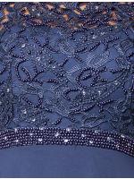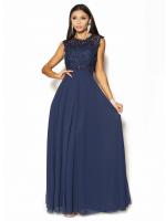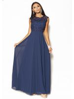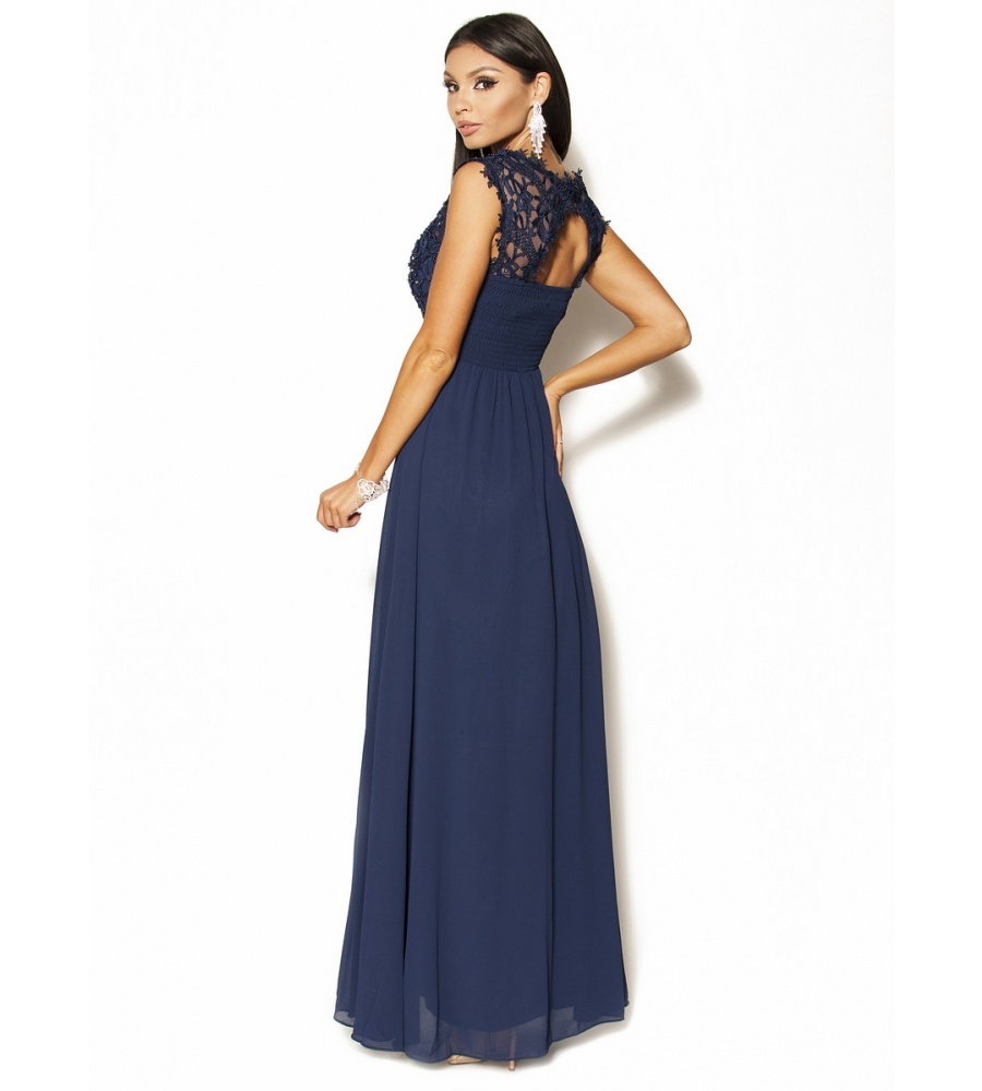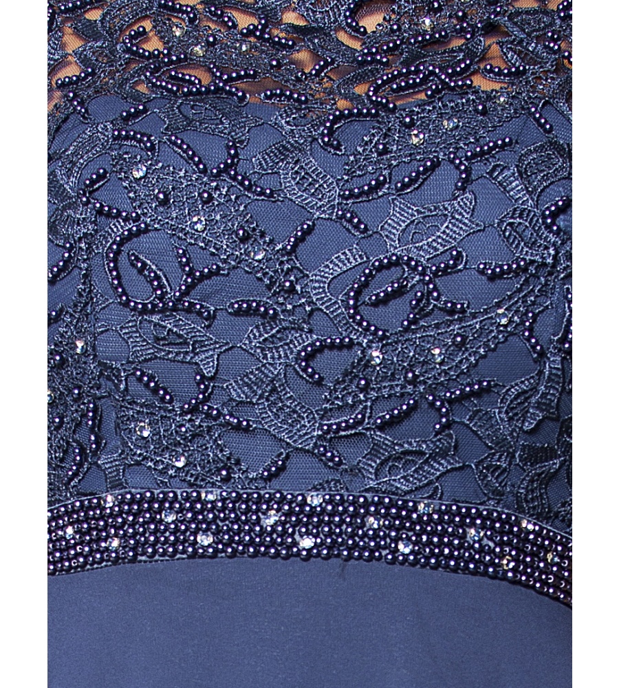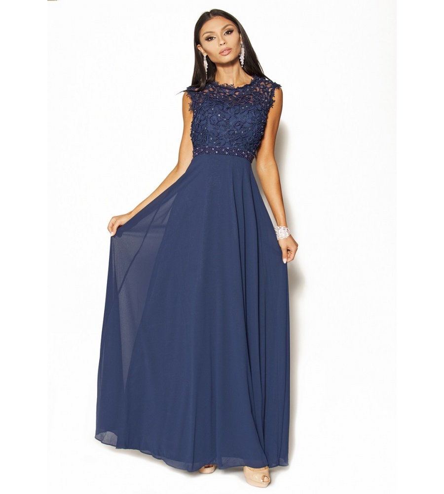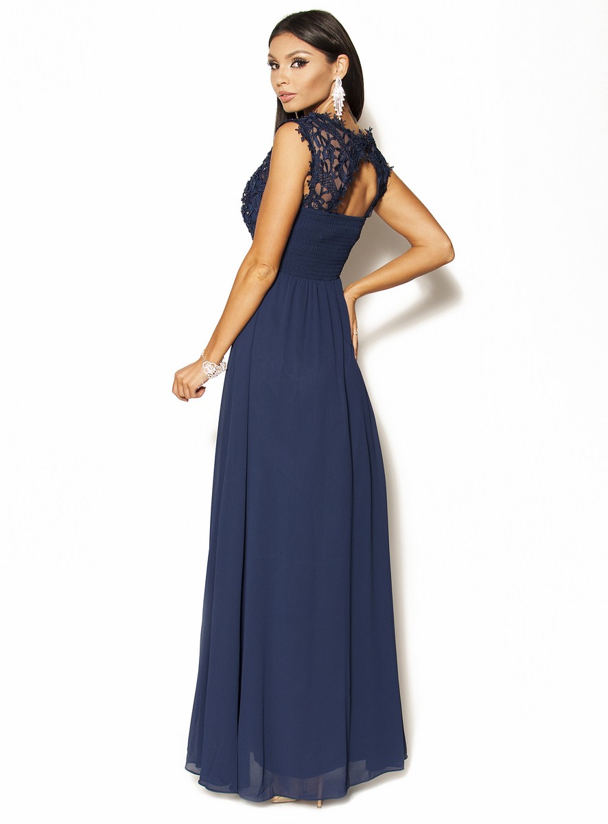 Piękna sukienka Maxi w kolorze granatowym .Góra ozdobiona delikatną koronką, perełkami i porozrzucanymi dżecikami przez co delikatnie się mieni,fason w pasie posiada pas z perełek co daje niepowtarzalny urok, pięknie wycięte koronkowe plecy.Sukienka ma wszyte miseczki.Sukienka rozmiar 36 pasuje również na rozmiar 34, jest malutka dzięki gumce z tyłu spokojnie się dopasuje.Ślicznie i delikatnie się prezentuje