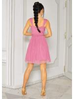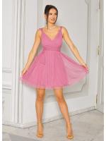 Sukienka mini w kolorze pudrowego różu na cienkich ramiączkach. Kopertowy dekolt świetnie podkreśli kobiece kształty. Model zapinany na suwak.