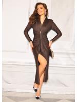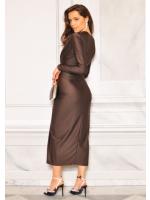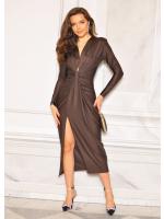 Elegancka sukienka MIDI w kolorze czekoladowym to idealna propozycja dla kobiet ceniących sobie styl i elegancję. Krój pięknie podkreśla figurę. Odważny dekolt w kształcie litery V dodaje uroku. Model posiada poduszki na ramionach. Znakomita na ważne uroczystości czy też sylwestra. Totalny must have w Twojej szafie