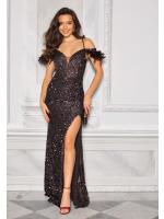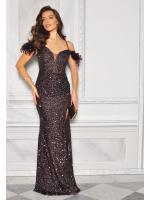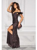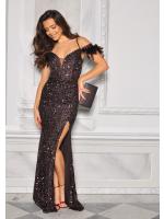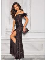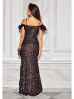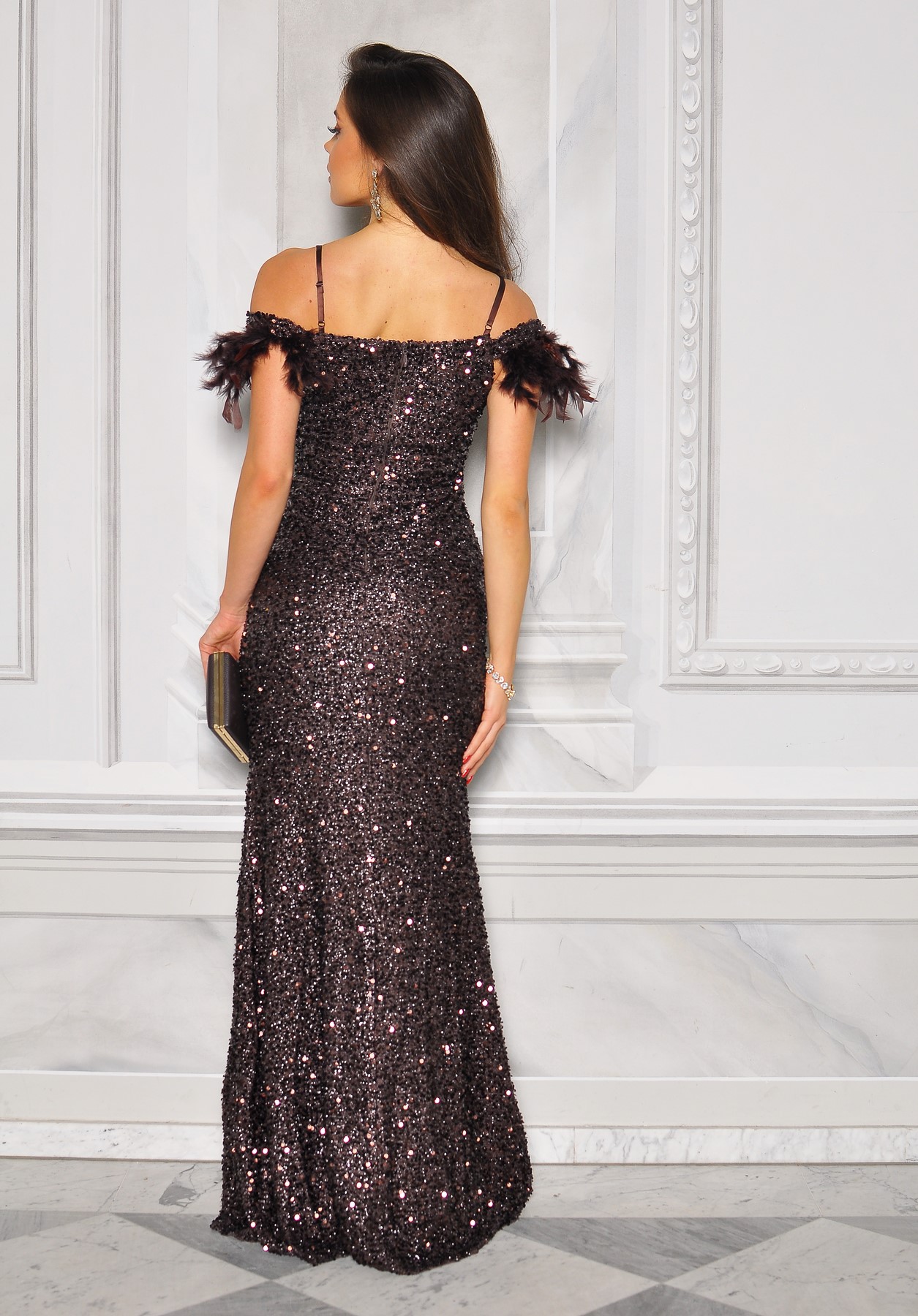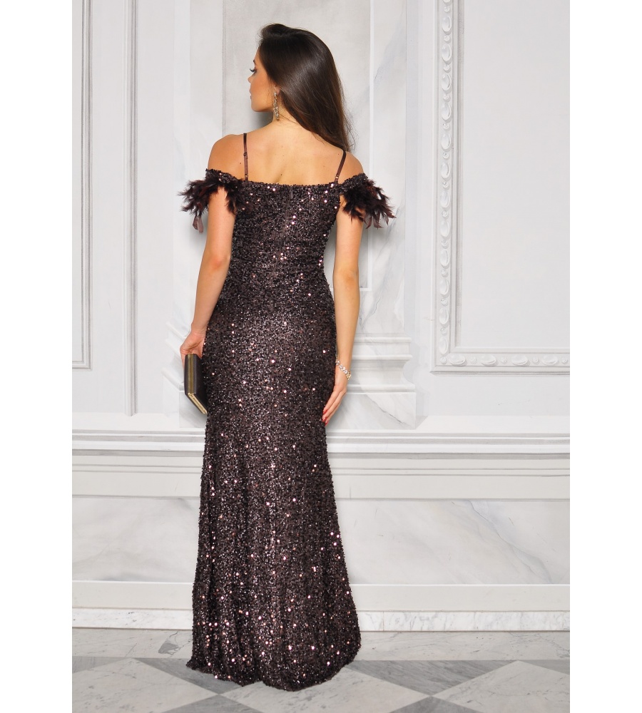 Sukienka czekoladowa maxi cekinowa z marszczeniem po boku i piórkami na ramionach