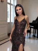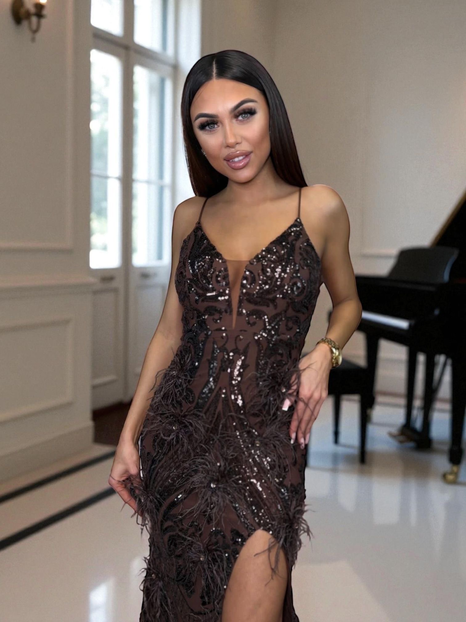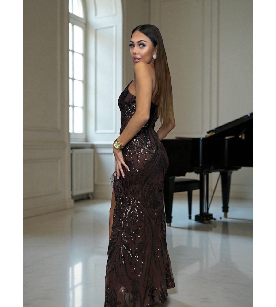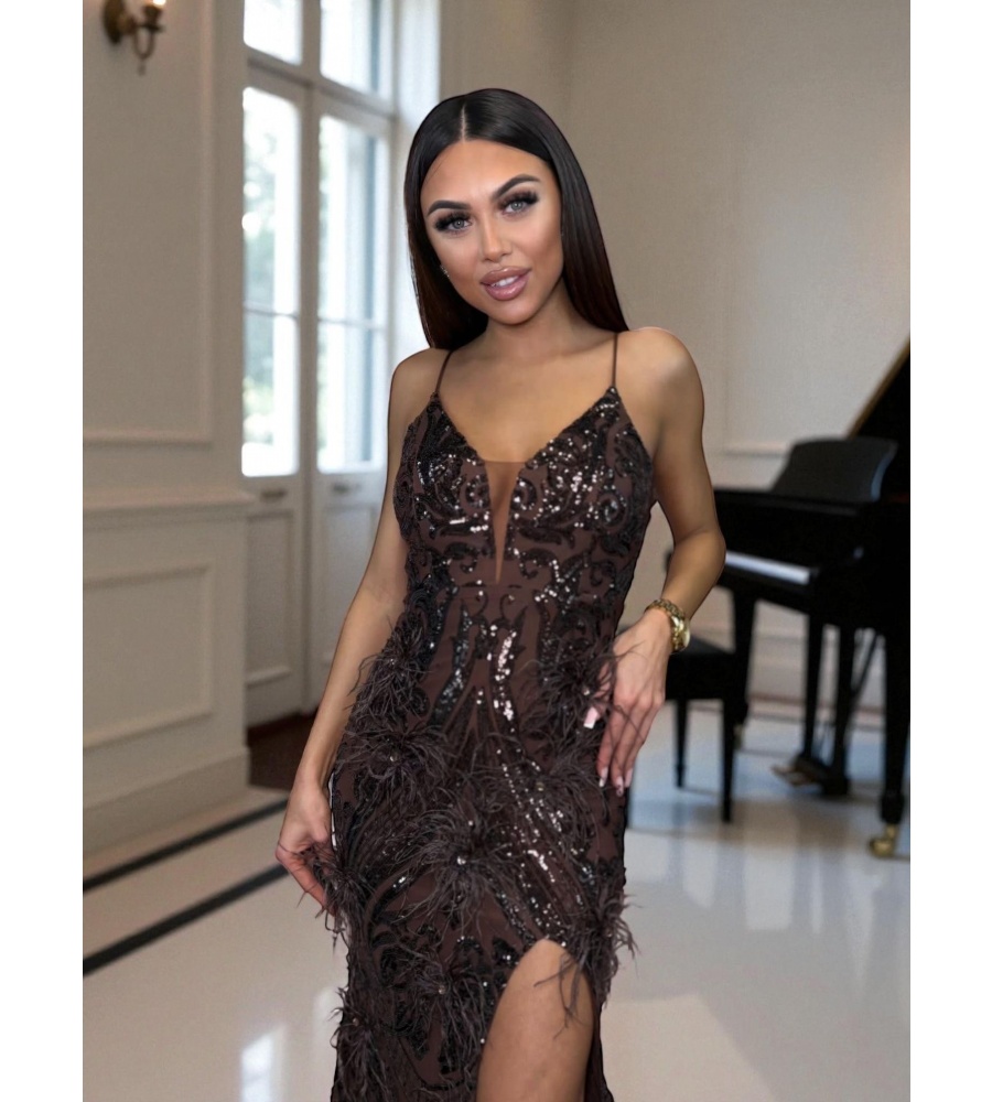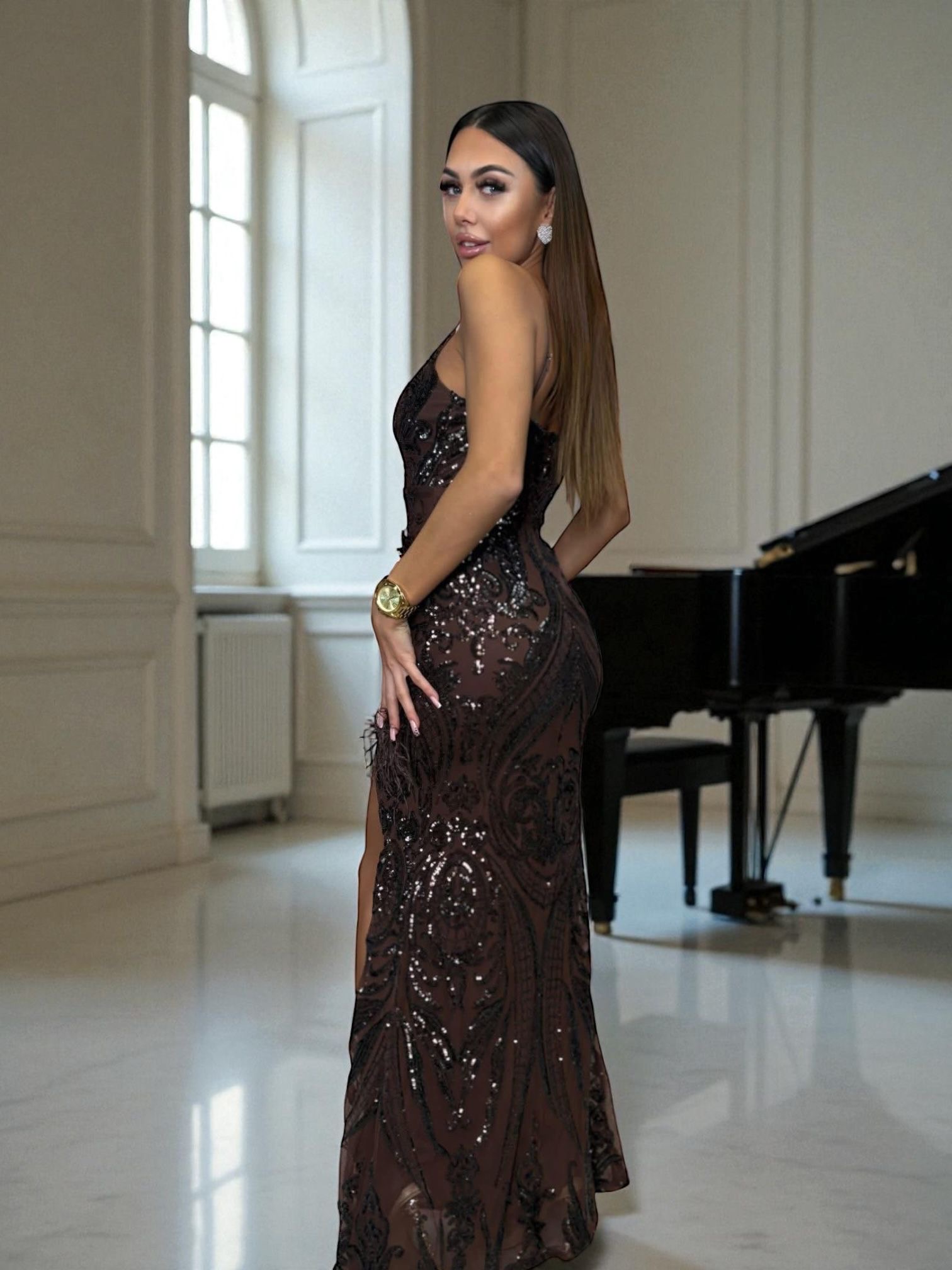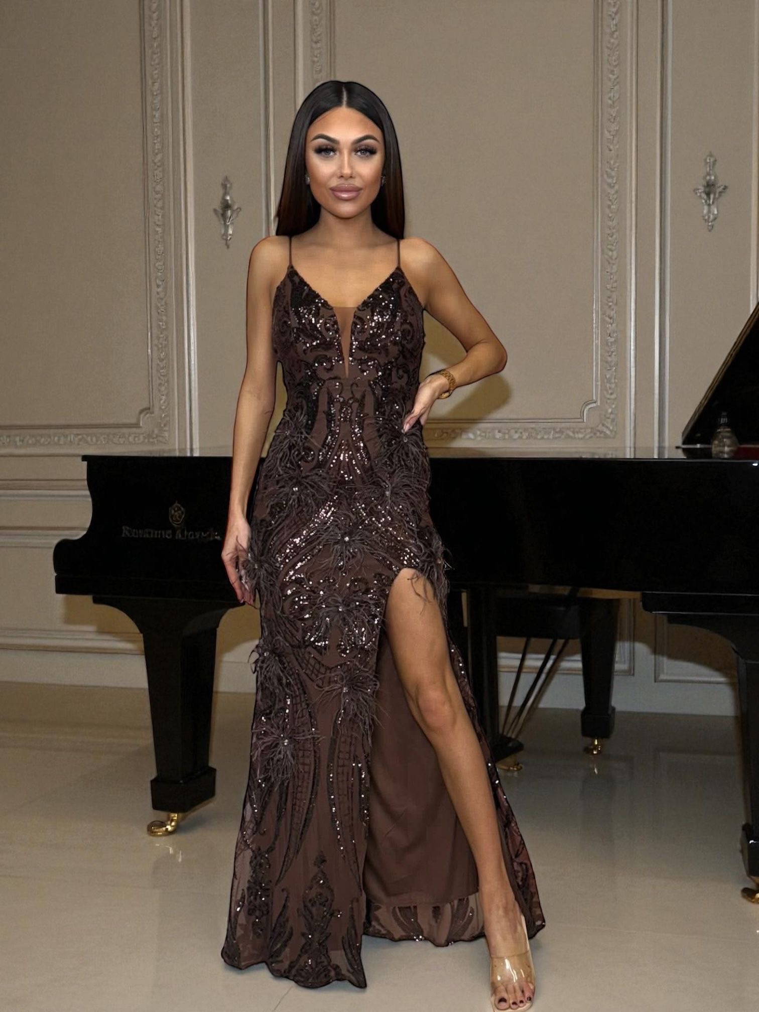 Sukienka Maxi – brązowa, bogato zdobiona, na cienkich ramiączkach