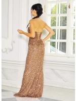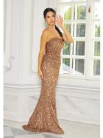 Efektowna sukienka maxi bez ramiączek w kolorze brązowym. Model wyróżnia się cekinami, które pokrywają całą kreację. Regulowany tył sukienki z pewnością przyciągnie wiele spojrzeń, prezentując plecy. Niesamowity fason rybki sprawi, że każda kobieta poczuje się w niej wyjątkowo.