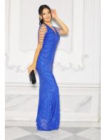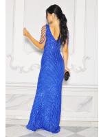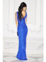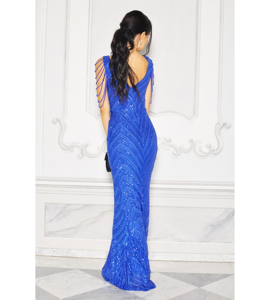 Efektowna sukienka maxi na szerszych ramiączkach zdobiona cekinami w kolorze szafirowym. Model posiada koraliki opadające na ramię przez co wygląda bardziej subtelnie. Zasuwana na kryty zamek z elastyczną podszewką. Niesamowity fason rybki sprawia, że każda kobieta poczuje się w niej wyjątkowo.