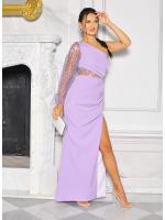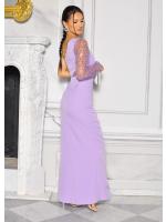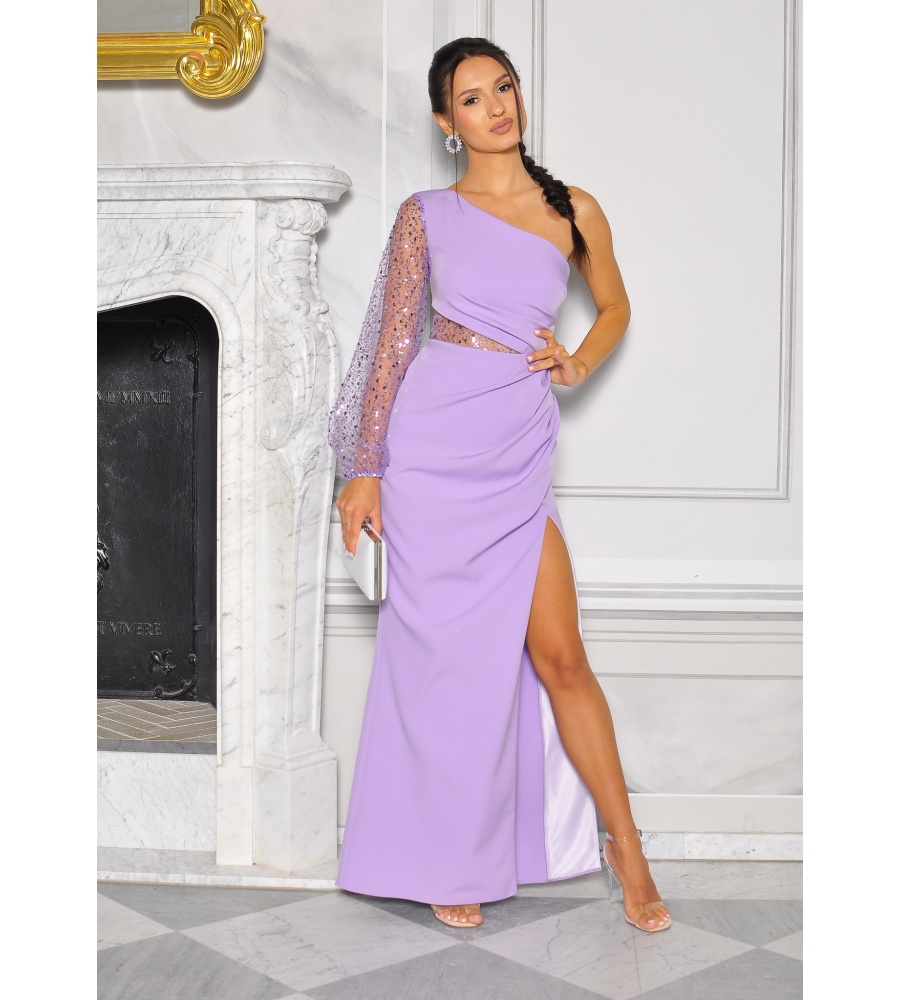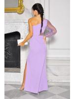 Sukienka posiada piękny cekinowy rękaw. Dopasowana, asymetryczna góra, również posiada cekinową wstawkę. Kreacja pięknie podkreśla figurę. Jest to wprost idealna kreacja na wesele, sylwestra oraz na studniówkę.