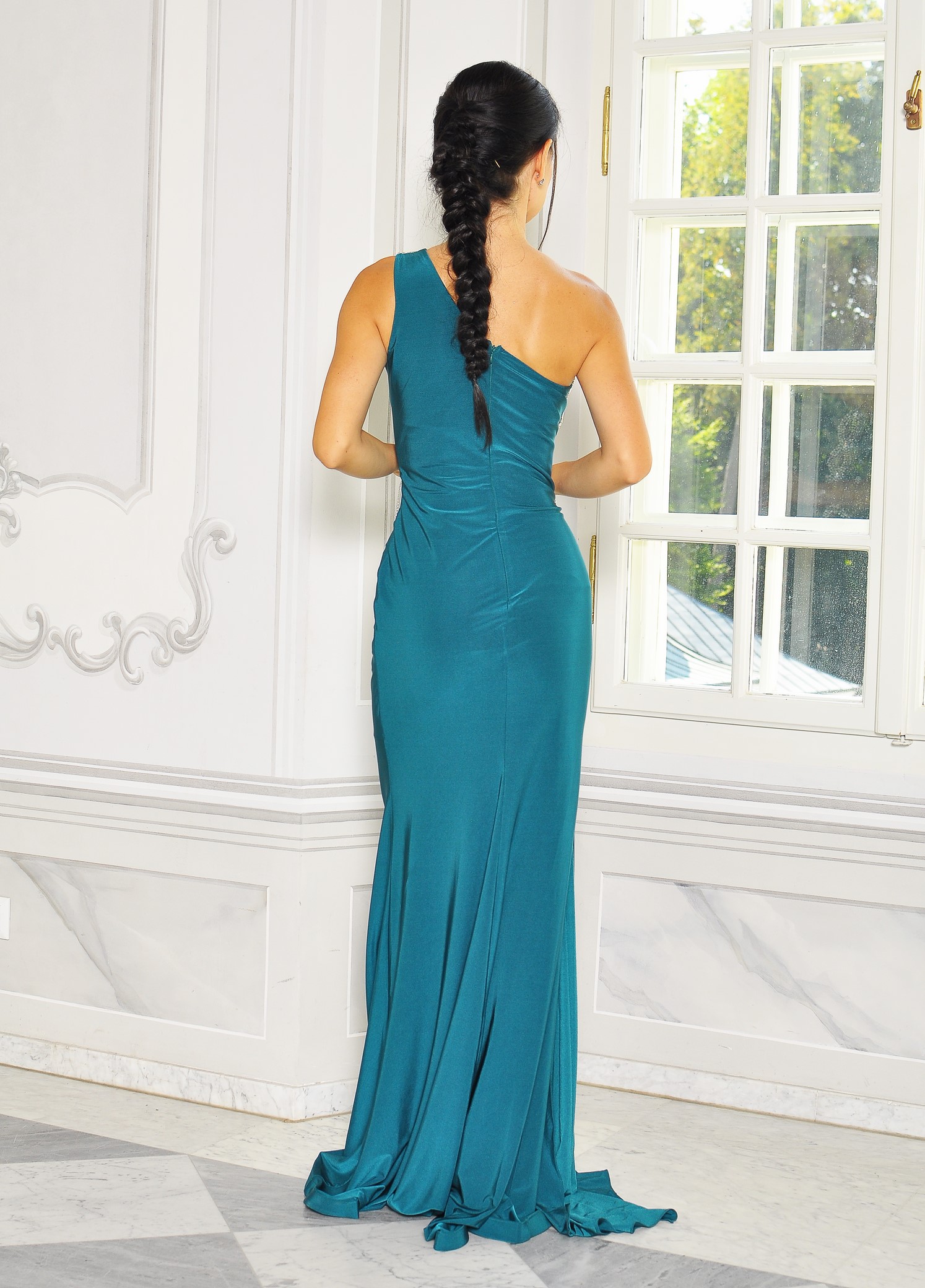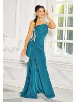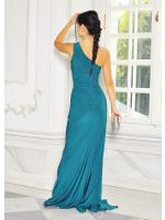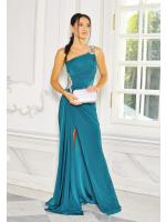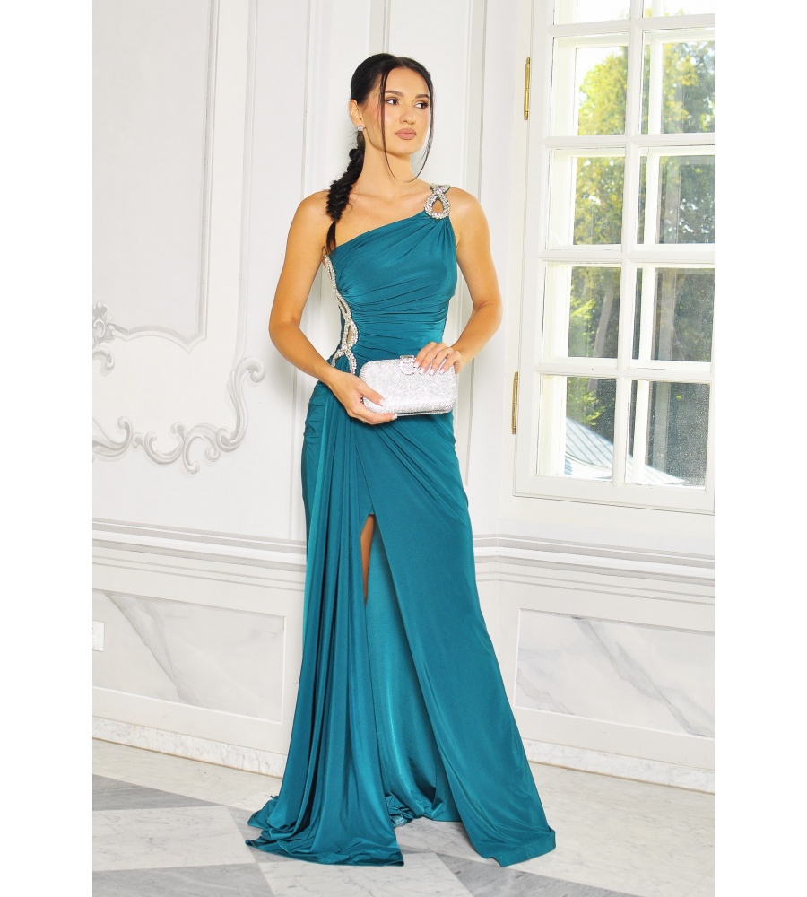 Góra sukienki na jedno ramię zdobiona na ramieniu diamentowym wykończeniem. Zapinana z tyłu na zamek. Sukienka uszyta z lekko rozciągliwego materiału dzięki czemu idealnie dopasowuje się do ciała.Sukienka posiada z przodu wszyte miseczki, dzięki czemu nie trzeba zakładać biustonosza. Idealna na bankiet, wesele lub poprawiny
