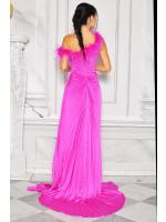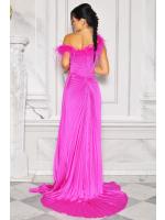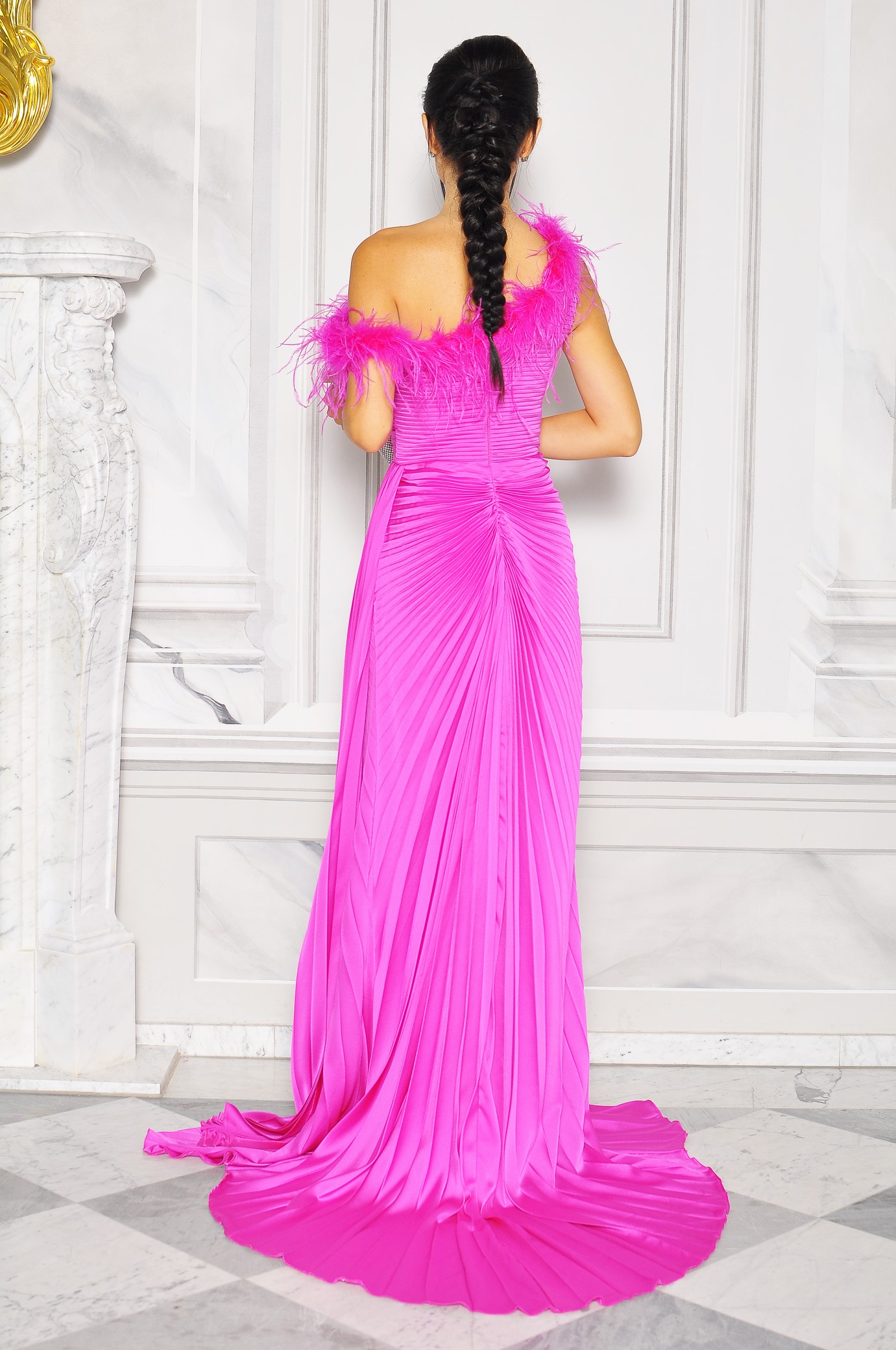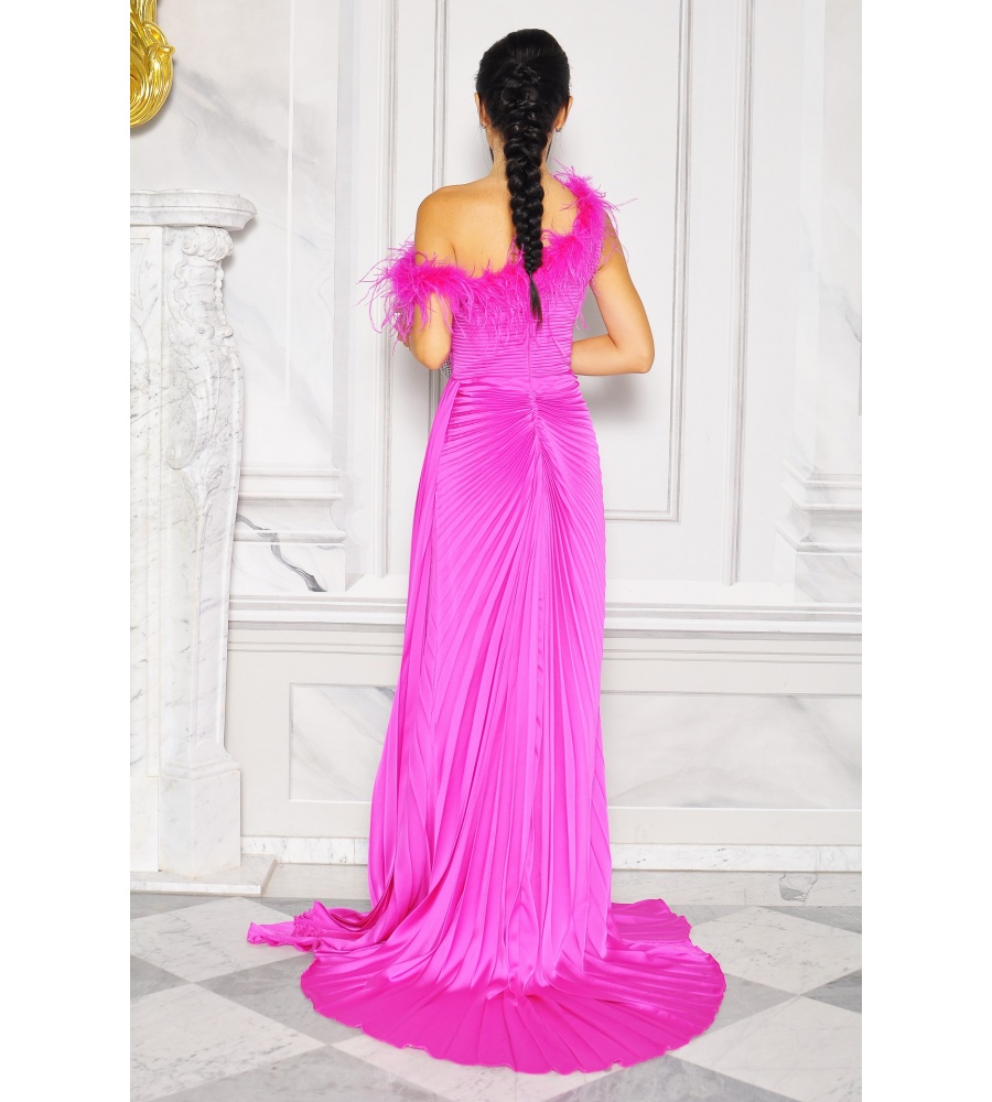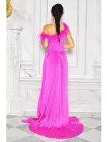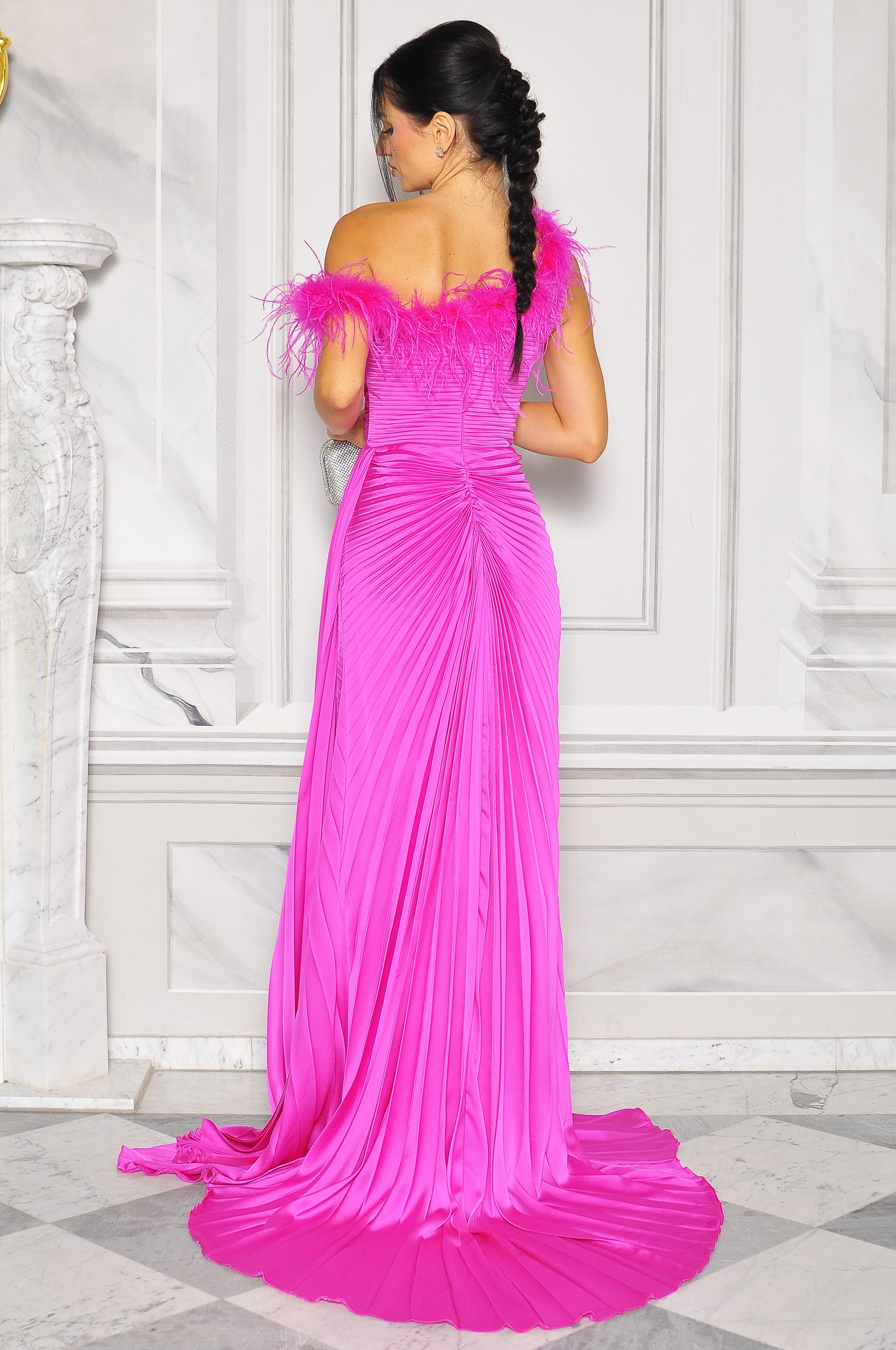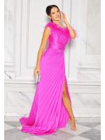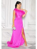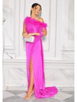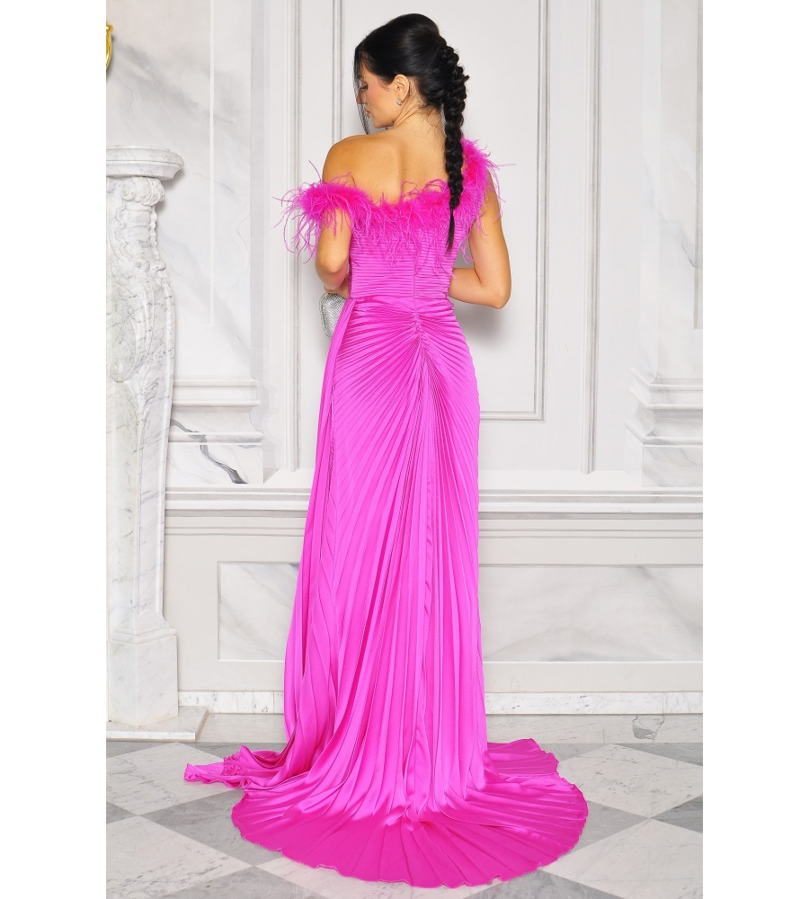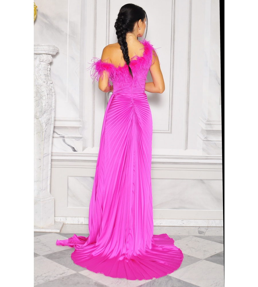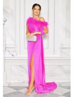 Wyjątkowa sukienka maxi wykończona efektownie piórami przy dekolcie. Dół subtelny, plisowany z rozcięciem na nogę. Ta elegancka i zmysłowa kreacja tworzy wyjątkowy strój na specjalne okazje. Ten model z całą pewnością skupi uwagę innych.
