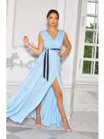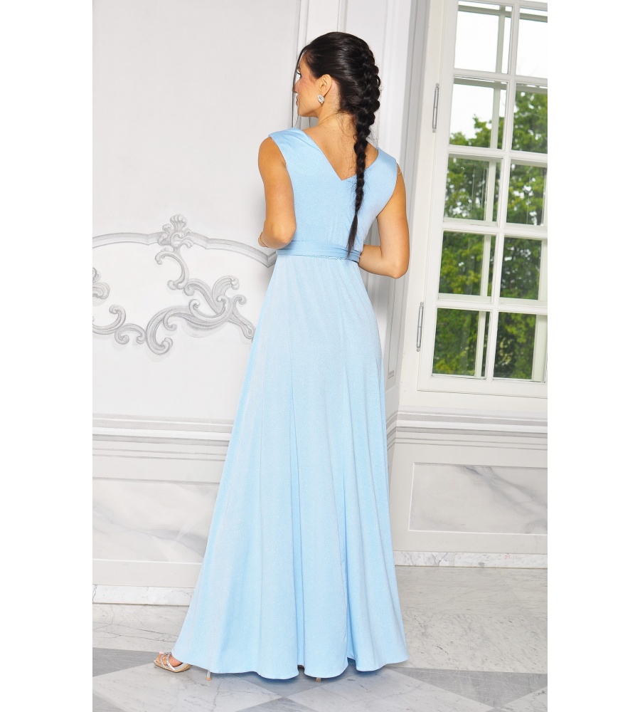 Piękna efektowna sukienka połyskująca na szerszych ramiączkach. Kopertowy dekolt pięknie podkreśli linię biustu, rozcięcie na nogę zapewnia wygodę oraz olśniewający efekt podkreślający kobiece atuty. Ten model nadaje się na różne okazje jak studniówka, wesela lub inne przyjęcia okolicznościowe.Sukienka jest pokryta brokatem, który może się obsypywać, co jest zjawiskiem naturalnym i nie podlega reklamacji