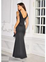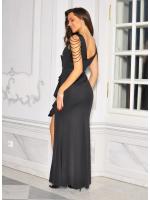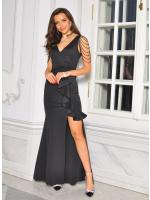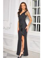 Długa suknia w kolorze czarnym o dopasowanym kroju a'la rybka pięknie podkreślająca talie. Model posiada marszczenie z przodu oraz dekolt w kształcie litery litery V z przodu jak i z tyłu. Efekt dopełnia duże rozcięcie odsłaniające nogę. Dodatkowym atutem są koraliki na ramiączkach. Sukienka idealnie nadaje się na imprezy okolicznościowe.