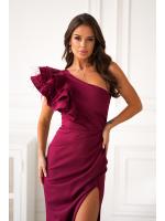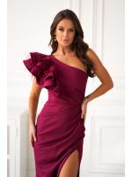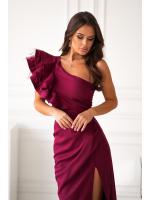 Elegancka sukienka maxi na jedno ramię. Model ozdobiony falbanką i delikatnymi piórkami, które dodają wdzięku. Idealna na wesele lub poprawiny.