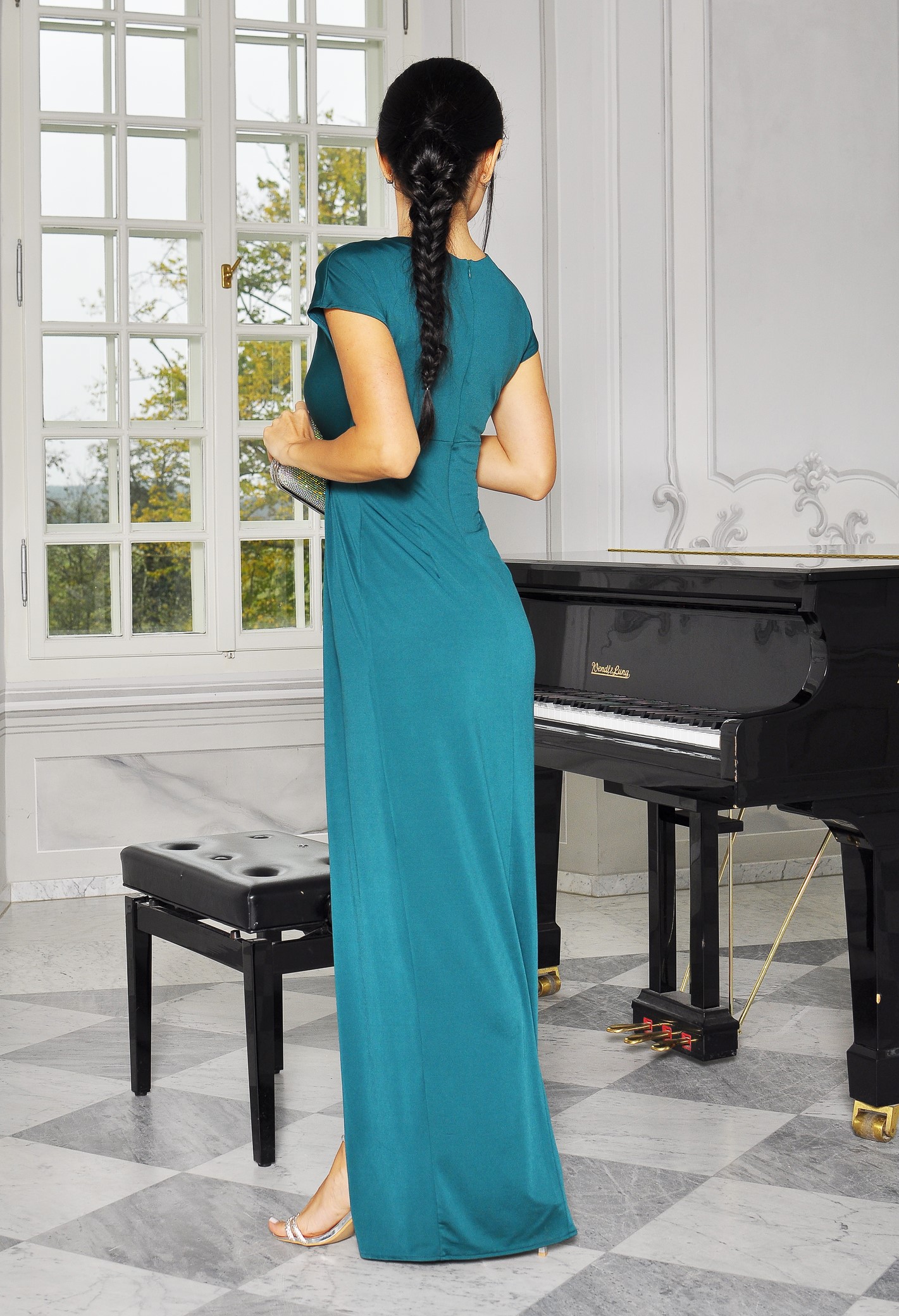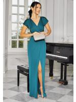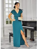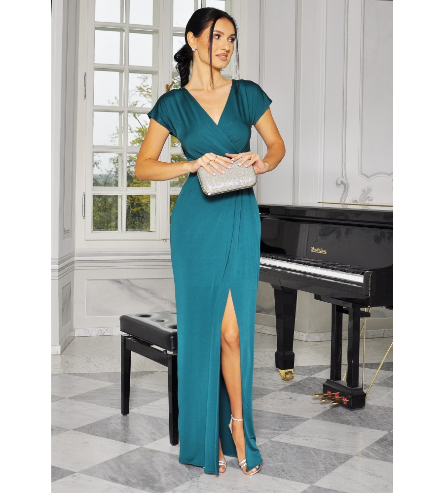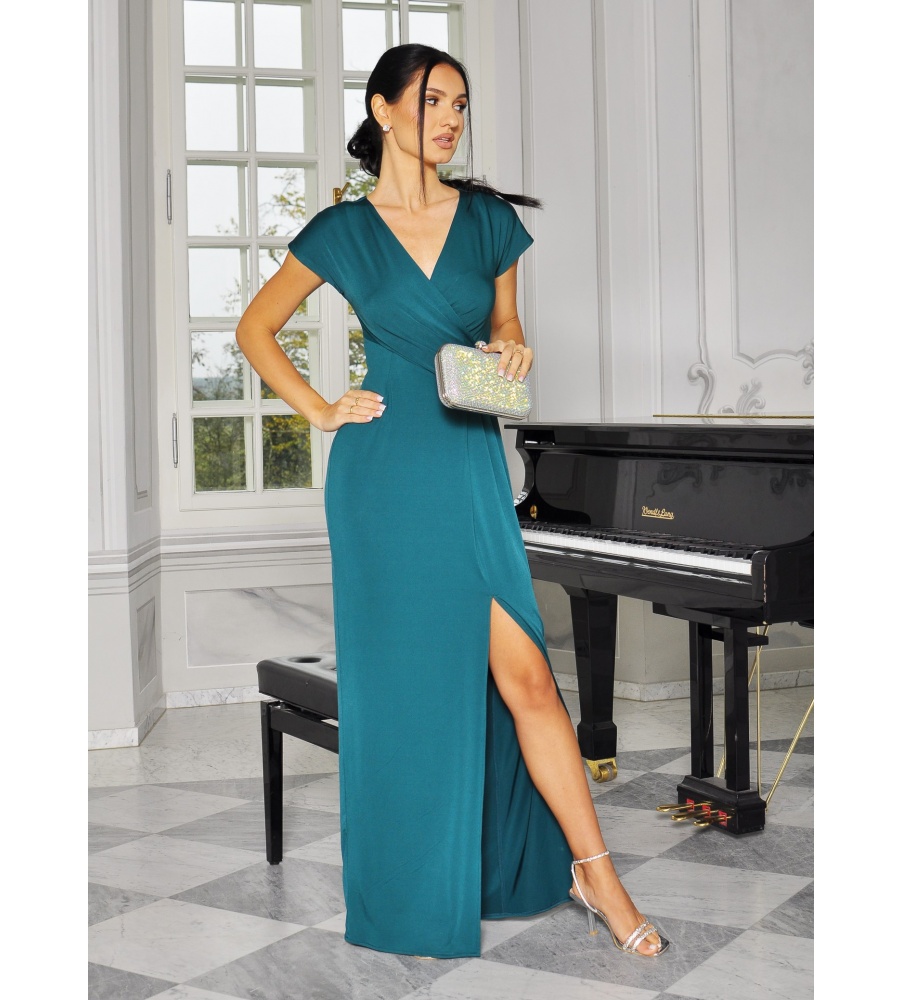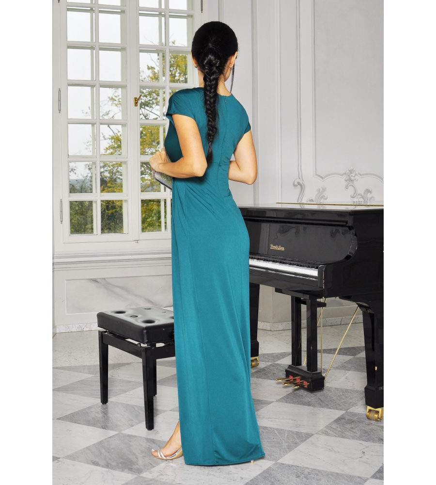 Sukienka maxi w kolorze zielonym długa z ozdobą w talii oraz marszczeniem to bardzo piękny i klasyczny fason sukienki który na pewno sprawdzi się na nie jedną okazję typu, wesela, poprawiny, sylwester ostatki czy inne tego typu okazje. Odcień może się delikatnie różnić sukienka występuje w kolorze butelkowej zieleni.