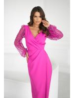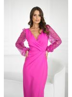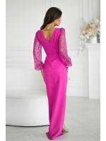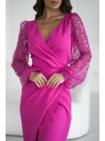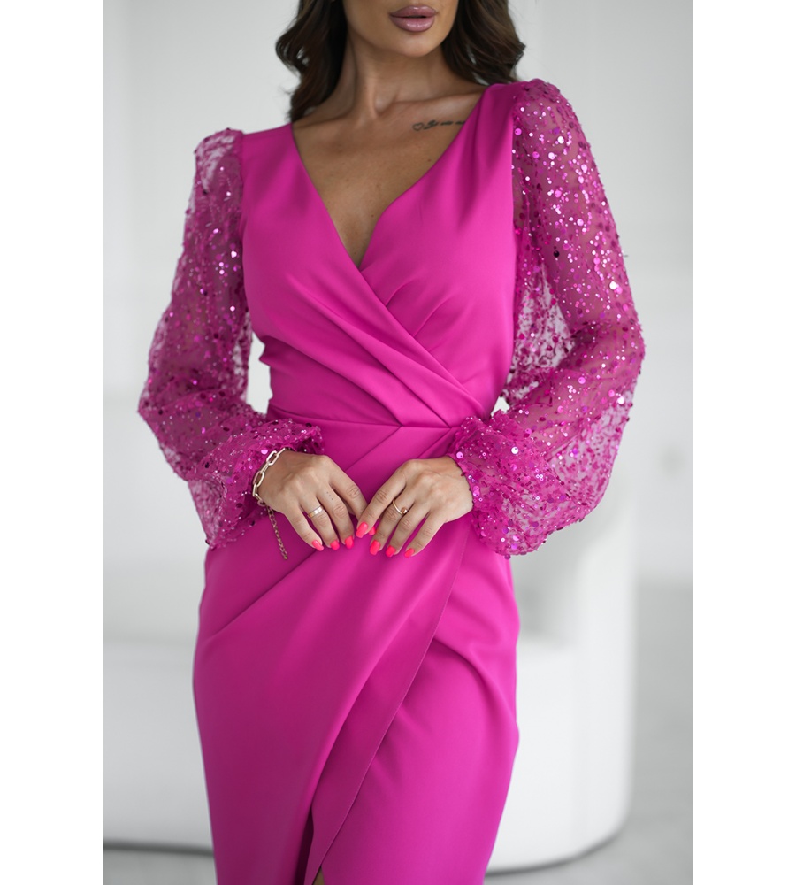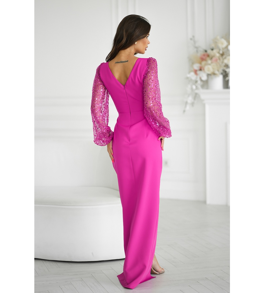 Zjawiskowa kreacja z dwoma cekinowymi rękawami w kolorze fuksji. Idealnie nadaje się na wesele i inne okazje okolicznościowe. Model posiada zamek kryty z tyłu oraz dekolt w kształcie litery V. Podszewka:70%Poliester , 30%Wiskoza