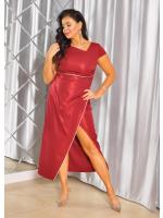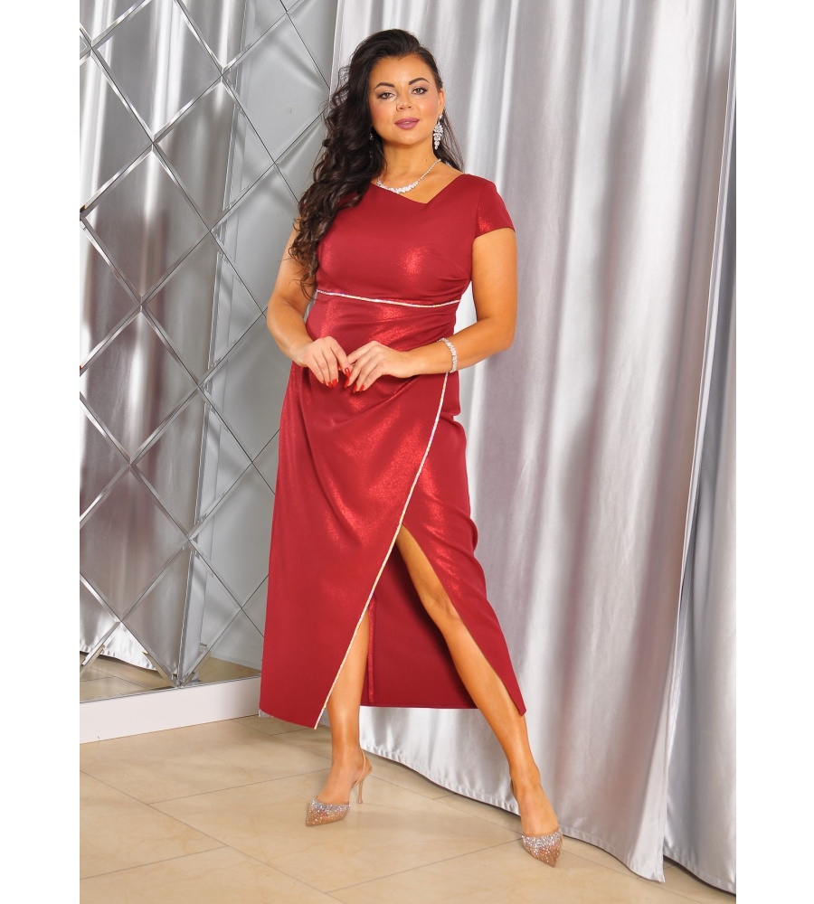 Bordowa sukienka midi z marszczeniem, ozdobnymi dżetami i asymetrycznym dekoltem