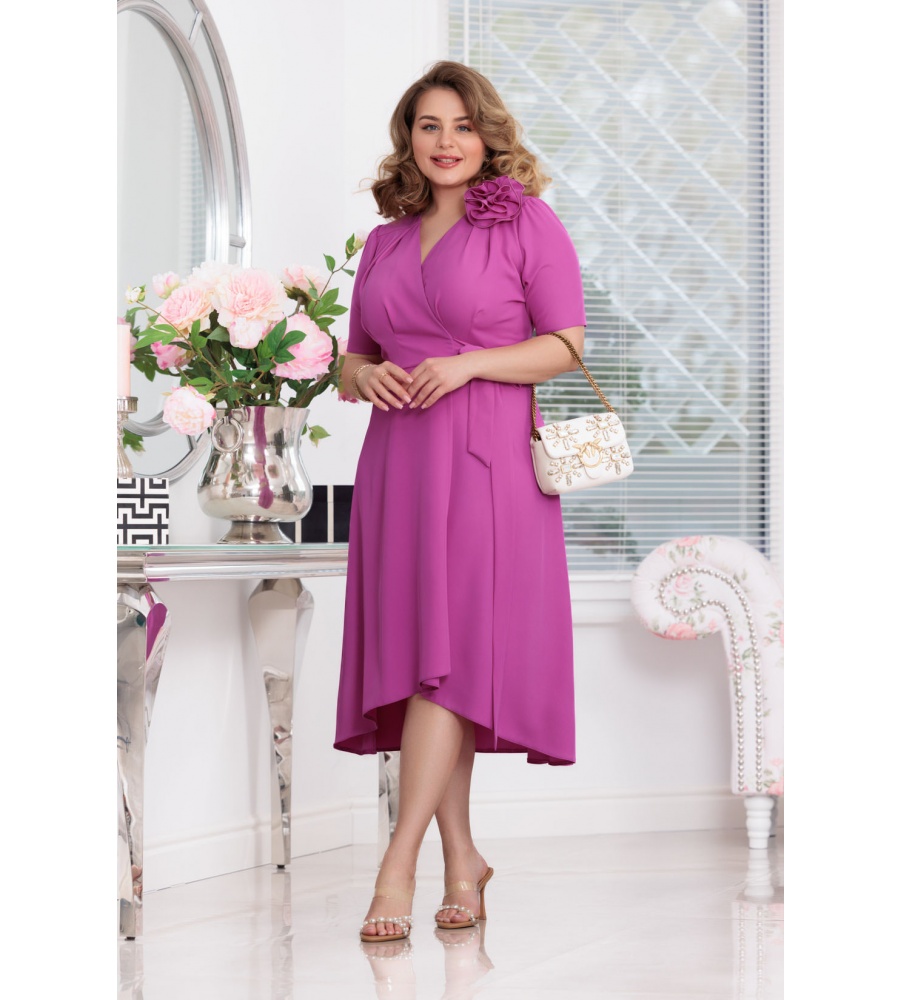 Sukienka asymetryczna z wiązaniem po boku z różą na ramieniu. Sukienka jest bardzo lekka oraz wygodna w noszeniu przez swój delikatny materiał. Idealnie sprawdzi się na różne okazje okolicznościowe.